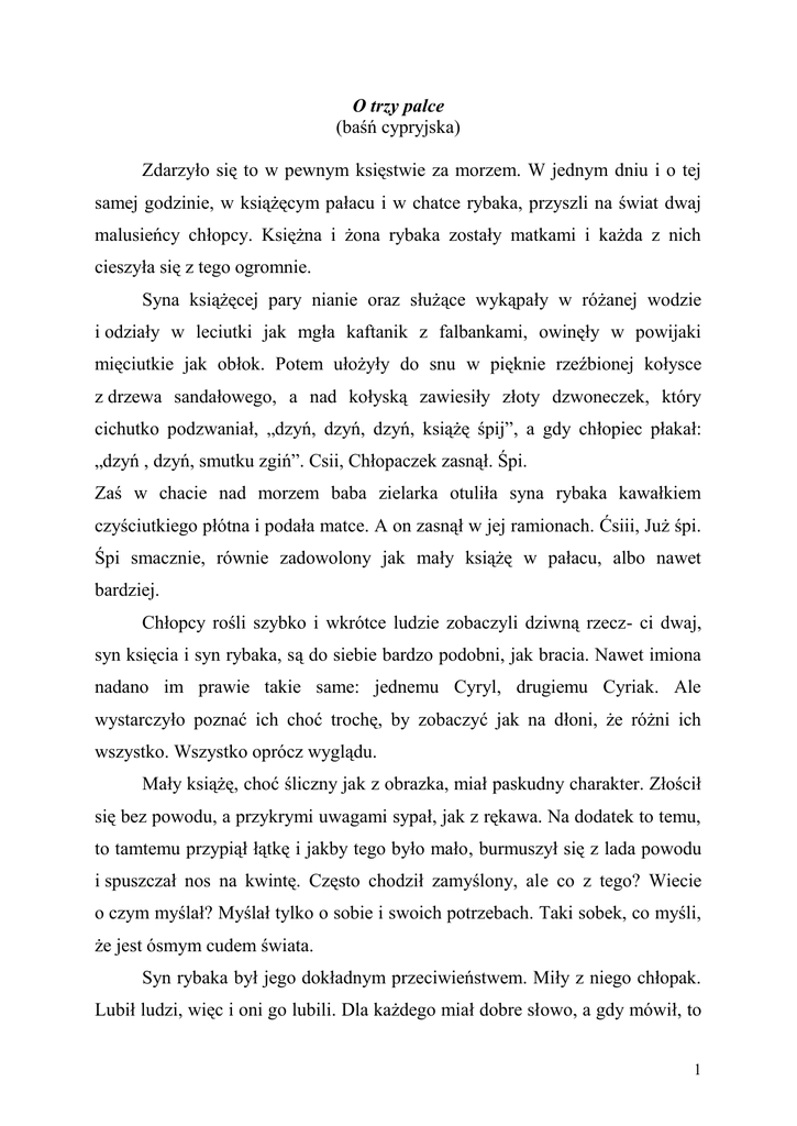 O trzy palce (baśń cypryjska) Zdarzyło się to w pewnym księstwie za morzem. W jednym dniu i o tej samej godzinie, w książęcym pałacu i w chatce rybaka, przyszli na świat dwaj malusieńcy chłopcy. Księżna i żona rybaka zostały matkami i każda z nich cieszyła się z tego ogromnie. Syna książęcej pary nianie oraz służące wykąpały w różanej wodzie i odziały w leciutki jak mgła kaftanik z falbankami, owinęły w powijaki mięciutkie jak obłok. Potem ułożyły do snu w pięknie rzeźbionej kołysce z drzewa sandałowego, a nad kołyską zawiesiły złoty dzwoneczek, który cichutko podzwaniał, „dzyń, dzyń, dzyń, książę śpij”, a gdy chłopiec płakał: „dzyń , dzyń, smutku zgiń”. Csii, Chłopaczek zasnął. Śpi. Zaś w chacie nad morzem baba zielarka otuliła syna rybaka kawałkiem czyściutkiego płótna i podała matce. A on zasnął w jej ramionach. Ćsiii, Już śpi. Śpi smacznie, równie zadowolony jak mały książę w pałacu, albo nawet bardziej. Chłopcy rośli szybko i wkrótce ludzie zobaczyli dziwną rzecz- ci dwaj, syn księcia i syn rybaka, są do siebie bardzo podobni, jak bracia. Nawet imiona nadano im prawie takie same: jednemu Cyryl, drugiemu Cyriak. Ale wystarczyło poznać ich choć trochę, by zobaczyć jak na dłoni, że różni ich wszystko. Wszystko oprócz wyglądu. Mały książę, choć śliczny jak z obrazka, miał paskudny charakter. Złościł się bez powodu, a przykrymi uwagami sypał, jak z rękawa. Na dodatek to temu, to tamtemu przypiął łątkę i jakby tego było mało, burmuszył się z lada powodu i spuszczał nos na kwintę. Często chodził zamyślony, ale co z tego? Wiecie o czym myślał? Myślał tylko o sobie i swoich potrzebach. Taki sobek, co myśli, że jest ósmym cudem świata. Syn rybaka był jego dokładnym przeciwieństwem. Miły z niego chłopak. Lubił ludzi, więc i oni go lubili. Dla każdego miał dobre słowo, a gdy mówił, to 1 jego mowa była „przyprawiona solą”, a znaczy to, że umiał powiedzieć właśnie to, co w tej chwili należało powiedzieć. Nic więcej i nic mniej. Nie był pochlebcą, o nie! Po prostu umiał w każdym znaleźć to, co warte było odnalezienia oi dostrzec dobro. Szanował ludzi i uważał ich za godnych uznania. Gdy ktoś potrzebował wsparcia, wspierał go, gdy pomocy pomagał. Po co dłużej się nad tym rozwodzić- po prostu postępował z ludźmi tak, jak chciałby, by z nim postępowano. Ludzie często mówili o tych dwóch astronomicznych bliźniakach tak: - Patrzcie no, tacy sami, a tacy różnią. Albo: - Ten to jakby miał w środku biało, a tamten czarno! Gdy młody książę dowiedział się, że porównuje się go z synem rybaka, zawrzał gniewem: - Jak oni śmieli! Bezczelni głupcy! JA i ten…. Jak mu tam? JA! JA! i taki prostak! Już JA im wszystkim pokażę, już JA ich nauczę! A temu… temu, jak mu tam…, pokażę, gdzie raki zimują. Zdarzyło się kiedyś, że obaj wędrowali brzegiem morza z przeciwnych stron. Jeden z lewa na prawo, drugi z prawa na lewo. Szli zamyśleni, a gdy podnieśli głowy stanęli jak wryci: książę zobaczył rybaka, rybak zaś księcia. Stali obok siebie o krok, książę patrzył wrogo na rybaka, rybak zaś na księcia z zaciekawieniem. - Z drogi!- krzyknął książę i podniósł rękę do uderzenia. Cyryl uchylił się prze ciosem, spojrzał pod nogi i… zobaczyłoś połyskującego w słońcu. Podniósł, ogląda, toż to pióro ptaka, złote! Szczerozłote! Ale i książę Cyriak je zobaczył. _ Służba, służba!- krzyczy- Do mnie, do mnie, niezguły jedne. Trutnie! Co się tak guzdrzecie?! Nieudacznicy! No już, już bez tłumaczeń, bo szkoda czasu. Mojego cennego czasu. Pojmać tego oberwańca żywo i wtrącić do więzienia… To złodziej! - Nie jestem złodziejem- oburzył się Cyryl. 2 - Patrzcie go, nie jest złodziejem! A to co trzymasz w ręce, to co?- zakpił książę. - Ptasie pióro, znalazłem je. - Złote pióro! Nie udawaj, że nie wiesz, że wszystko, co poddany książęcy znajdzie na książęcej ziemi należy do księcia! Odbierzcie mu to pióro! - Ależ ja sam z przyjemnością oddam to pióro, bardzo proszę. Słysząc tak grzeczną odpowiedź, książę rozzłościł się jeszcze bardziej. - I tak wtrącić go do więzienia. I nie dawać mu jeść. Już dwaj halabardnicy prowadzą chłopaka do zamkowego lochu, gdy książę nagle rozmyślił się. - Stać!- krzyczy.- Z powrotem do mnie! Szybciej, ofermy! - Stać, iść, wracać…- szepnął jeden ze strażników do drugiego. - Bo z naszym księciem już tak jest- odszepnął mu tamten. - Jak? - Ano tak, jak to mówią: na dwoje babka wróżyła, albo jeszcze gorzej. - Hi, hi- zachichotał cicho. - Co to za szepty?!- rozdarł się książę- Spiskujecie? - Więzień doprowadzony, według rozkazu waszej książęcej mości- zawołali chórem strażnicy i stuknęli obcasami, aż ostrogi zadźwięczały. -No!- powiedział książę podejrzliwie, a potem ciągnął, nie patrząc w stronę Cyryla.- Powiedzcie temu oberwańcowi, że jeśli nie chce stracić głowy, niech mi do jutra rana przyniesie tego ptaka, który zgubił złote pióro. - Jego książęca mość rozkazał…- powiedzieli strażnicy, ale nie dokończyli, bo Cyryl im przerwał. - Nie kończcie, bo szkoda czasu i przekażcie jego książęcej mości, że już idę. No może za chwilę, bo muszę się przygotować do drogi- ukłonił się księciu, obrócił na pięcie i odszedł. Książę zbaraniał. - Niech się śpieszy…- bąknął do strażników ni w pięć ni w dziewięć, i zadzierając wysoko nosa dla dodania sobie pewności, ruszył do pałacu. 3 „Gdzie szukać tego ptaka? A nawet jak znajdę, to jak go schwytać?” rozmyślał Cyryl po drodze do chaty. Ale chyba coś wymyślił, bo oczy mu rozbłysły i uśmiechnął się wesoło. Nie zabawił długo w chacie, czegoś tam szukał, coś szykował i po chwili wyszedł gotów do drogi. Ruszył