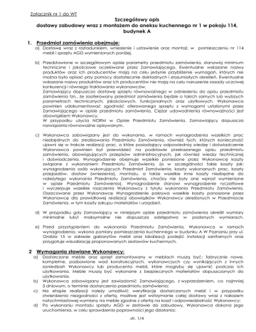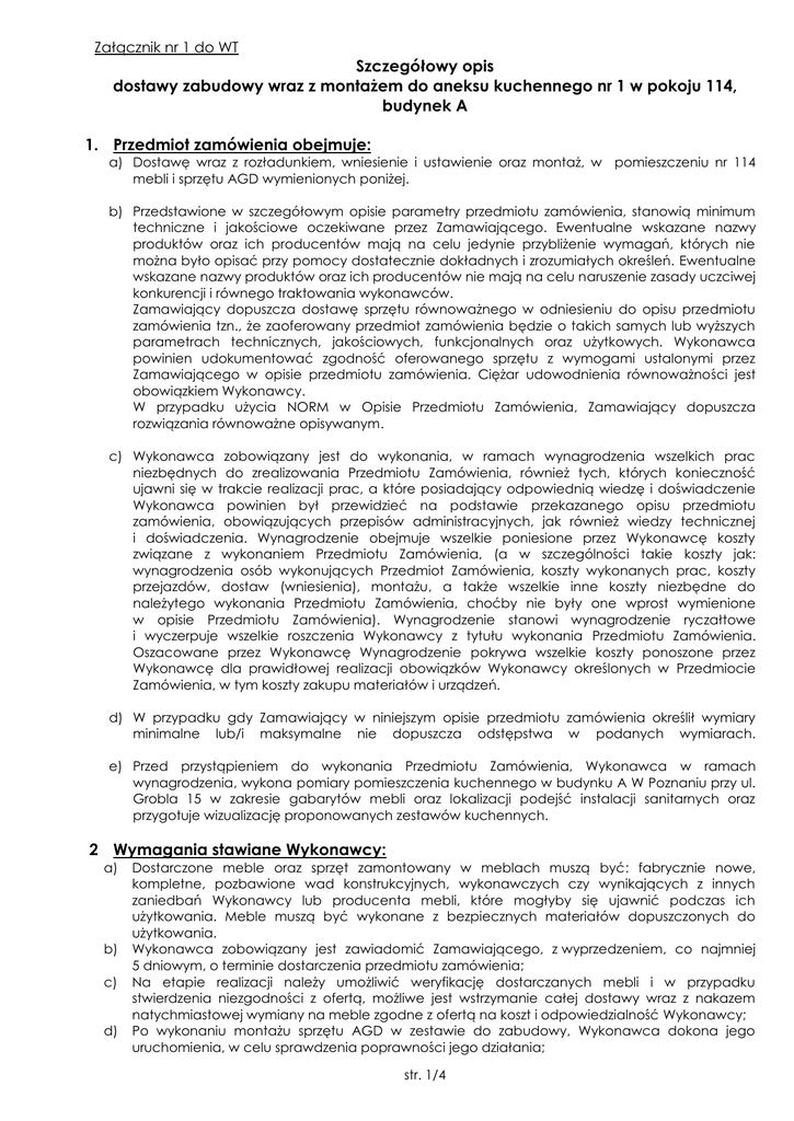 Załącznik nr 1 do WT Szczegółowy opis dostawy zabudowy wraz z montażem do aneksu kuchennego nr 1 w pokoju 114, budynek A 1. Przedmiot zamówienia obejmuje: a) Dostawę wraz z rozładunkiem, wniesienie i ustawienie oraz montaż, w pomieszczeniu nr 114 mebli i sprzętu AGD wymienionych poniżej. b) Przedstawione w szczegółowym opisie parametry przedmiotu zamówienia, stanowią minimum techniczne i jakościowe oczekiwane przez Zamawiającego. Ewentualne wskazane nazwy produktów oraz ich producentów mają na celu jedynie przybliżenie wymagań, których nie można było opisać przy pomocy dostatecznie dokładnych i zrozumiałych określeń. Ewentualne wskazane nazwy produktów oraz ich producentów nie mają na celu naruszenie zasady uczciwej konkurencji i równego traktowania wykonawców. Zamawiający dopuszcza dostawę sprzętu równoważnego w odniesieniu do opisu przedmiotu zamówienia tzn., że zaoferowany przedmiot zamówienia będzie o takich samych lub wyższych parametrach technicznych, jakościowych, funkcjonalnych oraz użytkowych. Wykonawca powinien udokumentować zgodność oferowanego sprzętu z wymogami ustalonymi przez Zamawiającego w opisie przedmiotu zamówienia. Ciężar udowodnienia równoważności jest obowiązkiem Wykonawcy. W przypadku użycia NORM w Opisie Przedmiotu Zamówienia, Zamawiający dopuszcza rozwiązania równoważne opisywanym. c) Wykonawca zobowiązany jest do wykonania, w ramach wynagrodzenia wszelkich prac niezbędnych do zrealizowania Przedmiotu Zamówienia, również tych, których konieczność ujawni się w trakcie realizacji prac, a które posiadający odpowiednią wiedzę i doświadczenie Wykonawca powinien był przewidzieć na podstawie przekazanego opisu przedmiotu zamówienia, obowiązujących przepisów administracyjnych, jak również wiedzy technicznej i doświadczenia. Wynagrodzenie obejmuje wszelkie poniesione przez Wykonawcę koszty związane z wykonaniem Przedmiotu Zamówienia, (a w szczególności takie koszty jak: wynagrodzenia osób wykonujących Przedmiot Zamówienia, koszty wykonanych prac, koszty przejazdów, dostaw (wniesienia), montażu, a także wszelkie inne koszty niezbędne do należytego wykonania Przedmiotu Zamówienia, choćby nie były one wprost wymienione w opisie Przedmiotu Zamówienia). Wynagrodzenie stanowi wynagrodzenie ryczałtowe i wyczerpuje wszelkie roszczenia Wykonawcy z tytułu wykonania Przedmiotu Zamówienia. Oszacowane przez Wykonawcę Wynagrodzenie pokrywa wszelkie koszty ponoszone przez Wykonawcę dla prawidłowej realizacji obowiązków Wykonawcy określonych w Przedmiocie Zamówienia, w tym koszty zakupu materiałów i urządzeń. d) W przypadku gdy Zamawiający w niniejszym opisie przedmiotu zamówienia określił wymiary minimalne lub/i maksymalne nie dopuszcza odstępstwa w podanych wymiarach. e) Przed przystąpieniem do wykonania Przedmiotu Zamówienia, Wykonawca w ramach wynagrodzenia, wykona pomiary pomieszczenia kuchennego w budynku A W Poznaniu przy ul. Grobla 15 w zakresie gabarytów mebli oraz lokalizacji podejść instalacji sanitarnych oraz przygotuje wizualizację proponowanych zestawów kuchennych. 2 Wymagania stawiane Wykonawcy: a) b) c) d) Dostarczone meble oraz sprzęt zamontowany w meblach muszą być: fabrycznie nowe, kompletne, pozbawione wad konstrukcyjnych, wykonawczych czy wynikających z innych zaniedbań Wykonawcy lub producenta mebli, które mogłyby się ujawnić podczas ich użytkowania. Meble muszą być wykonane z bezpiecznych materiałów dopuszczonych do użytkowania. Wykonawca zobowiązany jest zawiadomić Zamawiającego, z wyprzedzeniem, co najmniej 5 dniowym, o terminie dostarczenia przedmiotu zamówienia; Na etapie realizacji należy umożliwić weryfikację dostarczanych mebli i w przypadku stwierdzenia niezgodności z ofertą, możliwe jest wstrzymanie całej dostawy wraz z nakazem natychmiastowej wymiany na meble zgodne z ofertą na koszt i odpowiedzialność Wykonawcy; Po wykonaniu montażu sprzętu AGD w zestawie do zabudowy, Wykonawca dokona jego uruchomienia, w celu sprawdzenia poprawności jego działania; str. 1/4 e) Wraz ze sprzętem AGD Wykonawca zobowiązany jest dostarczyć: instrukcje obsługi w języku polskim lub przetłumaczone na język polski, dokumentację techniczną - jeśli przedmiot zamówienia taką posiada. 3 Wymagania jakościowe a) b) c) d) e) 4 Zamawiający wymaga, aby użyte do produkcji mebli płyty wiórowe były obustronnie laminowane, w klasie higieniczności E1 o podwyższonej trwałości, w klasie odporności na ścieranie 3A zgodnie z normą EN 14322, Kolory poszczególnych elementów mebli zostaną wybrane przez Zamawiającego z próbnika płyt meblowych, przedstawionego przez wybranego oferenta. Pozostałe elementy zostaną wybrane spośród co najmniej trzech propozycji kolorystycznych a w przypadku uchwytów 3 różnych kształtów i wielkości. Wymaga się również dołączenie kart sprzętu AGD, który zostanie dostarczony. Krzesła kuchenne powinny posiadać dokumenty potwierdzające zgodność z normami: EN 13761 w zakresie wymiarów i wytrzymałości, EN 1022 w zakresie stabilności. Wymagania dotyczące gwarancji Gwarancja na wszystkie meble wraz z wyposażeniem – 24 miesiące Gwarancja na sprzęt AGD – 24 miesiące a) Wszystkie naprawy gwarancyjne wykonywane są w całości na koszt Wykonawcy; b) Czas reakcji serwisu na przyjęte zgłoszenie uszkodzenia, nie dłużej niż 72 godziny od chwili zgłoszenia w dni robocze; c) Maksymalny czas usunięcia uszkodzenia nie dłużej niż 14 dni roboczych; d) W przypadku konieczności wymiany mebli bądź sprzętu, Wykonawca zobowiązany jest w każdym wypadku dostarczyć meble/sprzęt fabrycznie nowy, o parametrach technicznych nie gorszych od mebli/sprzętu podlegającego wymianie; e) W przypadku naprawy gwarancyjnej poza siedzibą Zamawiającego wszelkie koszty z tym związane ponosi Wykonawca. f) Przeglądy serwisowe zgodnie z zaleceniami producenta, bezpłatni
