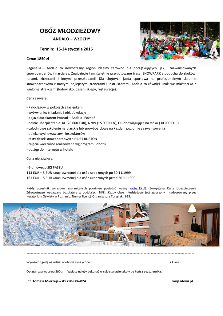 OBÓZ MŁODZIEŻOWY ANDALO – WŁOCHY Termin: 15-24 stycznia 2016 Cena: 1850 zł Paganella - Andalo to nowoczesny region idealny zarówno dla początkujących, jak i zaawansowanych snowboarder’ów i narciarzy. Znajdziecie tam świetnie przygotowane trasy, SNOWPARK z poduchą do skoków, railami, kickerami i innymi przeszkodami! Dla chętnych jazda sportowa na profesjonalnym slalomie snowboardowym z naszymi najlepszymi trenerami i instruktorami. Andalo to również urokliwe miasteczko z wieloma atrakcjami (lodowisko, basen, sklepy, restauracje). Cena zawiera: - 7 noclegów w pokojach z łazienkami - wyżywienie: śniadania i obiadokolacje - dojazd autokarem Poznań – Andalo -Poznań - pełnie ubezpieczenie: KL (20 000 EUR), NNW (15 000 PLN), OC obowiązujące na stoku (30 000 EUR) - całodniowe szkolenie narciarskie lub snowboardowe na każdym poziomie zaawansowania - opieka wychowawców i instruktorów - testy desek snowboardowych RIDE i BURTON - zajęcia wieczorne realizowane wg programu obozu - dostęp do Internetu w hotelu Cena nie zawiera: - 6-dniowego SKI PASSU 113 EUR + 5 EUR kaucji zwrotnej dla osób urodzonych po 30.11.1999 161 EUR + 5 EUR kaucji zwrotnej dla osób urodzonych przed 30.11.1999 Każdy uczestnik wyjazdów zagranicznych powinien posiadać ważną kartę EKUZ (Europejska Karta Ubezpieczenia Zdrowotnego wydawana bezpłatnie w oddziałach NFZ). Każdy obóz młodzieżowy jest zgłoszony i nadzorowany przez Kuratorium Oświaty w Poznaniu. Numer licencji Organizatora Turystyki: 623. ……………………………………………………………………………………………………………………………………………………………………………………………… Wyrażam zgodę na udział w obozie syna /córki …………………………………………………………………………………………z klasy……………… Opłata rezerwacyjna 500 zł. Wpłatę należy dokonać w sekretariacie szkoły do końca października. Inf. Tomasz Mierzejewski 790-606-024 wyjazdowi.pl