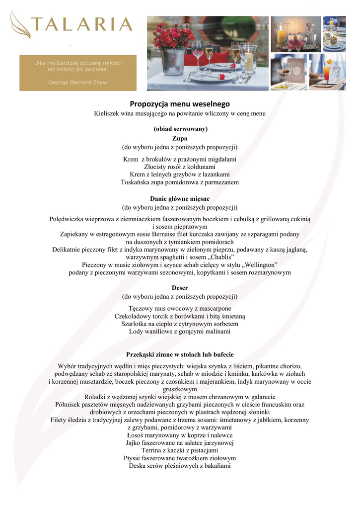 Propozycja menu weselnego Kieliszek wina musującego na powitanie wliczony w cenę menu (obiad serwowany) Zupa (do wyboru jedna z poniższych propozycji) Krem z brokułów z prażonymi migdałami Złocisty rosół z kołdunami Krem z leśnych grzybów z łazankami Toskańska zupa pomidorowa z parmezanem Danie główne mięsne (do wyboru jedna z poniższych propozycji) Polędwiczka wieprzowa z ziemniaczkiem faszerowanym boczkiem i cebulką z grillowaną cukinią i sosem pieprzowym Zapiekany w estragonowym sosie Bernaise filet kurczaka zawijany ze szparagami podany na duszonych z tymiankiem pomidorach Delikatnie pieczony filet z indyka marynowany w zielonym pieprzu, podawany z kaszą jaglaną, warzywnym spaghetti i sosem „Chablis” Pieczony w musie ziołowym i szynce schab cielęcy w stylu „Wellington” podany z pieczonymi warzywami sezonowymi, kopytkami i sosem rozmarynowym Deser (do wyboru jedna z poniższych propozycji) Tęczowy mus owocowy z mascarpone Czekoladowy torcik z borówkami i bitą śmietaną Szarlotka na ciepło z cytrynowym sorbetem Lody waniliowe z gorącymi malinami Przekąski zimne w stołach lub bufecie Wybór tradycyjnych wędlin i mięs pieczystych: wiejska szynka z liściem, pikantne chorizo, podwędzany schab ze staropolskiej marynaty, schab w miodzie i kminku, karkówka w ziołach i korzennej musztardzie, boczek pieczony z czosnkiem i majerankiem, indyk marynowany w occie gruszkowym Roladki z wędzonej szynki wiejskiej z musem chrzanowym w galarecie Półmisek pasztetów mięsnych nadziewanych grzybami pieczonych w cieście francuskim oraz drobiowych z orzechami pieczonych w plastrach wędzonej słoninki Filety śledzia z tradycyjnej zalewy podawane z trzema sosami: śmietanowy z jabłkiem, korzenny z grzybami, pomidorowy z warzywami Łosoś marynowany w koprze i nalewce Jajko faszerowane na sałatce jarzynowej Terrina z kaczki z pistacjami Ptysie faszerowane twarożkiem ziołowym Deska serów pleśniowych z bakaliami Dodatki do menu Marynaty: korniszonki, dynia, srebrne cebulki, grzybki, cząstki cytryn Dressingi i sosy: tatarski, żurawinowy, miodowo-musztardowy z koperkiem, chrzanowy Wybór pieczywa: ciemne, razowe, pszenne, wiejskie oraz bułeczki Masło w trzech smakach: ziołowe, paprykowe, naturalne Sałatki Grillowany kurczak na sałacie z sezonowymi warzywami Sałatka z szynką parmeńską, pomidorkami cherry i tartym parmezanem Sałatka z wędzonym pstrągiem, granatem, selerem naciowym i orzeszkami Pini Sałatka z kolorowej fasolki szparagowej z serem feta i oliwkami II Danie Ciepłe – rybne lub mięsne (do wyboru jedno danie rybne lub mięsne) Zapiekany filet z łososia podany na szpinaku z masełkiem limonkowym i risotto grzybowym Sandacz pieczony z kurkami podany z, ziemniakami z wody i maślanymi brokułami Kaczka w sosie pomarańczowym z żurawiną , kluseczki śląskie i buraczki zasmażane III Danie Ciepłe serwowane przed północą Pieczony udziec wieprzowy w całości serwowany przez kucharza z kaszą gryczaną i sosem tzatziki TORT WESELNY – smak do ustalenia (dla umów od II 2017r.) Dania gorące podawane po północy (do wyboru 2) Gulasz z dzika w czerwonym winie Strogonow z polędwicy wołowej Forszmak z kurczaka (serwowane z ciepłymi bułeczkami ) Barszczyk czerwony z pasztecikiem Żurek Staropolski z jajkiem Kwaśnica na wędzonce Bufet słodki Ciasta wypiekane w Talarii: sernik, jabłecznik, ciasto z sezonowymi owocami Owoce w szampańskiej galaretce Kolorowe musy Sezonowe owoce filetowane oraz mini sałatki owocowe Karmelizowany ananas pod kokosową pianką Kawa, herbata, woda, soki owocowe, napoje gazowane Cena: 250 zł w miesiącach: I, II, VI, VII, VIII, XI, XII 350 zł w miesiącach: III, IV, V, IX, X