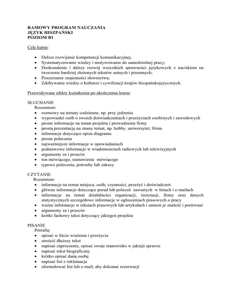 RAMOWY PROGRAM NAUCZANIA JĘZYK HISZPAŃSKI POZIOM B1 Cele kursu: • • • • • Dalsze rozwijanie kompetencji komunikacyjnej; Systematyzowanie wiedzy i motywowanie do samodzielnej pracy; Doskonalenie i dalszy rozwój wszystkich sprawności językowych z naciskiem na tworzenie bardziej złożonych tekstów ustnych i pisemnych; Poszerzanie znajomości słownictwa; Zdobywanie wiedzy o kulturze i cywilizacji krajów hiszpańskojęzycznych. Przewidywane efekty kształcenia po ukończeniu kursu: SŁUCHANIE Rozumiem: • rozmowy na tematy codzienne, np. przy jedzeniu • wypowiedzi osób o swoich doświadczeniach i przeżyciach osobistych i zawodowych • proste informacje na temat projektu i prowadzenia firmy • prostą prezentację na znany temat, np. hobby, uniwersytet, firma • informacje dotyczące opisu diagramu • proste polecenia • najważniejsze informacje w opowiadaniach • podstawowe informacje w wiadomościach radiowych lub telewizyjnych • argumenty za i przeciw • ton mówiącego, nastawienie mówiącego • typowe polecenia, potrzeby lub zakazy CZYTANIE Rozumiem: • informacje na temat miejsca, osób, czynności, przeżyć i doświadczeń • główne informacje dotyczące porad lub poleceń zawartych w listach i e-mailach • informacje na temat działalności organizacji, instytucji, firmy oraz danych statystycznych szczegółowe informacje w ogłoszeniach prasowych o pracy • ważne informacje w tekstach prasowych lub artykułach i umiem je znaleźć i porównać • argumenty za i przeciw • krótki fachowy tekst dotyczący jakiegoś projektu PISANIE Potrafię: • opisać w liście wrażenia i przeżycia • streścić dłuższy tekst • napisać zaproszenie, opisać swoje stanowisko w jakiejś sprawie • napisać tekst biograficzny • krótko opisać daną osobę • napisać list z reklamacja • sformułować list lub e-mail, aby dokonać rezerwacji • • • opisać wydarzenia, wypadek opisać strukturę instytucji, organizacji opisać projekt na podstawie krótkiego fachowego tekstu MÓWIENIE Umiem: • zaproponować wspólne spotkanie, wspólne spędzenie czasu • ustalić i omówić program spotkania • poinformować o swojej sytuacji osobistej • dyskutować o sposobach spędzania wolnego czasu • mówić o pogodzie, modzie, współczesnych zjawiskach • opowiedzieć o doświadczeniach z podróży, wakacji • mówić o problemach emigracji • opisać wypadek i przeprowadzić rozmowę w szpitalu • mówić o związkach, uczuciach, doświadczeniach życiowych • opisywać własne doświadczenia życiowe • wyrazić pogląd na aktualny temat • przekazywać informacje • opisać stanowisko pracy • wyrażać zażalenie • przedstawić krótką prezentację na podstawie wybranego tekstu • wygłosić krótki referat na wybrany temat związany z bliskim otoczeniem • opisywać rysunki, zdjęcia, obrazy • wyrażać i uzasadniać swoje stanowisko, opinię, pogląd Kształcone sprawności językowe: SŁUCHANIE głównego sensu wypowiedzi sformułowanej wyraźnie, w języku literackim, na znany temat, związany z pracą, uczelnią, czasem wolnym itp.; najważniejszych informacji w programach radiowych i telewizyjnych dotyczących wydarzeń współczesnych lub tematów związanych z zainteresowaniami osobistymi lub zawodowymi, gdy mówi się dość wolno i wyraźnie. CZYTANIE tekstu zawierającego najczęściej używane wyrażenia związane z życiem codziennym i zawodowym; opisu wydarzeń, uczuć i życzeń zawartych w listach prywatnych. PISANIE prostego zwartego tekstu na znany lub interesujący temat, listu osobistego opisującego doświadczenia i wrażenia, opowiadania, recenzji filmu lub książki. MÓWIENIE: porozumiewanie się w większości sytuacji, które mogą się zdarzyć w podróży w kraju danego obszaru językowego; uczestniczenie bez przygotowania w rozmowach na tematy znane, interesujące lub odnoszące się do życia codziennego (np. rodzina, zainteresowania, podróże i wydarzenia bieżące); łączenie wyrazów i wyrażeń w prosty sposób aby opisać doświadczenia i wydarzenia, marzenia, nadzieje, ambicje; podawanie przyczyny i wyjaśnianie opinii i planów; opowiadanie jakiejś historii, zrelacjonowanie treści filmu lub książki i opisywanie własnych reakcji. Tematyka kursu: Domena osobista i publiczna; Relacje międzyludzkie; Praca. Środowisko; Gastronomia. Sport. Pogoda, zjawiska przyrody, pory roku; Problemy świata współczesnego; Uczenie się języków: oczekiwania, doświadczenia; Wakacje. Podróże. Plany na przyszłość; Relacje między członkami rodziny, porównanie modelu rodziny, warunki życia, mieszkaniowe, materialne; Kino, teatr, dyskoteka, basen, wycieczki; Usługi: na poczcie (telegram, list polecony, rozmowa telefoniczna, paczka, krawiec, pralnia, reperacja obuwia, auta, kupno-sprzedaż); Wydarzenia społeczne i polityczne. Wprowadzane funkcje językowe: • • • • • • • • • • • • • • • • • • • • • • • • • • • • Składanie protestu i reklamacji; Gratulowanie; życzenie powodzenia; Przepraszanie i tłumaczenie się; Prostowanie wypowiedzi. Poprawianie się; Wyrażanie niewiedzy; Podtrzymywanie rozmowy; Formułowanie definicji. Opisywanie drogi, miejsc; Udzielanie wskazówek; Przekazywanie informacji i wiadomości; Przedstawianie wydarzeń, sytuacji i zwyczajowych czynności w przeszłości; Przedstawianie przyszłości, również w przeszłości; Przedstawianie okoliczności towarzyszących wydarzeniu w teraźniejszości i przeszłości: celu, przyczyny, skutku, warunku; Przedstawianie początku, trwania i końca jakiejś czynności; Określanie cech rzeczy i osób; Informowanie o planach. Przedstawianie przyszłości; Reagowania na pragnienie, życzenie; Przedstawianie różnego stopnia pewności, przypuszczenia w teraźniejszości, przeszłości i przyszłości; Ocenianie miejsc, wydarzeń z przeszłości; Wyrażanie sądu i opinii. Ok