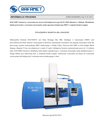 INFORMACJA PRASOWA KUŹNIA RACIBORSKA, dnia 10. 02. 2014 r. RAFAMET dostarczy wytaczarkę do otworu kół kolejowych typu KCM 150N klientowi z Malezji. Obrabiarka będzie pracowała w warsztacie utrzymania ruchu operatora kolejowego MRT w regionie Kuala Lumpur. WYJĄTKOWA MASZYNA DLA MALEZJI Malezyjskim klientem RAFAMETU jest firma Hisniaga Sdn. Bhd. działająca w konsorcjum (SSHC) pod przewodnictwem firmy Siemens. Konsorcjum to dostarcza wyposażenie warsztatów oraz pojazdy utrzymania ruchu dla pierwszego systemu malezyjskiego MRT, budowanego w Klang Valley. Pierwsza linia MRT to linia Sungai Buloh Kajang o długości 51 km, ma obejmować w sumie 31 stacji i obsługiwać korytarz zamieszkiwany przez ok. 1,2 miliona ludzi. RAFAMET dostarczy obrabiarkę, która będzie zainstalowana w warsztacie utrzymania ruchu zlokalizowanym w Sungai Buloh, przy budowanej linii, w okolicach Kuala Lumpur. Zamówiona wytaczarka ma służyć do wytaczania otworu piasty kół kolejowych i wiercenia otworu iniekcyjnego w kole. Maszyna typu KCM 150 N INFORMACJA PRASOWA KUŹNIA RACIBORSKA, dnia 10. 02. 2014 r. Negocjacje w sprawie kontraktu trwały już od dłuższego czasu i związane były z dostosowaniem obrabiarki do wymagań klienta aby w pełni spełnić wymagania specyfikacji projektu. Bardzo istotną kwestią było m.in. dostosowanie obrabiarki do wymagań klienta. - Jeden z warunków był taki, że nie ma możliwości instalacji obrabiarki poniżej poziomu podłogi, cała instalacja musi być na poziomie podłogi hali, mimo iż nasze maszyny dla osiągnięcia pełnej funkcjonalności wymagają wykonania otworów w fundamencie, a w wielu przypadkach głębokiego fundamentu wgłębnego. Do tego przestrzeń dla całego wyposażenia obrabiarki jest bardzo ograniczona. Musimy więc maksymalnie zmniejszyć powierzchnię zabudowy maszyny i jej komponentów – mówi Krzysztof Pestkowski, kierownik sprzedaży w RAFAMET S.A., odpowiedzialny za kontrakt. - Oprócz tego okazało się, że zainstalowana będzie suwnica, która będzie poruszać się w bardzo małej odległości ponad obrabiarką. Z tego powodu musieliśmy znacząco obniżyć wysokość obrabiarki, aby cała konstrukcja zmieściła się pod pracującą suwnicą. Ostatecznie zaoferowaliśmy zmodyfikowaną obrabiarkę dostosowaną do wymagań klienta – dodaje. - Termin dostawy jest nietypowy, czyli dosyć odległy. Wynika to z faktu, że projekt jest ogromny i czas potrzebny na budowę całej infrastruktury jest długi, a proces zakupowy musiał być zamknięty na jego wstępnym etapie – wyjaśnia K. Pestkowski. Kontrakt został podpisany w połowie stycznia br. Przekazanie maszyny klientowi planowane jest na wrzesień 2016 r. * * * RAFAMET S.A. Fabryka Obrabiarek RAFAMET S.A. z Kuźni Raciborskiej jest jednym z kilku na świecie producentów obrabiarek specjalnych do obróbki zestawów kołowych pojazdów szynowych (kolej, metro, tramwaje). Wykonuje również, na jednostkowe zamówienia, wielkogabarytowe obrabiarki specjalistyczne dla odbiorców w sektorach: energetycznym, maszynowym, stoczniowym, hutniczym oraz zbrojeniowym. Udział eksportu w sprzedaży to około 70-80 proc. Kapitał zakładowy wynosi 43.187.010,00 zł.