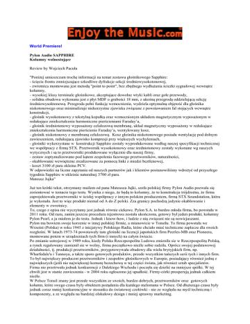 World Premiere! Pylon Audio SAPPHIRE Kolumny wolnostojące Review by Wojciech Pacuła "Poniżej umieszczam trochę informacji na temat zestawu głośnikowego Sapphire: - ścięcia frontu zmniejszające szkodliwe dyfrakcje sekcji średniowysokotonowej, - zwrotnica montowana jest metodą "point to point", bez zbędnego wydłużania ścieżki sygnałowej wewnątrz kolumny, - wysokiej klasy terminale głośnikowe, akceptujące dowolne wtyki kabli oraz gołe przewody, - solidna obudowa wykonana jest z płyt MDF o grubości 18 mm, z ukośną przegrodą oddzielającą sekcję średniowysoktonową. Przegroda pełni funkcję wzmocnienia, wydziela optymalną objętość dla głośnika niskotonowego oraz minimalizuje niekorzystne zjawiska związane z powstawaniem fal stojących wewnątrz konstrukcji, - głośnik wysokotonowy z tekstylną kopułką oraz wzmocnionym układem magnetycznym wyposażonym w redukujące zniekształcenia harmoniczne pierścieniami Faraday’a, - głośnik średniotonowy wyposażony celulozową membranę, układ magnetyczny wyposażony w redukujące zniekształcenia harmoniczne pierścienie Faraday’a, wentylowany kosz, - głośnik niskotonowy z membraną celulozową. Kosz głośnika niskotonowego posiada wentylację pod dolnym zawieszeniem, redukującą zjawisko kompresji przy większych wychyleniach, - głośniki wykorzystane w konstrukcji Sapphire zostały wyprodukowane według naszej specyfikacji technicznej we współpracy z firmą STX. Przetwornik wysokotonowy oraz średniotonowy zostały wykonane wg naszych wytycznych i są to przetworniki produkowane wyłącznie dla naszej firmy, - zestaw zoptymalizowano pod kątem zespolenia fazowego przetworników, naturalności, - okablowanie wewnętrzne zrealizowane za pomocą linki z miedzi beztlenowej, - koszt 3100 zł para okleina PCV. W odpowiedzi na liczne zapytania od naszych partnerów jak i klientów postanowiliśmy wdrożyć od przyszłego tygodnia Sapphire w okleinie naturalnej 3700 zł para. Mateusz Jujka" Już ten krótki tekst, otrzymany mailem od pana Mateusza Jujki, szefa polskiej firmy Pylon Audio pozwala się zorientować w temacie tego testu. Wynika z niego, że będą to kolumny, że to konstrukcja trójdrożna, że firma zaprojektowała przetworniki w ścisłej współpracy z innym polskim producentem, firmą STX Soundstation, która je wykonała. Jest to więc produkt niemal od A do Z polski. Zza granicy pochodzą jedynie okablowanie i elementy w zwrotnicy. To, czego z opisu nie wyczytamy jest jednak równie ciekawe. Pylon S.A. to bardzo młoda firma, bo powstała w 2011 roku. Od razu, zanim jeszcze procedura rejestrowa została ukończona, gotowy był jeden produkt, kolumny Pylon Pearl, a ja miałem je do testu. Jednak i know-how, i ludzie z nią związani nie są nowicjuszami. Pylon ma bowiem swoje korzenie w innej polskiej firmie, a mianowicie w Tonsilu. To firma powstała we Wrześni (Polska) w roku 1945 z inicjatywy Polskiego Radia, które chciało mieć techniczne zaplecze dla swoich rozgłośni. W latach 1973-74 powstawały tam głośniki na licencji japońskich firm Peerles-MB oraz Pioneera, montowane potem w urządzeniach tych firm (i innych) na całym świecie. Po zmianie ustrojowej w 1989 roku, kiedy Polska Rzeczpospolita Ludowa zmieniła sie w Rzeczpospolitą Polską, a rynek regulowany zamienił sie w wolny, firma początkowo nieźle sobie radziła. Oprócz swojej podstawowej działalności, tj. produkcji przetworników, przygotowywała obudowy dla wielu brytyjskich firm, np. Wharfedale'a i Tannoya, a także sporo gotowych produktów, przede wszystkim tańszych serii tych i innych firm. To był największy producent przetworników i zespołów głośnikowych w Europie, posiadający również jedną z największych (jeśli nie największą) komorę bezechową w tej części świata, jak również sztab specjalistów. Firma nie przetrwała jednak konkurencji z Dalekiego Wschodu i poczęła się dzielić na mniejsze spółki. W tej chwili jest w stanie zawieszenia - w 2004 roku ogłoszono jej upadłość. Firmy-córki prosperują jednak całkiem nieźle. W Polsce Tonsil znany jest przede wszystkim ze swoich, bardzo dobrych, przetworników oraz gotowych kolumn, które swego czasu były obiektem pożądania dla każdego melomana w Polsce. Od dłuższego czasu były jednak coraz mniej konkurencyjne w stosunku do światowej czołówki - nie ze względu na myśl techniczną i komponenty, a ze względu na bardziej olskulowy design i mniej sprawny marketing. Najważniejsza jest jednak w tym przypadku wiedza, zakumulowana w ciągu prawie 70 lat działalności Tonsila. Co z tym ma wspólnego Pylon Audio? Ano to, że konstruktorzy firmy, w tym pan Jujka, pracowali poprzednio w różnych spółkach Tonsilu. A i, jak się wydaje, także STX Soundstation ma bezpośrednie powiązania z firmą z Wrześni, co widać po konstrukcji jej przetworników i nazewnictwie. Opis Testowany model Sapphire powstawała prawie dwa lata. Po raz pierwszy miałem go obiecanego do testu w czasie wystawy Audio Show 2011 (to największa impreza tego typu w Europie, niedaleko za monachijskim High Endem - to ponad 9000 ludzi w ciągu dwóch dni! Wystawa ma miejsce w listopadzie i przyciąga audiofilów z całej Europy już od piętnastu lat). Okazało sie jednak, że dopracowanie przetworników zajęło więcej czasu niż się początkowo wydawało. Do testu dostałem jeden z pierwszych, jeśli nie pierwszy produkcyjny model tych kolumn. Jak mówiłem, to kolumna trójdrożna, wolnostojąca, z głośnikami polskiej produkcji STX, wentylowana, umieszczonym na tylnej ściance, wylotem bas-refleksu. Kolumna jest naprawdę okazała i widać, że głośnik niskotonowy ma dużą komorę. Front polakierowano na czarno i ścięto jego krawędzie w sposób, który przywołuje na myśl kolumny Avalona. Przednia ścianka jest dość gruba, jednak to wciąż nie są bardzo ciężkie kolumny. Wyglądają jednak bardzo ładnie. Nawet winylowa oklein