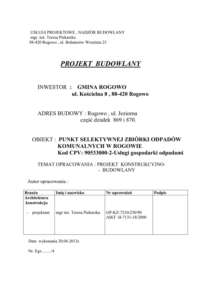 USŁUGI PROJEKTOWE , NADZÓR BUDOWLANY mgr. inŜ. Teresa Piekarska 88-420 Rogowo , ul. Bohaterów Września 23 PROJEKT BUDOWLANY INWESTOR : GMINA ROGOWO ul. Kościelna 8 , 88-420 Rogowo ADRES BUDOWY : Rogowo , ul. Jeziorna część działek 869 i 870. OBIEKT : PUNKT SELEKTYWNEJ ZBIÓRKI ODPADÓW KOMUNALNYCH W ROGOWIE Kod CPV: 90533000-2-Usługi gospodarki odpadami TEMAT OPRACOWANIA : PROJEKT KONSTRUKCYJNO- BUDOWLANY Autor opracowania : BranŜa Architektura konstrukcja - projektant Imię i nazwisko Nr uprawnień mgr inŜ. Teresa Piekarska GP-KZ-7210/250/90 ABiT -II-7131-18/2000 Data wykonania 20.04.2013r. Nr. Egz........./4 Podpis Opis techniczny do planu zagospodarowania działek nr 869 i 870 I. Podstawa opracowania. 1. Zlecenie inwestora 2. Decyzja Nr BUD.6733.1.2013 z dnia .04.2013 r.o ustaleniu warunków zabudowy i zagospodarowania terenu wydana przez Wójta Gminy Rogowo 3. Decyzja o środowiskowych uwarunkowaniach INW.6220.2.2012 z dnia 13.03.2013r. 4. Podkład geodezyjny w skali 1:500 opracowana przez zakład Usług Geodezyjno – Kartograficznych "GEOMAP" Pana Dariusza Cieślaka w Rogowie 5. Sprawdzenie sytuacji w terenie 3. Wytyczne do projektowania:. 5.1. Rozporządzenie Ministra Infrastruktury a dnia 07.04.2004r. w sprawie warunków technicznych jakim powinny odpowiadać budynki 5.2. Rozporządzenie Ministra Rolnictwa i Gospodarki śywnościowej z dnia 07.10.1997r. w sprawie warunków jakim powinny odpowiadać budowle rolnicze i ich usytuowanie Dz.U. Nr. 132. poz. 877. 5.3. Rozporządzenie Rady Ministrów z dnia 9 listopada 2004r. W sprawie określenia rodzajów przedsięwzięć mogących znacząco oddziałowywać na środowisko oraz szczegółowych uwarunkowań związanych z kwalifikowaniem przedsięwzięcia do sporządzania raportu o oddziaływaniu na środowisko (Dz.U NR 257,poz.257). 5.4. Rozporządzenie Ministra Infrastruktury z dnia 23 czerwca 2003r. W sprawie informacji dotyczącej bezpieczeństwa i ochrony zdrowia oraz planu bezpieczeństwa i ochrony zdrowia (Dz U Nr 120 , poz. 1126) . 5.5. Ustawa – prawo budowlane oraz normy i normatywy techniczne. II. Istniejące zagospodarowanie. Działki na której przewiduje się budowę " Punktu Selektywnej Zbiórki Odpadów Komunalnych w Rogowie " oznaczone geodezyjnie jako działki Nr 869 i 870 połoŜone są w Rogowie przy ulicy Jeziornej . Na powyŜszych działkach znajduje się nowa zrealizowana w końcówce lat ubiegłego wieku oczyszczalnia ścieków wraz z całym zapleczem , spełniająca wymogi konieczne dla zachowania warunków środowiskowych dla przyległych ekosystemów Całkowita powierzchnia działki nr 869 wynosi 1,01ha. Powierzchnie działki stanowią : pastwiska trwałe 0,43 ha , tereny przemysłowe o pow. 0,50 ha oraz rowy o pow. 0,08 ha Natomiast działka Nr 870 to uŜytek rolny RV o powierzchni 0,96 ha Działki nie wymagają zgody na zmianę sposobu uŜytkowania gruntów na cele nierolnicze Przez powyŜsze działki przebiegają instalacje kanalizacyjne i wodociągowe oraz elektryczne. Na terenie działek brak urządzeń melioracji podstawowej , mogą natomiast wystąpić urządzenia melioracji szczegółowej , w przypadku natrafienia i uszkodzenia drenaŜu naleŜy przywrócić go do stanu pierwotnego na koszt inwestora. Działki leŜy w obszarze "W" objętym strefami archeologicznej ochrony konserwatorskiej . Wymagane jest ustanowienie nadzoru archeologicznego nad pracami ziemnymi . W przypadku natrafienia w trakcie prac ziemnych na element zabytkowy naleŜy prace wstrzymać i powiadomić Wojewódzki Urząd Ochrony Zabytków - Delegatura w Bydgoszczy.[pismo WUOZ.DB.ZAR.5152.22.3.2013.TZ] Działki połoŜone są w granicy Obszaru Chronionego Krajobrazu Jezior Rogowskich . Droga komunikacyjna stanowić będzie zjazd do drogi gminnej ulicy Jeziornej oraz do drogi gminnej oznaczonej geodezyjnie jako działka N r 866/2 , III. Projektowane zagospodarowanie działki. Projektowany Punkt Selektywnej Zbiórki Odpadów Komunalnych zostanie usytuowany 10 mb od drogi gminnej ulicy Jeziornej oraz 8,00 mb od istniejącego ogrodzenia terenu oczyszczalni ścieków oraz 3 mb od wewnętrznej drogi gminnej 866/2 Usytuowanie projektowanej wiaty zostało naniesione na plan sytuacyjno – wysokościowy w skali 1:500 [plan zagospodarowania działki].Wiata ta powstanie pomiędzy przebiegającymi instalacjami wodociągowymi i kanalizacyjnymi zgodnie ze zgodą gestorów sieci Wskaźniki techniczne - powierzchnia zabudowy – 120,00 m2 - powierzchnia uŜytkowa - 120,00 m2 - kubatura - 552,00 m3 Wymiary wiaty : - długość - szerokość - wysokość - 12,00 mb - 10,00 mb - 5,20 mb Wjazd na teren projektowanego PSZOK zgodnie z warunkami gestora drogi - Urzędu Gminy w Rogowie . Projektowane zamierzenie inwestycyjne zgodnie z uchwałą Sejmiku Woj. Kuj - Pom z dnia 21 marca 2011 r w kwestii dotyczącej Obszaru Chronionego Krajobrazu Jezior Rogowskich zostanie wkomponowane w istniejący miejscowy krajobraz przyrodniczy i kulturowy . Zagospodarowanie terenu nie będzie wprowadzało zakłóceń ładu przestrzennego w otoczeniu i krajobrazie tej części miejscowości Rogowo . Inwestycja mieścić się będzie w bezpośrednim sąsiedztwie istniejącej oczyszczalni ścieków i jego zaplecza. . Teren wokół zostanie ogrodzony siatką na słupkach stalowych z dwoma bramami wjazdowymi i furtką na teren przedsięwzięcia oraz utwardzone zostaną dojazdy i place manewrowe dla samochodów dowoŜących i odbierających odpady komunalne . IV. Warunki posadowienia obiektów. Wykonując odkrywkę w miejscu posadowienia budynków i wykonania stóp fundamentowych pod słupy projektowanego obiektu stwierdzono do głębokości 50 cm glebę Ŝyzną , poniŜej grunt gliniasty. Graniczny opór gruntu w miejscu posadowienia stóp fundamentowych wynosi 0,0015kN/m20,15MPa. Podczas wykonywania odkrywek w wykopie wody gruntowej na poziomie posadowienia nie stwierdzono. Na podstawie panujących warunków gruntowych i projektu przedmiotowego przedsięwzięcia stwie
