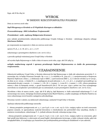 Sygn. akt II Ka 184/16 WYROK W IMIENIU RZECZYPOSPOLITEJ POLSKIEJ Dnia 22 czerwca 2016 roku Sąd Okręgowy w Krośnie w II Wydziale Karnym w składzie: Przewodniczący : SSO Arkadiusz Trojanowski Protokolant : sekr. sądowy Małgorzata Kramarz przy udziale przedstawiciela oskarżyciela publicznego Urzędu Celnego w Krośnie - młodszego eksperta celnego Mariusza Dubisa po rozpoznaniu na rozprawie w dniu 22 czerwca 2016 roku sprawy T. J., s. A. i B. zd. L., ur. (...) w P. oskarżonego o przestępstwo skarbowe z art. 107 § 1 k.k.s. z powodu apelacji wniesionej przez Urząd Celny w Krośnie od wyroku Sądu Rejonowego w Jaśle z dnia 16 marca 2016 roku, sygn. akt II K 483/15 uchyla zaskarżony wyrok i sprawę przekazuje Sądowi Rejonowemu w Jaśle do ponownego rozpoznania. UZASADNIENIE Oskarżyciel publiczny Urząd Celny w Krośnie skierował do Sąd Rejonowego w Jaśle akt oskarżenia przeciwko T. J. zarzucając mu, że będąc Prezesem Zarządu Sp. z o.o. (...) z siedzibą w K., przy ul. (...), zarejestrowanej w Krajowym Rejestrze Sądowym z dnia (...), (dokonany wpis w KRS (...) pod numerem KRS (...)), w okresie od dnia 15-07-2014r., do dnia 15-10- 2015r., w lokalu H. (...), znajdującym sie pod adresem: (...)-(...) J., ul. (...), urządzał i prowadził gry na automatach do gier o nazwie :. (...) numer (...) H., H. (...) numer (...) oraz H. (...) numer (...)/H., wbrew przepisom ustawy z dnia 19 listopada 2009r., o grach hazardowych (Dz.U. Nr 201 poz. 1540 z późno zm.) bez wymaganego zezwolenia na urządzenie i prowadzenie gier na automatach, to jest przestępstwo skarbowe z art. 107 § 1 k.k.s. Wyrokiem z dnia 16 marca 2016r., sygn. akt II K 483/15, Sąd Rejonowy w Jaśle uniewinnił oskarżonego T. J. od zarzuconego mu czynu, obciążając kosztami postępowania Skarb Państwa, a nadto zasądzając od Skarbu Państwa na rzecz oskarżonego zwrot kosztów zastępstwa adwokackiego. Powyższy wyrok w całości, na niekorzyść oskarżonego, zaskarżył Urząd Celny w Krośnie. Apelacja oskarżyciela publicznego zarzuciła: I. obrazę przepisów postępowania art. 4, 7, 410 k.p.k. w zw. z art. 113 § 1 k.k.s. mającą wpływ na treść orzeczenia poprzez uznanie, że zgromadzony materiał dowodowy w dochodzeniu nie potwierdził winy umyślnej, choćby w zamiarze ewentualnym. oskarżonego T. J., jednak zebrane dowody wskazują na jego winę, - obrazę przepisów postępowania art. 7 i 424 § 1 k.p.k. w zw. z art. 113 § 1 k.k.s. mającą wpływ na orzeczenie, gdyż Sąd ustalił stan faktyczny w oderwaniu od zasad logiki i doświadczenia życiowego, a także wskazań wiedzy, gdyż nie uwzględnił faktu, iż urządzający gry hazardowe jest profesjonalistą prowadzącym działalność w tym zakresie, II. błąd w ustaleniach faktycznych na podstawie przyjętych za podstawę orzeczenia przez Sąd Rejonowy w Jaśle, II Wydział Kamy, które miało wpływ na treść orzeczenia poprzez: • uznanie, że oskarżony powołując się na orzeczenie Trybunału Sprawiedliwości UE (połączone sprawy C(...), C- (...) i (...) mające za przedmiot wnioski wydane na podstawie art. 267 TFUE orzeczenia w trybie prejudycjonalnym, a złożone przez WSA w Gdańsku, a dotyczące interpretacji art. 1 pkt. 11 Dyrektywy 98/34/WE0, mógł wnioskować, że nie może być stosowany zakaz urządzania gier na automatach poza kasynami, podczas gdy Trybunał wyrokiem tym orzekł, iż przepis tego rodzaju, jak art. 14 ust. 1 ustaw - o grach hazardowych, zgodnie z którym urządzanie gier na automatach dozwolone jest jedynie w kasynach gry, należy uznać potencjalnie za przepis techniczny w rozumieniu art. l pkt 11 w/w dyrektywy, • uznanie, że przeprowadzone czynności dowodowe w postępowaniu przygotowawczym zakończone skierowaniem aktu oskarżenia, nie wskazują na to, że oskarżony dopuścił się popełnienia przestępstwa, ponieważ przestępstwo to można popełnić wyłącznie umyślnie, zaś cechą umyślności jest występujący po stronie zamiar bezpośredni, bądź ewentualny popełnienia czynu podczas gdy oskarżony prowadził działalność gospodarczą o określonym profilu i był doskonale zorientowany, jakie warunki należy spełnić przy urządzaniu gier hazardowych, co stanowi niewątpliwie błąd w ustaleniach faktycznych który jest skutkiem naruszenia wcześniej wskazanych w zarzutach przepisów postępowania karnego. Oskarżyciel publiczny wniósł o uchylenie zaskarżonego wyroku w całości i przekazanie sprawy do ponownego rozpoznania Sądowi Rejonowemu w Jaśle. Sąd Odwoławczy zważył, co następuje: Apelacja oskarżyciela publicznego skutkować musiała uchyleniem zaskarżonego wyroku i przekazaniem sprawy do ponownego rozpoznania. Sąd pierwszej instancji w sposób całkowicie schematyczny, pobieżny, bez wgłębienia się w istotę rozpoznawanej sprawy wydał i uzasadnił swoje rozstrzygnięcie, a w treści uzasadnienia, nie dokonując potrzebnych rozważań faktycznych i prawnych, powielił fragmenty, dołączonych do akt sprawy, orzeczeń innych sądów. Tymczasem przedmiotowa sprawa należy do wielkiej grupy spraw rozstrzygniętych lub zawisłych przed polskimi sądami, w których oskarżeni stają pod zarzutami popełnienia przestępstwa skarbowego z art. 107 k.k.s, a w których rozstrzygnięcie weryfikowane było przez wszelkie instancje sądów powszechnych, a swoje stanowisko zajmowały także Sąd Najwyższy, Trybunał Konstytucyjny i Trybunał Sprawiedliwości Unii Europejskiej. Istotą problemu z pozycji prawa karanego skarbowego jest dopuszczalność pociągnięcia do odpowiedzialności karnej skarbowej za czyn zabroniony, stypizowany w art. 107 § 1 k.k.s., który zawiera odesłanie do nienotyfikowanych przepisów technicznych ustawy o grach hazardowych. Wątpliwości istnieją co do charakteru przepisów art. 6 ust. 1 i art. 14 ust. 1 ustawy z dnia 19 listopada 2009 r. o grach hazardowych (Dz.U. z 2015 r. poz. 612) w kontekście art. 1 pkt 11 dyrektywy 98/34/ WE Parlamen