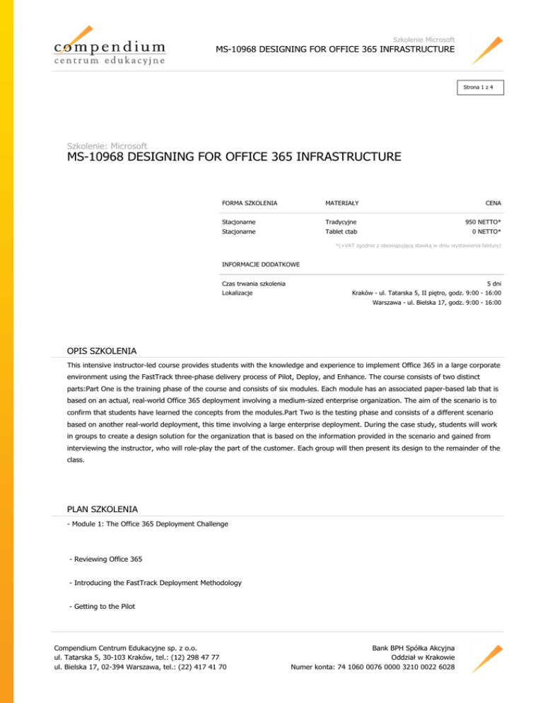 Szkolenie Microsoft MS-10968 DESIGNING FOR OFFICE 365 INFRASTRUCTURE Strona 1 z 4 Szkolenie: Microsoft MS-10968 DESIGNING FOR OFFICE 365 INFRASTRUCTURE FORMA SZKOLENIA MATERIAŁY CENA Stacjonarne Tradycyjne 950 NETTO* Stacjonarne Tablet ctab 0 NETTO* *(+VAT zgodnie z obowiązującą stawką w dniu wystawienia faktury) INFORMACJE DODATKOWE Czas trwania szkolenia Lokalizacje 5 dni Kraków - ul. Tatarska 5, II piętro, godz. 9:00 - 16:00 Warszawa - ul. Bielska 17, godz. 9:00 - 16:00 OPIS SZKOLENIA This intensive instructor-led course provides students with the knowledge and experience to implement Office 365 in a large corporate environment using the FastTrack three-phase delivery process of Pilot, Deploy, and Enhance. The course consists of two distinct parts:Part One is the training phase of the course and consists of six modules. Each module has an associated paper-based lab that is based on an actual, real-world Office 365 deployment involving a medium-sized enterprise organization. The aim of the scenario is to confirm that students have learned the concepts from the modules.Part Two is the testing phase and consists of a different scenario based on another real-world deployment, this time involving a large enterprise deployment. During the case study, students will work in groups to create a design solution for the organization that is based on the information provided in the scenario and gained from interviewing the instructor, who will role-play the part of the customer. Each group will then present its design to the remainder of the class. PLAN SZKOLENIA - Module 1: The Office 365 Deployment Challenge - Reviewing Office 365 - Introducing the FastTrack Deployment Methodology - Getting to the Pilot Compendium Centrum Edukacyjne sp. z o.o. ul. Tatarska 5, 30-103 Kraków, tel.: (12) 298 47 77 ul. Bielska 17, 02-394 Warszawa, tel.: (22) 417 41 70 Bank BPH Spółka Akcyjna Oddział w Krakowie Numer konta: 74 1060 0076 0000 3210 0022 6028 Szkolenie Microsoft MS-10968 DESIGNING FOR OFFICE 365 INFRASTRUCTURE Strona 2 z 4 - Module 2: Planning the Pilot Phase - Overview of the Pilot Phase - Identifying Environmental and Software Prerequisites - Planning for Pilot Users - Planning for Team Collaboration - Module 3: Planning the Deploy Phase - Part 1 - Overview of the Deploy Phase - Planning Service Selection - Planning Networking and Domains - Planning User Management - Module 4: Planning the Deploy Phase - Part 2 - Planning Email Migration - Planning SharePoint Site Collections and sites - Planning Lync Online - Planning Office 365 ProPlus Deployment Compendium Centrum Edukacyjne sp. z o.o. ul. Tatarska 5, 30-103 Kraków, tel.: (12) 298 47 77 ul. Bielska 17, 02-394 Warszawa, tel.: (22) 417 41 70 Bank BPH Spółka Akcyjna Oddział w Krakowie Numer konta: 74 1060 0076 0000 3210 0022 6028 Szkolenie Microsoft MS-10968 DESIGNING FOR OFFICE 365 INFRASTRUCTURE Strona 3 z 4 - Module 5: Planning the Enhance Phase - Part 1 - Overview of the Enhance Phase - Planning Single Sign-On - Planning Hybrid Exchange Deployments - Module 6: Planning the Enhance Phase - Part 2 - Planning Exchange Online Protection - Planning SharePoint Online Customization - Planning Hybrid SharePoint Implementations - Module 7: Case Study WYMAGANIA DLA UCZESTNIKA Before attending this course, students must have: - At least one year of experience with Office 365 and at least two years of in-role experience as a consultant or IT Professional. - Knowledge of the individual components of Office 365, such as Microsoft Exchange, Microsoft SharePoint, Microsoft Lync, and Office 365 ProPlus. - Experience with the Office 365 platform and its administrative console. - Experience with Active Directory, Windows Azure Active Directory, Directory Synchronization (DirSync) and single sign-on (SSO) with Active Directory Federation Services (ADFS) 2.0. Compendium Centrum Edukacyjne sp. z o.o. ul. Tatarska 5, 30-103 Kraków, tel.: (12) 298 47 77 ul. Bielska 17, 02-394 Warszawa, tel.: (22) 417 41 70 Bank BPH Spółka Akcyjna Oddział w Krakowie Numer konta: 74 1060 0076 0000 3210 0022 6028 Szkolenie Microsoft MS-10968 DESIGNING FOR OFFICE 365 INFRASTRUCTURE Strona 4 z 4 - Successful deployment experience of Office 365 in a customer-facing engagement. - Knowledge of the principles of IT project design. - Ability to present and peer-review a project design. CERTYFIKATY The participants will obtain Microsoft certificates. PROWADZĄCY Microsoft Certified Trainer. Compendium Centrum Edukacyjne sp. z o.o. ul. Tatarska 5, 30-103 Kraków, tel.: (12) 298 47 77 ul. Bielska 17, 02-394 Warszawa, tel.: (22) 417 41 70 Bank BPH Spółka Akcyjna Oddział w Krakowie Numer konta: 74 1060 0076 0000 3210 0022 6028