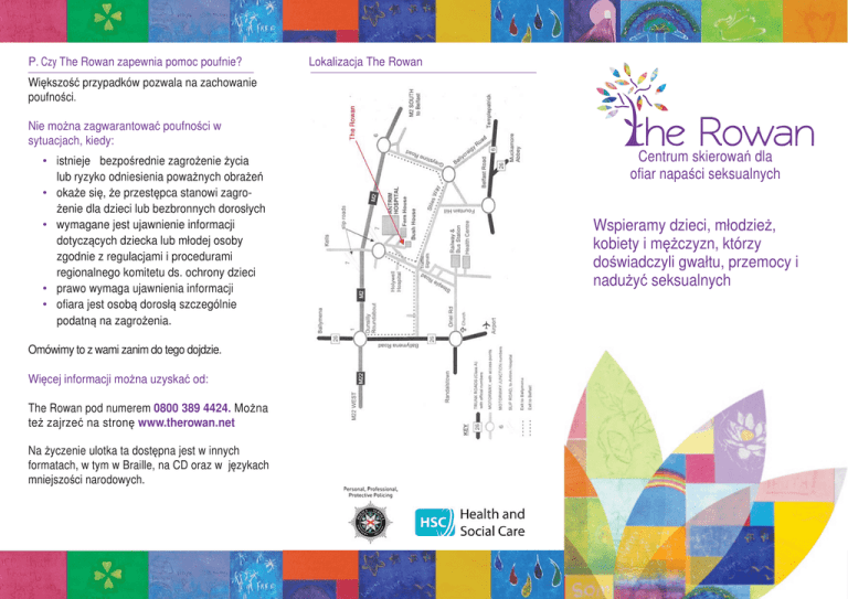 P. Czy The Rowan zapewnia pomoc poufnie? Lokalizacja The Rowan Większość przypadków pozwala na zachowanie poufności. Nie można zagwarantować poufności w sytuacjach, kiedy: • istnieje bezpośrednie zagrożenie życia lub ryzyko odniesienia poważnych obrażeń • okaże się, że przestępca stanowi zagrożenie dla dzieci lub bezbronnych dorosłych • wymagane jest ujawnienie informacji dotyczących dziecka lub młodej osoby zgodnie z regulacjami i procedurami regionalnego komitetu ds. ochrony dzieci • prawo wymaga ujawnienia informacji • ofiara jest osobą dorosłą szczególnie podatną na zagrożenia. Omówimy to z wami zanim do tego dojdzie. Więcej informacji można uzyskać od: The Rowan pod numerem 0800 389 4424. Można też zajrzeć na stronę www.therowan.net Na życzenie ulotka ta dostępna jest w innych formatach, w tym w Braille, na CD oraz w językach mniejszości narodowych. Centrum skierowań dla ofiar napaści seksualnych Wspieramy dzieci, młodzież, kobiety i mężczyzn, którzy doświadczyli gwałtu, przemocy i nadużyć seksualnych P. Czy jest The Rowan? P. Z kim będę mieć kontakt w centrum? The Rowan to specjalistyczny, regionalny ośrodek, który oferuje wsparcie i opiekę ofiarom przemocy seksualnej, w tym gwałtu, oraz innych nadużyć seksualnych. Naszym celem jest pomoc w leczeniu fizycznym i emocjonalnym. P. Jak skontaktować się z The Rowan? Dostępni są specjalnie przeszkoleni lekarze i zarejestrowane pielęgniarki, którzy będą mogli zaoferować ci pomoc i opiekę. Możesz zatelefonować do nas pod nr 0800 389 4424 (bezpłatnie, 24/7) lub zajrzeć na naszą stronę www.therowan.net by uzyskać więcej informacji. Jeśli zatelefonujesz, a zajścia jeszcze nie zgłoszono na policję, możemy wspierać cię emocjonalnie w uczynieniu tego, jeśli zechcesz. Możemy wskazać ci inne formy pomocy, np. doradztwo psychologiczne, poradnia chorób układu moczowo-płciowego; wsparcie ofiar w IP (Victim Support NI), oraz zaoferować wsparcie dla partnerów, rodziny i przyjaciół. P. Dla kogo przeznaczone są te usługi? The Rowan oferuje pomoc mężczyznom, kobietom, dzieciom niezależnie od wieku w całej Irlandii Północnej. P. Czy mogę przyjść z kimś? The Rowan zapewnia bezpieczne, wygodne miejsce dla osób, które doświadczyły gwałtu, przemocy i nadużyć seksualnych, oraz ich krewnych lub przyjaciół, którzy chcą im towarzyszyć. P. Kiedy otwarte jest centrum The Rowan? Jeśli masz jakieś pytania, możesz skontaktować się z biurem w godz. od 9:00 do 17:00, od poniedziałku do piątku, pod numerem tel. 9442 4340. Jeśli chcesz zgłosić incydent i uzyskać pomoc, możesz zatelefonować na linię pomocy pod nr 0800 389 4424 czynną 24 godz. na dobę, 365 dni w roku. Jeśli zdecydujesz się zgłosić się najpierw na policję, to oni skontaktują się z nami bezpośrednio, aby można zaoferować ci wsparcie i opiekę. P. Czy muszę umawiać się na wizytę w The Rowan? Tak, na wizytę trzeba się umówić. Możesz zatelefonować do nas, by omówić dostępne opcje oraz uzgodnić termin wizyty w The Rowan. W przypadku kontaktowania się najpierw z policją, to oni ustalą z nami, kiedy możesz przyjść do centrum. P. Jakie wsparcie i usługi są tu dostępne dla mnie? • wsparcie emocjonalne; • antykoncepcja awaryjna (po stosunku); • jeśli jest taka potrzeba, specjalnie przeszkolony lekarz przeprowadzi obdukcję sądową. Materiały dowodowe mogą być przechowywane przez jakiś czas, aż podejmiesz decyzję, czy chcesz zgłosić tę sprawę na policję; • badanie i leczenie infekcji przenoszonych drogą płciową; • wsparcie w kwestii zgłoszenia sprawy na policję; • wskazanie innych organizacji udzielających pomocy, takich jak poradnia chorób układu moczowopłciowego; wsparcie ofiar w IP (Victim Support NI); • wizyty kontrolne; • ocena ryzyka zarażenia HIV.