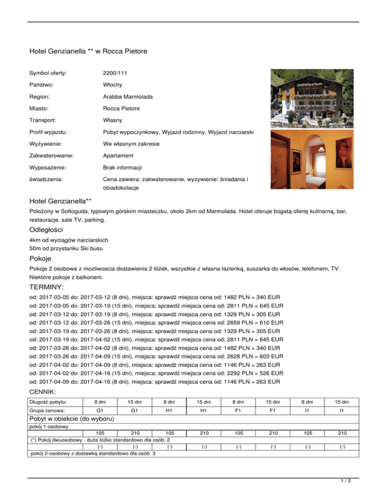 Hotel Genzianella ** w Rocca Pietore Symbol oferty: 2200/111 Państwo: Włochy Region: Arabba Marmolada Miasto: Rocca Pietore Transport: Własny Profil wyjazdu: Pobyt wypoczynkowy, Wyjazd rodzinny, Wyjazd narciarski Wyżywienie: We własnym zakresie Zakwaterowanie: Apartament Wyposażenie: Brak informacji świadczenia: Cena zawiera: zakwaterowanie, wyzywienie: śniadania i obiadokolacje Hotel Genzianella** Położony w Sottoguda, typowym górskim miasteczku, około 2km od Marmolada. Hotel oferuje bogatą ofertę kulinarną, bar, restauracje, sale TV, parking. Odległości 4km od wyciągów narciarskich 50m od przystanku Ski busu Pokoje Pokoje 2 osobowe z mozliwoscia dostawienia 2 łóżek, wszystkie z własna łazienką, suszarka do włosów, telefonem, TV. Niektóre pokoje z balkonem. TERMINY: od: 2017-03-05 do: 2017-03-12 (8 dni), miejsca: sprawdź miejsca cena od: 1482 PLN = 340 EUR od: 2017-03-05 do: 2017-03-19 (15 dni), miejsca: sprawdź miejsca cena od: 2811 PLN = 645 EUR od: 2017-03-12 do: 2017-03-19 (8 dni), miejsca: sprawdź miejsca cena od: 1329 PLN = 305 EUR od: 2017-03-12 do: 2017-03-26 (15 dni), miejsca: sprawdź miejsca cena od: 2659 PLN = 610 EUR od: 2017-03-19 do: 2017-03-26 (8 dni), miejsca: sprawdź miejsca cena od: 1329 PLN = 305 EUR od: 2017-03-19 do: 2017-04-02 (15 dni), miejsca: sprawdź miejsca cena od: 2811 PLN = 645 EUR od: 2017-03-26 do: 2017-04-02 (8 dni), miejsca: sprawdź miejsca cena od: 1482 PLN = 340 EUR od: 2017-03-26 do: 2017-04-09 (15 dni), miejsca: sprawdź miejsca cena od: 2628 PLN = 603 EUR od: 2017-04-02 do: 2017-04-09 (8 dni), miejsca: sprawdź miejsca cena od: 1146 PLN = 263 EUR od: 2017-04-02 do: 2017-04-16 (15 dni), miejsca: sprawdź miejsca cena od: 2292 PLN = 526 EUR od: 2017-04-09 do: 2017-04-16 (8 dni), miejsca: sprawdź miejsca cena od: 1146 PLN = 263 EUR CENNIK: Długość pobytu: 8 dni 15 dni 8 dni 15 dni 8 dni 15 dni 8 dni 15 dni Grupa cenowa: G1 G1 H1 H1 F1 F1 I1 I1 210 105 210 105 210 (-) (-) (-) (-) (-) Pobyt w obiekcie (do wyboru) pokój 1-osobowy 105 210 105 (*) Pokój dwuosobowy - duże łóżko standardowo dla osób: 2 (-) (-) (-) pokój 2-osobowy z dostawką standardowo dla osób: 3 1/2 (-) (-) pokój 2-osobowy + 2 dostawki standardowo dla osób: 4 (-) (-) Ubezpieczenie (do wyboru) (*) ubezpieczenie NW KL dziecko 2 - 5 lat dziecko 6-11 lat Dziecko 0-1 lat (-) (-) (-) (-) (-) (-) (-) (-) (-) (-) (-) 7 14 7 14 7 14 7 14 298 596 333 666 333 666 256 512 208 416 233 466 233 466 179 358 238 476 266 532 266 532 205 410 (-) (-) (-) (-) (-) (-) 299 598 299 598 231 462 2.4 % 2.4 % 2.4 % 2.4 % 2.4 % 2.4 % Rodzaj osoby (do wyboru) (*) osoba dorosła (-) (-) (-) osoba dorosła na dostawce 3-4 osoba w pokoju 268 536 Ubezpieczenie (opcjonalne) ubezpieczenie - od kosztów rezygnacji 2.4 % 2.4 % Waluta: EUR Aktualne ceny z systemu S.A.R.T. (-) - cena usługi, podatku kalkulowana przy osobie lub gratis (*) - kwota wliczona w cenę standardową 2/2