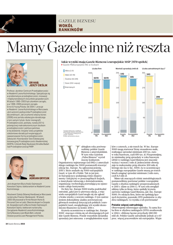 GAZELE BIZNESU WOKÓŁ RANKINGÓW Mamy Gazele inne niż reszta Jakie wyniki mają Gazele Biznesu i europejskie MŚP (3570 spółek) Gazele PB/Europejskie INC w liczbach Liczba firm Wartość sprzedaży (mld zł) Liczba zatrudnionych (tys.)* 200 360 Mikro (1-9) 4000 Małe (10-49) 3570 Średnie (50-249) DR HAB. JERZY CIEŚLIK Profesor, dyrektor Centrum Przedsiębiorczości w Akademii Leona Koźmińskiego. Specjalizuje się w problematyce przedsiębiorczości, innowacji i międzynarodowych stosunków gospodarczych. W latach 1990–2003 był członkiem zarządu, a w 1996–2000 prezesem zarządu Ernst & Young Polska. Od 2004 r. pracuje w Akademii Leona Koźmińskiego w Warszawie. Jest autorem podręcznika Przedsiębiorczość dla ambitnych. Jak uruchomić własny biznes (2006) oraz portalu edukacyjno-doradczego o tym samym tytule. Autor monografii Przedsiębiorczość, polityka, rozwój (2014) poświęconej makroekonomicznym skutkom przedsiębiorczości i polityce państwa w tej dziedzinie. Inicjator wielu projektów szkoleniowo-doradczych wspierających zaawansowane formy przedsiębiorczości. Założyciel i Koordynator Sieci Edukacyjnej Innowacyjnej Przedsiębiorczości Akademickiej (SEIPA). Członek Rady Naukowej Ośrodka Badań nad Przedsiębiorczością PARP. MGR ADRIAN GRYCUK Jest ekspertem Biura Analiz Sejmowych Kancelarii Sejmu i doktorantem w Akademii Leona Koźmińskiego Absolwent Szkoły Głównej Handlowej w Warszawie na kierunku Finanse i Bankowość. W latach 2005-09 pracował w firmie Rexam Home & Personal Care w Łodzi. Obecnie ekspert w Zespole ds. Gospodarczych w Biurze Analiz Sejmowych Kancelarii Sejmu i doktorant na kierunku Zarządzanie Akademii Leona Koźmińskiego. Certyfikowany Lean Black Belt, członek Stowarzyszenia Lean Management Polska. 10 Gazele Biznesu 2015 192 343 181 3570 Duże (250 i więcej) Brak danych 150 3000 270 206 *Uwaga! Wyłącznie w spółkach, które podały wielkość zatrudnienia; ** W przeliczeniu według kursu 1 EUR = 4,26 PLN. Źródło: opracowanie własne W 2000 100 180 1000 50 90 0 0 Gazele PB Europejskie INC ubiegłym roku porównywaliśmy polskie Gazele Biznesu z amerykańskimi. W tym roku Gazelom „Pulsu Biznesu” wyrósł mocny konkurent. Organizatorzy najstarszego (od 1982 r.) amerykańskiego rankingu Inc 5000 postanowili stworzyć edycję Inc. Europe. Na ogłoszonej jesienią 2015 r. liście znalazło się 5000 europejskich Gazel, w tym 49 z Polski. Tak to już jest, że Europejczycy podejmują różne eksperymenty i inicjatywy w poszczególnych krajach, a Amerykanie wkraczają z doświadczeniem, organizacją i technologią pozwalającą na opanowanie całego kontynentu. Do listy Inc. Europe 5000 trzeba podchodzić ostrożnie, gdyż jest to pierwsza edycja, a więc wiele europejskich Gazel mogło się nie zgłosić z braku wiedzy o nowym rankingu. Z tym zastrzeżeniem dokonaliśmy analizy porównawczej głównych tendencji dotyczących polskich i europejskich Gazel, uwzględniając ich wyniki ekonomiczno-finansowe na koniec 2014 r. Kryteria uczestnictwa w rankingu Inc. Europe 5000 znacząco różnią się od obowiązujących polskie Gazele Biznesu. Przede wszystkim dynamika sprzedaży jest mierzona z uwzględnieniem wyni- 0 Gazele PB Europejskie INC Gazele PB Europejskie INC ków z czterech, a nie trzech lat. W Inc. Europe 5000 mogą startować firmy stosunkowo małe, realizujące sprzedaż minimum 200 tys. euro w roku bazowym, czyli 850 tys. zł. Przypomnijmy, że minimalny próg sprzedaży w roku bazowym (2012) w rankingu Gazel Biznesu jest znacznie wyższy i wynosi 3 mln zł. Jednocześnie obowiązuje tu maksymalny próg obrotów 200 mln zł, którego nie ma w Inc. 5000. Za to uczestniczące w rankingu europejskim Gazele muszą po trzech latach osiągnąć sprzedaż minimum 2 mln euro, czyli 8,5 mln zł. Mimo tak znaczących różnic metodologicznych postanowiliśmy porównać polskie i europejskie Gazele z obydwu rankingów przeprowadzonych w 2015 r. (dane za 2014 r.). W tym celu uwzględniliśmy tylko te firmy, które spełniły kryteria zarówno rankingu Gazel Biznesu, jak i Inc. Europe 5000. Po odcięciu firm, które nie spełniają łącznych kryteriów, pozostało 3570 podmiotów w obydwu rankingach. Co wynika z ich porównania? Polskie więcej zatrudniają Obserwujemy interesujące zjawisko. Ta sama liczba firm w obydwu rankingach (3570) zrealizowała w 2014 r. zbliżone łączne przychody (180-190 mld zł). Polskie Gazele zatrudniały jednak aż o 67 proc. więcej pracowników niż europejskie. Wiąże Europy W jakim są wieku W czym się specjalizują w proc. Spółka powstała 1.01.2001 i później Spółka powstała 1.01.1991-31.12.2000 Spółka powstała przed 31.12.1990 Liczba firm Gazele PB 12 45 43 Europejskie INC (2707) 24 Gałąź gospodarki Liczba Zatrudnienie firm w tys. Gazele PB (3570) 11 Jak szybko się rozwijały w 2014 Gazele PB/Europejskie INC w 2014 65 Liczba firm Gazele PB Europejskie INC 1037 Liczba Zatrudnienie firm w tys. 1436 192,0 Przemysł 604 28,9 253 21,2 Budownictwo 474 17,1 1295 62,7 Handel 990 76,8 199 16,5 Transport 354 22,5 108 8,9 Informacja i komunikacja 243 9,3 11 1,2 Finanse i ubezpieczenia 79 2,9 36 2,7 Obsługa rynku nieruchomości 81 1,1 36 10,4 Opieka zdrowotna 95 8,8 118 19,2 Pozostałe 523 27,8 3570 206,0 1300 Umiarkowanie rosnące (poniżej 10%) Szybko rosnące (od 10 do 20%) Bardzo szybko rosnące (powyżej 20%) 1233 Wartość sprzedaży Gazele PB 13 47 40 Europejskie INC 13 24 63 Liczba zatrudnionych* Gazele PB 17 50 33 Europejskie INC 9 26 65 się to ze strukturą branżową Gazel w obu rankingach, o czym będziemy mówić dalej. Wielkość: różne tendencje Struktura według klas wielkości Gazel polskich i amerykańskich, które porównywaliśmy w ubiegłym roku, była dość zbliżona. Tu i tu dominowały firmy małe i średnie. Natomiast polskie Gazele dość znacznie różnią się od europejskich. Otóż wśród tych drugich było znacznie więcej „mikrusów” niż 