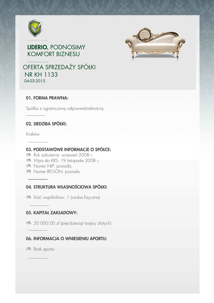 OFERTA SPRZEDAŻY SPÓŁKI NR KH 1133