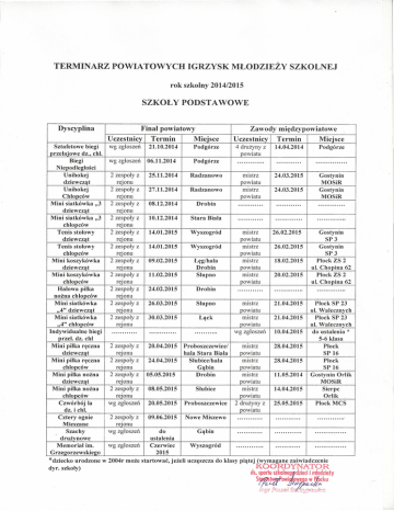 TERMINARZ POWIATOWYCH IGRZYSK MŁODZIEŻY SZKOLNEJ rok szkolny 201412015 SZKOŁ Y PODSTAWOWE Dyscyplina Sztafetowe biegi przełai owe dz., chI. Biegi Niepodległości Unihokej dziewcząt Unihokej Chłopców Mini siatkówka ,,3 dziewcząt Mini siatkówka ,,3 chłopców Tenis stołowy dziewcząt Tenis stołowy chłopców Mini koszykówka dziewcząt Mini koszykówka chłopców Halowa piłka nożna chłopców Mini siatkówka ,,4" dziewcząt Mini siatkówka ,,4" chłopców Indywidualne biegi przeł. dz. chł Mini piłka ręczna dziewcząt Mini piłka ręczna chłopców Mini piłka nożna dziewcząt Mini piłka nożna chłopców Czwórbój la dz. i chI. Cztery ognie Mieszane Szachy drużynowe Memoriał im. Grzegorzewskiego "dziecko urodzone w dyr. szkoły) Finał powiatowy Zawody międzypowiatowe Uczestnicy Termin Miejsce Uczestnicy Termin Miejsce wg zgłoszeń 21.10.2014 Podgórze 4 drużyny z .powiatu 14.04.2014 Podgórze wg zgłoszeń 06.11.2014 Podgórze ............. ............ ............... 2 zespoły rejonu 2 zespoły rejonu 2 zespoły rejonu 2 zespoły rejonu 2 zespoły rejonu 2 zespoły rejonu 2 zespoły rejonu 2. zespoły rejonu 2 zespoły rejonu 2 zespoły rejonu 2 zespoły rejonu z 25.11.2014 Radzanowo 24.03.2015 z 27.11.2014 Radzanowo mistrz powiatu mistrz powiatu z 08.12.2014 Drobin ............ Gostynin MOSiR Gostynin MOSiR ............ ............. z 10.12.2014 Stara Biała ............ ............. .............. z 14.01.2015 Wyszogród z 14.01.2015 Wyszogród z 09.02.2015 z 11.02.2015 Łęg/hala Drobin Słup no mistrz powiatu mistrz powiatu mistrz powiatu mistrz powiatu z 24.02.2015 Drobin ............ .............. .............. z 26.03.2015 Słup no 21.04.2015 z 30.03.2015 Łąck ............ ............. ........... mistrz powiatu mistrz powiatu wg zgłoszeń 2 zespoły z rejonu 2 zespoły z rejonu 2 zespoły z rejonu 2 zespoły z rejonu wg zgłoszeń 20.04.2015 05.05.2015 Proboszczewice/ hala Stara Biała Słubice/hala Gabin Drobin 08.05.2015 Słubice 25.05.2015 Płock SP 23 ul. Walecznych Płock SP 23 ul. Walecznych do ustalenia * 5-6 klasa Płock SP 16 Płock SP 16 Gostynin Orlik MOSiR Sierpc Orlik Płock MCS ............ ............. 2 zespoły z rejonu wg zgłoszeń 24.04.2015 20.05.2015 Proboszczewice 09.06.2015 Nowe Miszewo 24.03.2015 26.02.2015 26.02.2015 18.02.2015 20.02.2015 mistrz powiatu mistrz powiatu mistrz powiatu mistrz powiatu 2 drużyny z powiatu ............ 21.04.2015 10.04.2015 28.04.2015 28.04.2015 11.05.2014 14.04.2015 Gostynin SP3 Gostynin SP3 Płock ZS ul. Chopina Płock ZS ul. Chopina 2 62 2 62 do Gąbin ............ ............. ............... ustalenia wg zgłoszeń Czerwiec Wyszogród ............. ............ ............... 2015 2004r może startować, jeżeli uczęszcza do klasy piątej(wyma~n.!. zaświadczenie KOOHUYNATOR ds. Sportu slkolne;dZied i młodzieży SłJłW5tw&Powi rro~e o w Plocku (1'"Z;tf - . l. ",,4[b. rr.gr ?2.!JJel S' 2y:;a'-!JY:2
