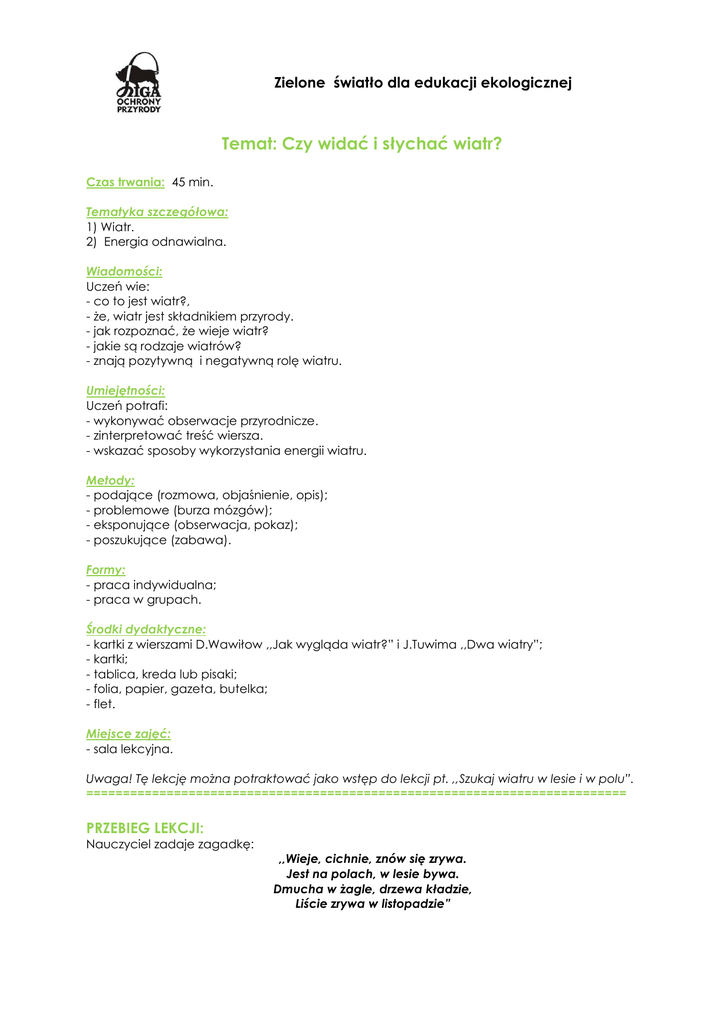 Zielone światło dla edukacji ekologicznej Temat: Czy widać i słychać wiatr? Czas trwania: 45 min. Tematyka szczegółowa: 1) Wiatr. 2) Energia odnawialna. Wiadomości: Uczeń wie: - co to jest wiatr?, - że, wiatr jest składnikiem przyrody. - jak rozpoznać, że wieje wiatr? - jakie są rodzaje wiatrów? - znają pozytywną i negatywną rolę wiatru. Umiejętności: Uczeń potrafi: - wykonywać obserwacje przyrodnicze. - zinterpretować treść wiersza. - wskazać sposoby wykorzystania energii wiatru. Metody: - podające (rozmowa, objaśnienie, opis); - problemowe (burza mózgów); - eksponujące (obserwacja, pokaz); - poszukujące (zabawa). Formy: - praca indywidualna; - praca w grupach. Środki dydaktyczne: - kartki z wierszami D.Wawiłow ,,Jak wygląda wiatr?” i J.Tuwima ,,Dwa wiatry”; - kartki; - tablica, kreda lub pisaki; - folia, papier, gazeta, butelka; - flet. Miejsce zajęć: - sala lekcyjna. Uwaga! Tę lekcję można potraktować jako wstęp do lekcji pt. ,,Szukaj wiatru w lesie i w polu”. ========================================================================== PRZEBIEG LEKCJI: Nauczyciel zadaje zagadkę: ,,Wieje, cichnie, znów się zrywa. Jest na polach, w lesie bywa. Dmucha w żagle, drzewa kładzie, Liście zrywa w listopadzie” Ustalenie odpowiedzi na pytanie - co to jest wiatr? Nauczyciel po wysłuchaniu odpowiedzi uczniów może podać definicje wiatru: ,,Wiatr jest jednym ze składników przyrody. Jest to ruch powietrza powstający w wyniku nierównomiernego nagrzewania się powietrza. Energia wiatru jest zróżnicowana pod względem prędkości mas powietrza. Wiatr może być łagodny, albo bardzo silny.” Nauczyciel może również zadać pytanie : jakie są jeszcze inne składniki przyrody? Podział na przyrodę ożywioną i nieożywioną. Podział uczniów na 2 grupy, omówienie zasad pracy w grupach nad zadanym problemem. - I grupa ma zastanowić się jak wygląda wiatr – dostaje wiersz D. Wawiłow ,,Jak wygląda wiatr”. Dzieci wykonują pracę farbami na papierze. Danuta Wawiłow „Jak wygląda wiatr?” Jak wygląda wiatr? Bardzo chciałbym wiedzieć! Możesz mi powiedzieć, jak wygląda wiatr? Może to jest ptak, co ma gniazdo w chmurach? Wielki jest jak góra, kiedy gubi pióra, z nieba sypie grad... Jak wygląda wiatr? Może to jest koń? Grzywę ma z płomieni, drzewa niby trawy chylą się ku ziemi, kiedy mknie przez świat... Jak wygląda wiatr? Może to jest chłopak, co ma osiem lat? Biega pośród nocy, gwiżdże, strzela z procy, piaskiem sypie w oczy... Jak wygląda wiatr? - II grupa otrzymuje wiersz J. Tuwima ,,Dwa wiatry” i ma za zadanie zastanowić się jak można przedstawić za pomocą dźwięku głos wiatru (lekkiego wiaterka, dużego wiatru, wichury)? Dzieci wykorzystują takie przedmioty jak folia, papier, gazeta, butelka, flet. Julian Tuwim „Dwa wiatry” Jeden wiatr - w polu wiał, Drugi wiatr - w sadzie grał: Cichuteńko, leciuteńko, Liście pieścił i szeleścił, Mdlał… Jeden wiatr - pędziwiatr! Fiknął kozła, plackiem spadł, Skoczył, zawiał, zaszybował, Świdrem w górę zakołował I przewrócił się, i wpadł Na szumiący senny sad, Gdzie cichutko i leciutko Liście pieścił i szeleścił Drugi wiatr… Sfrunął śniegiem z wiśni kwiat, Parsknął śmiechem cały sad, Wziął wiatr brata za kamrata, Teraz z nim po polu lata, Gonią obaj chmury, ptaki, Mkną, wplątują się w wiatraki, Głupkowate mylą śmigi, W prawo, w lewo, świst, podrygi, Dmą płucami ile sił, Łobuzują, pal je licho!... A w sadzie cicho, cicho… Po wydaniu polecenia przez nauczyciela, dzieci rozpoczynają pracę w grupach nad zadanym problemem (dzieci można podzielić na mniejsze np. 2-3 osobowe grupy). Następnie nauczyciel podsumowuje z uczniami wyniki ich pracy. Zabawa słowna - łączenie wyrazów w pary. Dzieci otrzymują na kartkach pojedyncze wyrazy. Mają za zadanie połączyć je w pary: gwałtowny / wicher / łagodny / wiaterek / ciepły / wietrzyk / niebezpieczny / huragan / Dyskusja nad pozytywną i negatywną rolą wiatru. Nauczyciel na tablicy po dwóch jej stronach umieszcza napisy: „pozytywna rola”, „negatywna rola” i rozdaje dzieciom rysunki np.: żaglówki, nasionek drzew, balonu, wiatraka, latawca, windsurfingu, połamanych drzew, szybowca, położonego zboża, domu z zerwanym dachem, ptaka, osy, elektrowni wiatrowej, połamanych gałęzi leżących na ulicy, lawiny w górach itd. Dzieci umieszczają na tablicy po odpowiednich stronach otrzymane rysunki. Zabawa daje okazję do dyskusji na temat roli wiatru, rodzajów wiatru, sposobów wykorzystania energii wiatru. Nauczyciel na tablice pisze słowo – wiatr, a uczniowie dopisują określenia do wiatru (metoda skojarzeń) np. wieje, dmucha, zacina, silny, halny, kołysze drzewami, strąca liście itd.