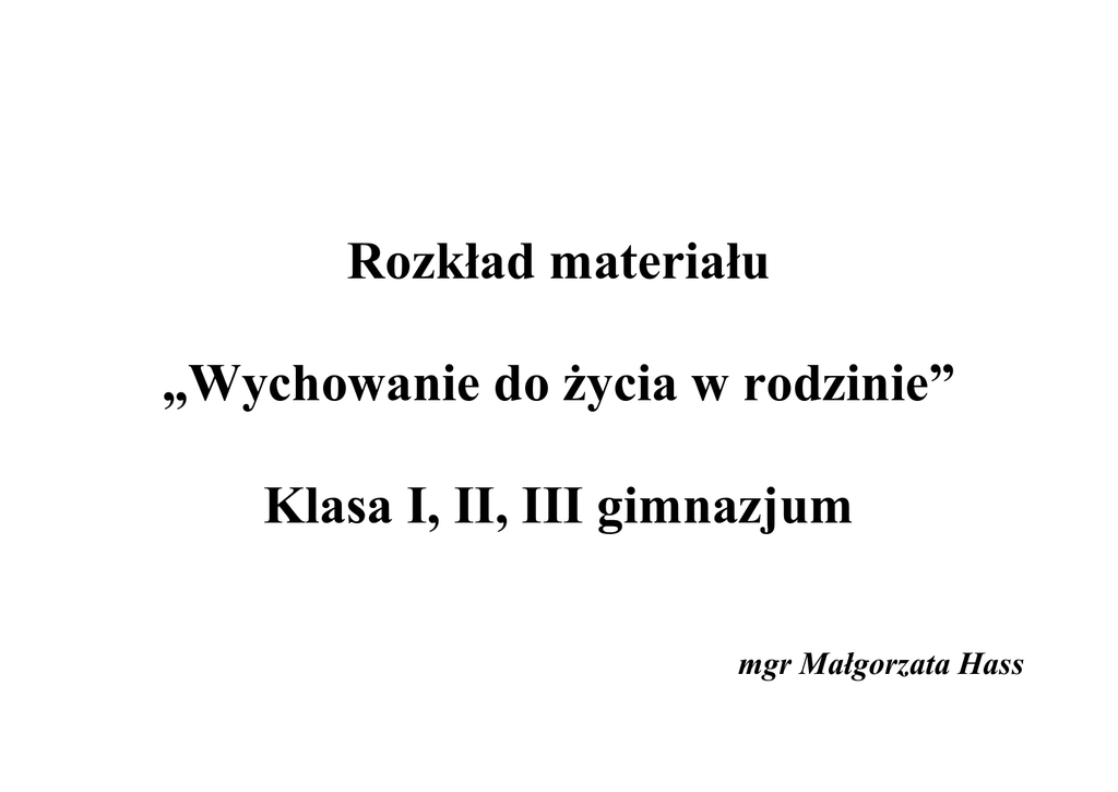 Rozkład materiału „Wychowanie do życia w rodzinie” Klasa I, II, III gimnazjum mgr Małgorzata Hass Klasa I Temat 1. Wychowanie do życia w rodzinie w nauczaniu szkolnym Cele i zadania Osiągnięcia 1. Czas adolescencji – okresem burzliwych przemian i procesów zachodzących Podręcznik, ćwiczenia i inne pomoce dydaktyczne – ich przydatność w pracy na lekcjach w organizmie młodego człowieka 2. Celowość tych przemian w perspektywie człowieka dojrzałego, który w życiu dorosłym się najczęściej na założenie rodziny. 3. Potrzeba przygotowania się do podjęcia ważnych życiowych ról: męża, żony, ojca, matki. Udział rodziny i szkoły w tym przygotowaniu. 4. Oczekiwania uczniów związane z zajęciami WdŻwR. 5. Pytania i wątpliwości oraz potrzeby uczniów; możliwości pomocy w szkole i poza nią. 6. Tematyka zajęć zaplanowana w klasie I, liczba godzin, sposoby realizacji zajęć oraz gratyfikacji za aktywność i pracę na zajęciach WdŻwR. 7. Podręcznik, ćwiczenia i inne pomoce dydaktyczne – ich przydatność w pracy na lekcjach zna treści będące przedmiotem zajęć w klasie I, zna zasób środków i pomocy dydaktyczne, kształtuje umiejętności interpersonalne, werbalizuje swoje oczekiwania wobec zajęć WdŻwR 2. O sprawną komunikację w rodzinie 3. Moje potrzeby i uczucia 4. Więzi rodzinne i konflikty międzypokoleniowe 5. Rodzina niepełna. Poradnictwo młodzieżowe i rodzinne 1. Dom rodzinny szkołą właściwej komunikacji: 2. Zasady dobrej komunikacji w rodzinie (wg F. Fischalecka) 3. Miłość rodziców, troska o dzieci i życiowe doświadczenie dorosłych – wartości, które warto wziąć pod uwagę zna zasady otwartego i jednoznacznego komunikowania się, zna najważniejsze czynniki kontaktu międzyludzkiego, potrafi podjąć działania usprawniające komunikację w rodzinie, stosuje zasady aktywnego słuchania 1. Potrzeby człowieka: elementarne, wyższe i najwyższe („piramida potrzeb” wg E. Sujak) 2. Rozróżnienie rodzajów uczuć swoich i innych ludzi. 3. Obawy i lęki, które utrudniają działanie i budzą poczucie bezpieczeństwa 4. Możliwości pomocy: poradnictwo młodzieżowe, telefony zaufania zna „piramidę potrzeb” człowieka według E. Sujaka, zna rodzaje uczuć w systemie hierarchicznym, nazywa swoje potrzeby i uczucia i wypowiada je poprzez komunikat „JA”usystematyzowuje swoje potrzeby 1. Tempo życia i rozwoju cywilizacyjnego pogłębia różnice międzypokoleniowe. 2.Potrzeba uczenia się rozwiązywania konfliktów 3. Pozytywne (wzmacniające więzi) i negatywne (osłabiające więzi) sposoby rozwiązywania konfliktów 4. Propozycja „sześciu kroków” T. Gordona – modelowe rozwiązywanie sytuacji konfliktowych 5. Wzmacnianie więzi rodzinnych przez rozwijanie poczucia bezpieczeństwa, akceptację, zaufanie, budowanie świata wartości, właściwą komunikację i odpowiedzialne decyzje Wie, że rodzina stanowi oparcie i daje poczucie bezpieczeństwa, wie jak łagodzić konflikty lub unikać „konfliktów pokoleń”, potrafi określić przyczyny konfliktów pomiędzy rodzicami i dziećmi, przewiduje sytuacje, które mogą doprowadzić do konfliktów, potrafi rozwiązywać konflikty korzystając ze wskazówek T. Gordona 1. Powody powstawania rodzin niepełnych. 2.Problemy emigracji zarobkowej i eurosieroctwa. 3. Sytuacja dzieci, które nie mają wpływu na decyzje rodziców. 4. Budowanie „czynników ochronnych”, gdy rodzina jest niepełna. zna powody sytuacji, w których rodzina staje się niepełna, zna sposoby wypracowania „czynników ochronnych”, gdy młody człowieka odczuwa dyskomfort lub cierpi w rodzinie niepełnej, 5. Możliwości pomocy w sytuacjach trudnych i informacje o sposobach dotarcia do odpowiednich placówek i specjalistów. zna placówki, organizacje i stowarzyszenia, których celem jest pomoc psychologiczna, potrafi odnaleźć adresy, telefony, strony www i zwrócić się o ewentualna pomoc, wzmacnia siebie i więź rodzinną, mimo iż żyje w rodzinie niepełnej 1. Złożoność człowieka: zmysły, uczucia, intelekt (rozum), wola i duchowość. 2. Kryteria dojrzałości biologicznej, psychicznej, intelektualnej, moralnej, duchowej, społecznej i prawnej 3. Samowychowanie jako niezbędny element osiągania dojrzałości w powyższych płaszczyznach. zna płaszczyzny funkcjonowania człowieka, zna przemiany zachodzące w okresie dojrzewania, opisuje złożoność procesu dojrzewania i trudności związane z rozwojem poszczególnych płaszczyzn osobowości 7. Przejawy dojrzałości biologicznego dziewcząt 1. Hormonalna regulacja procesów rozrodczych. 2. Charakterystyczne zmiany zachodzące w organizmie dziewczyny w okresie pokwitania. 3. Krótka prezentacja zmian zachodzących w organizmie dojrzewającego chłopca. zna hormonalną regulację procesów rozrodczych kobiety i mężczyzny, zna charakterystyczne zmiany zachodzące w ciele dziewczyny w okresie adolescencji, potrafi dbać o właściwą higienę i zdrowie w okresie dojrzewania 8. Przejawy dojrzałości biologicznego chłopców 1. Hormonalna regulacja procesów rozrodczych. 2. Charakterystyczne zmiany zachodzące w organizmie chłopca w okresie pokwitania, ich funkcje w perspektywie ojcostwa. 3. Krótka prezentacja zmian zachodzących w organizmie dojrzewającej dziewczyny i ich celowość zna hormonalną regulację procesów rozrodczych kobiety i mężczyzny, zna charakterystyczne zmiany zachodzące w ciele chłopca w okresie adolescencji, potrafi dbać o właściwą higienę i zdrowie w okresie dojrzewania 1. Typowe problemy dziewcząt w okresie adolescencji: labilność emocjonalna, kłopoty z akceptacją swojego wyglądu, anoreksja i bulimia, głód „miłości”, bezkrytyczne uleganie modzie. 2. Poszukiwanie możliwych rozwiązań i dróg wyjścia z zna typowe problemy i trudności występujące u dziewcząt w okresie dojrzewania oraz zagrożenie, wynikające z jej nieświadomości, zna niezbędne adresy