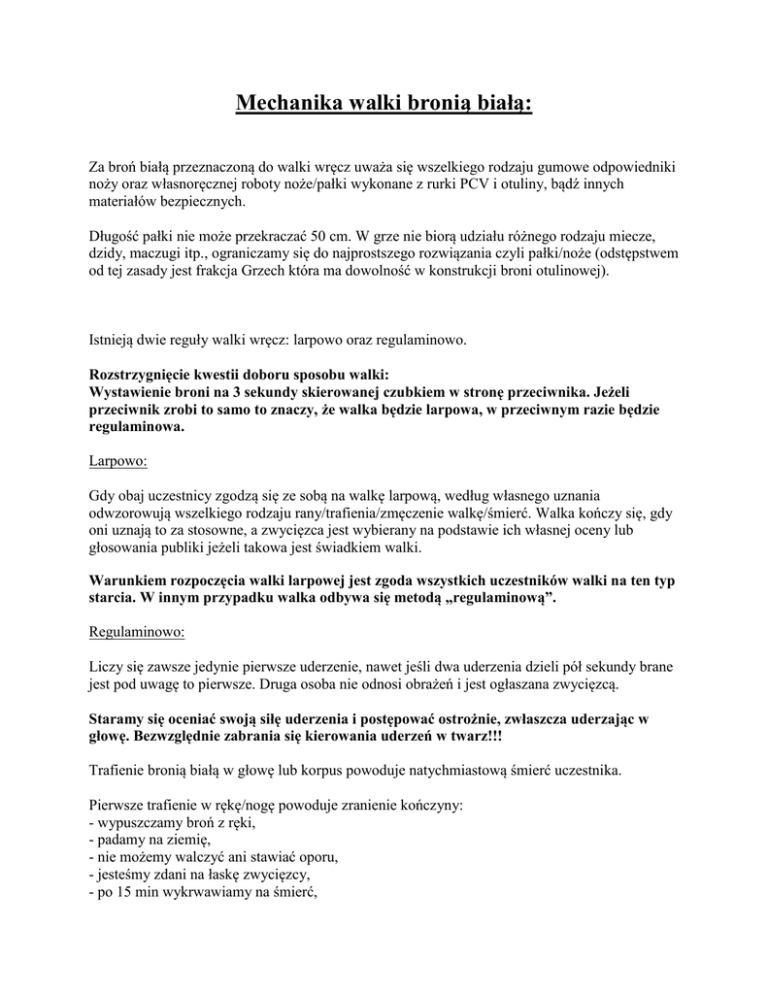 Mechanika walki bronią białą: Za broń białą przeznaczoną do walki wręcz uważa się wszelkiego rodzaju gumowe odpowiedniki noży oraz własnoręcznej roboty noże/pałki wykonane z rurki PCV i otuliny, bądź innych materiałów bezpiecznych. Długość pałki nie może przekraczać 50 cm. W grze nie biorą udziału różnego rodzaju miecze, dzidy, maczugi itp., ograniczamy się do najprostszego rozwiązania czyli pałki/noże (odstępstwem od tej zasady jest frakcja Grzech która ma dowolność w konstrukcji broni otulinowej). Istnieją dwie reguły walki wręcz: larpowo oraz regulaminowo. Rozstrzygnięcie kwestii doboru sposobu walki: Wystawienie broni na 3 sekundy skierowanej czubkiem w stronę przeciwnika. Jeżeli przeciwnik zrobi to samo to znaczy, że walka będzie larpowa, w przeciwnym razie będzie regulaminowa. Larpowo: Gdy obaj uczestnicy zgodzą się ze sobą na walkę larpową, według własnego uznania odwzorowują wszelkiego rodzaju rany/trafienia/zmęczenie walkę/śmierć. Walka kończy się, gdy oni uznają to za stosowne, a zwycięzca jest wybierany na podstawie ich własnej oceny lub głosowania publiki jeżeli takowa jest świadkiem walki. Warunkiem rozpoczęcia walki larpowej jest zgoda wszystkich uczestników walki na ten typ starcia. W innym przypadku walka odbywa się metodą „regulaminową”. Regulaminowo: Liczy się zawsze jedynie pierwsze uderzenie, nawet jeśli dwa uderzenia dzieli pół sekundy brane jest pod uwagę to pierwsze. Druga osoba nie odnosi obrażeń i jest ogłaszana zwycięzcą. Staramy się oceniać swoją siłę uderzenia i postępować ostrożnie, zwłaszcza uderzając w głowę. Bezwzględnie zabrania się kierowania uderzeń w twarz!!! Trafienie bronią białą w głowę lub korpus powoduje natychmiastową śmierć uczestnika. Pierwsze trafienie w rękę/nogę powoduje zranienie kończyny: - wypuszczamy broń z ręki, - padamy na ziemię, - nie możemy walczyć ani stawiać oporu, - jesteśmy zdani na łaskę zwycięzcy, - po 15 min wykrwawiamy na śmierć, - ogółem zasady są identyczne jak w przypadku zasad trafienia z ASG oraz leczenia. Drugie trafienie w kończynę powoduje natychmiastową śmierć. W przypadku sytuacji konfliktowej zarówno w walce larpowej jak i regulaminowej odwołujemy się kolejno do metody: - papier kamień nożyce (krótka gra i mamy zwycięzcę), - głosu publiczności (często któtki komentarz neutralnego obserwatora ułatwia wyłonienie zwycięzcy), - decyzji orga (staramy się nie doprowadzać do tej sytuacji… to tylko gra…). Uwaga!!! Pamiętamy, że jest to przede wszystkim zabawa, bezwzględnie zabrania się wyprowadzania „pchnięć” bronią białą. Jedyne dozwolone ciosy przy pomocy broni to cięcia i uderzenia. Pamiętamy aby nie przesadzać z siłą uderzenia i nie celować w głowę (uderzenia w to miejsce potrafią być wyjątkowo bolesne).