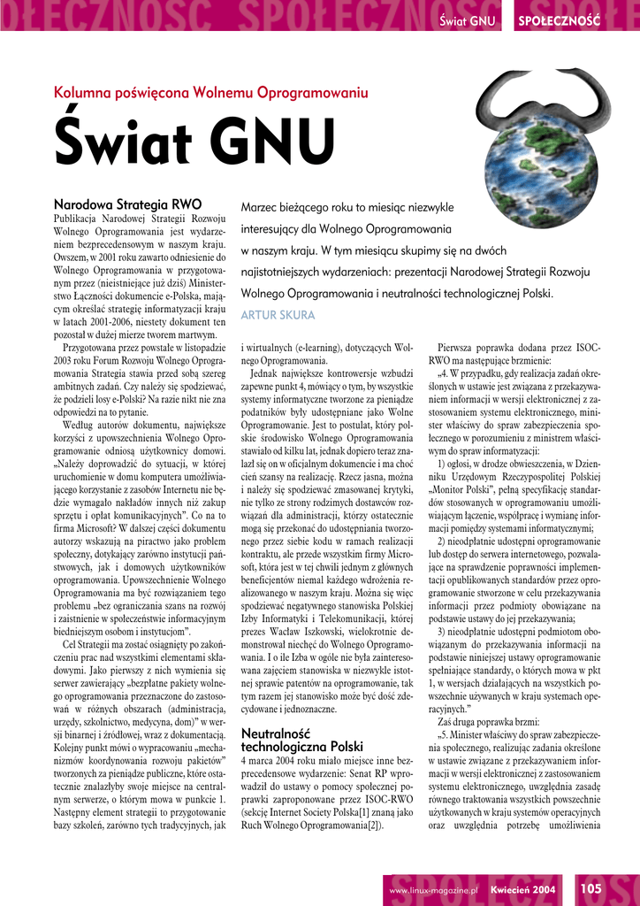 Świat GNU SPOŁECZNOŚĆ Kolumna poświęcona Wolnemu Oprogramowaniu Świat GNU Narodowa Strategia RWO Publikacja Narodowej Strategii Rozwoju Wolnego Oprogramowania jest wydarzeniem bezprecedensowym w naszym kraju. Owszem, w 2001 roku zawarto odniesienie do Wolnego Oprogramowania w przygotowanym przez (nieistniejące już dziś) Ministerstwo Łączności dokumencie e-Polska, mającym określać strategię informatyzacji kraju w latach 2001-2006, niestety dokument ten pozostał w dużej mierze tworem martwym. Przygotowana przez powstałe w listopadzie 2003 roku Forum Rozwoju Wolnego Oprogramowania Strategia stawia przed sobą szereg ambitnych zadań. Czy należy się spodziewać, że podzieli losy e-Polski? Na razie nikt nie zna odpowiedzi na to pytanie. Według autorów dokumentu, największe korzyści z upowszechnienia Wolnego Oprogramowanie odniosą użytkownicy domowi. „Należy doprowadzić do sytuacji, w której uruchomienie w domu komputera umożliwiającego korzystanie z zasobów Internetu nie będzie wymagało nakładów innych niż zakup sprzętu i opłat komunikacyjnych”. Co na to firma Microsoft? W dalszej części dokumentu autorzy wskazują na piractwo jako problem społeczny, dotykający zarówno instytucji państwowych, jak i domowych użytkowników oprogramowania. Upowszechnienie Wolnego Oprogramowania ma być rozwiązaniem tego problemu „bez ograniczania szans na rozwój i zaistnienie w społeczeństwie informacyjnym biedniejszym osobom i instytucjom”. Cel Strategii ma zostać osiągnięty po zakończeniu prac nad wszystkimi elementami składowymi. Jako pierwszy z nich wymienia się serwer zawierający „bezpłatne pakiety wolnego oprogramowania przeznaczone do zastosowań w różnych obszarach (administracja, urzędy, szkolnictwo, medycyna, dom)” w wersji binarnej i źródłowej, wraz z dokumentacją. Kolejny punkt mówi o wypracowaniu „mechanizmów koordynowania rozwoju pakietów” tworzonych za pieniądze publiczne, które ostatecznie znalazłyby swoje miejsce na centralnym serwerze, o którym mowa w punkcie 1. Następny element strategii to przygotowanie bazy szkoleń, zarówno tych tradycyjnych, jak Marzec bieżącego roku to miesiąc niezwykle interesujący dla Wolnego Oprogramowania w naszym kraju. W tym miesiącu skupimy się na dwóch najistotniejszych wydarzeniach: prezentacji Narodowej Strategii Rozwoju Wolnego Oprogramowania i neutralności technologicznej Polski. ARTUR SKURA i wirtualnych (e-learning), dotyczących Wolnego Oprogramowania. Jednak największe kontrowersje wzbudzi zapewne punkt 4, mówiący o tym, by wszystkie systemy informatyczne tworzone za pieniądze podatników były udostępniane jako Wolne Oprogramowanie. Jest to postulat, który polskie środowisko Wolnego Oprogramowania stawiało od kilku lat, jednak dopiero teraz znalazł się on w oficjalnym dokumencie i ma choć cień szansy na realizację. Rzecz jasna, można i należy się spodziewać zmasowanej krytyki, nie tylko ze strony rodzimych dostawców rozwiązań dla administracji, którzy ostatecznie mogą się przekonać do udostępniania tworzonego przez siebie kodu w ramach realizacji kontraktu, ale przede wszystkim firmy Microsoft, która jest w tej chwili jednym z głównych beneficjentów niemal każdego wdrożenia realizowanego w naszym kraju. Można się więc spodziewać negatywnego stanowiska Polskiej Izby Informatyki i Telekomunikacji, której prezes Wacław Iszkowski, wielokrotnie demonstrował niechęć do Wolnego Oprogramowania. I o ile Izba w ogóle nie była zainteresowana zajęciem stanowiska w niezwykle istotnej sprawie patentów na oprogramowanie, tak tym razem jej stanowisko może być dość zdecydowane i jednoznaczne. Neutralność technologiczna Polski 4 marca 2004 roku miało miejsce inne bezprecedensowe wydarzenie: Senat RP wprowadził do ustawy o pomocy społecznej poprawki zaproponowane przez ISOC-RWO (sekcję Internet Society Polska[1] znaną jako Ruch Wolnego Oprogramowania[2]). Pierwsza poprawka dodana przez ISOCRWO ma następujące brzmienie: „4. W przypadku, gdy realizacja zadań określonych w ustawie jest związana z przekazywaniem informacji w wersji elektronicznej z zastosowaniem systemu elektronicznego, minister właściwy do spraw zabezpieczenia społecznego w porozumieniu z ministrem właściwym do spraw informatyzacji: 1) ogłosi, w drodze obwieszczenia, w Dzienniku Urzędowym Rzeczypospolitej Polskiej „Monitor Polski”, pełną specyfikację standardów stosowanych w oprogramowaniu umożliwiającym łączenie, współpracę i wymianę informacji pomiędzy systemami informatycznymi; 2) nieodpłatnie udostępni oprogramowanie lub dostęp do serwera internetowego, pozwalające na sprawdzenie poprawności implementacji opublikowanych standardów przez oprogramowanie stworzone w celu przekazywania informacji przez podmioty obowiązane na podstawie ustawy do jej przekazywania; 3) nieodpłatnie udostępni podmiotom obowiązanym do przekazywania informacji na podstawie niniejszej ustawy oprogramowanie spełniające standardy, o których mowa w pkt 1, w wersjach działających na wszystkich powszechnie używanych w kraju systemach operacyjnych.” Zaś druga poprawka brzmi: „5. Minister właściwy do spraw zabezpieczenia społecznego, realizując zadania określone w ustawie związane z przekazywaniem informacji w wersji elektronicznej z zastosowaniem systemu elektronicznego, uwzględnia zasadę równego traktowania wszystkich powszechnie użytkowanych w kraju systemów operacyjnych oraz uwzględnia potrzebę umożliwienia www.linux-magazine.pl Kwiecień 2004 105 SPOŁECZNOŚĆ Świat GNU wszystkim podmiotom obowiązanym do przechowywania informacji w wersji elektronicznej, stosowania oprogramowania dostosowanego do używanych systemów informatycznych bez konieczności ponoszenia dodatkowych kosztów licencyjnych.”. Jak widzimy, w obu poprawkach mamy odniesienie do „powszechnie używanych systemów”, jednak ustawa nie określa,