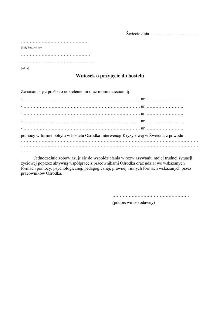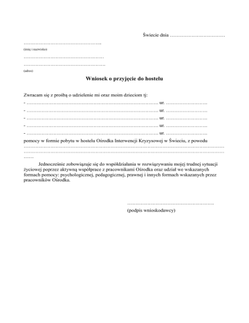 Świecie dnia …………………………… ……………………………………….. (imię i nazwisko) ………………………………………… …………………………………………. (adres) Wniosek o przyjęcie do hostelu Zwracam się z prośbą o udzielenie mi oraz moim dzieciom tj: - ……………………………………………………………………. ur. ……………………. - ……………………………………………………………………. ur. ……………………. - ……………………………………………………………………. ur. ……………………. - ……………………………………………………………………. ur. ……………………. - ……………………………………………………………………. ur. ……………………. pomocy w formie pobytu w hostelu Ośrodka Interwencji Kryzysowej w Świeciu, z powodu ………………………………………………………………………………………………………… ………………………………………………………………………………………………………… …… Jednocześnie zobowiązuje się do współdziałania w rozwiązywaniu mojej trudnej sytuacji życiowej poprzez aktywną współprace z pracownikami Ośrodka oraz udział we wskazanych formach pomocy: psychologicznej, pedagogicznej, prawnej i innych formach wskazanych przez pracowników Ośrodka. ……………………………………………. (podpis wnioskodawcy) …………………………………………….. (Miejscowość, data) ………………………………………………. (znak) SKIEROWANIE DO HOSTELU OŚRODKA INTERWENCJI KRYZYSOWEJ W ŚWIECIU Na podstawie § 3 pkt 2 porozumienia z dnia ………………. w sprawie kierowania mieszkańców Gminy Drzycim do hostelu Ośrodka Interwencji Kryzysowej, działającego przy Powiatowym Centrum Pomocy Rodzinie w Świeciu oraz po rozpatrzeniu wniosku Pani/ Pana ………………………………………….. z dnia ……………………………………. 1. Kieruję Panią/ Pana ………………………………………………………………. zam. ………………………………………………………….. w związku z wystąpieniem (opis problemu)…………………………………………………………………………………………… ………………………………………………………………………………………………………… oraz małoletnie dzieci: ……………………………… ……………………..ur. ……………………………. ……………………………… ……………………..ur. ……………………………. ……………………………… ……………………..ur. ……………………………. ……………………………… ……………………..ur. ……………………………. do hostelu Ośrodka Interwencji Kryzysowej w Świeciu. 2. Niniejsze skierowanie obowiązuje przez okres dwóch miesięcy od dnia przyjęcia, tj. od dnia ………………………………… do dnia ………………………………. 3. Jednocześnie zobowiązuje w/w do współdziałania w rozwiązywaniu trudnej sytuacji życiowej poprzez aktywną współprace z pracownikami Ośrodka oraz udział we wskazanych formach pomocy: psychologicznej, pedagogicznej, prawnej i innych formach wskazanych przez pracowników Ośrodka. 4. W uzasadnionych przypadkach może Pani/ Pan ubiegać się o przedłużenie pobytu w hostelu, jednak nie dłużej niż o kolejny miesiąc. Otrzymują: 1. Wnioskodawca 2. PCPR ul. Wojska Polskiego 195A, 86-100 Świecie 3. OIK ul. Sądowa 18, 86-100 Świecie 4. a/a Świecie dn. ………………………….. ……………………………………….. (imię i nazwisko) ………………………………………… …………………………………………. Ośrodek Pomocy Społecznej (adres) za pośrednictwem Kierownika Ośrodka Interwencji Kryzysowej Wniosek o przedłużenie pobytu w hostelu Zwracam się z prośbą o przedłużenie mi i moim dzieciom tj: - ……………………………………………………………………. ur. ……………………. - ……………………………………………………………………. ur. ……………………. - ……………………………………………………………………. ur. ……………………. - ……………………………………………………………………. ur. ……………………. pomocy w formie pobytu w hostelu Ośrodka Interwencji Kryzysowej w Świeciu. Prośbę swą motywuję tym, że ……………………………………………………………………………………………………… ………………………………………………………………………………………………………… ………………………………………………………………………………………………………… ………………………………………………………………………………………………………… …………… Jednocześnie zobowiązuje się do współdziałania w rozwiązywaniu mojej trudnej sytuacji życiowej poprzez aktywną współprace z pracownikami Ośrodka oraz udział we wskazanych formach pomocy: psychologicznej, pedagogicznej, prawnej i innych formach wskazanych przez pracowników Ośrodka. ……………………………………………. (podpis wnioskodawcy) Wyrażam zgodę na przedłużenie pobytu w hostelu Uzasadnienie ………………………………………………………………………………………………………… ………………………………………………………………………………………………………… ……………………