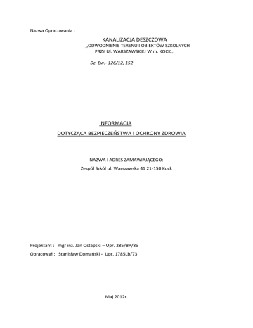 Nazwa Opracowania : KANALIZACJA DESZCZOWA ,,ODWODNIENIE TERENU I OBIEKTÓW SZKOLNYCH PRZY Ul. WARSZAWSKIEJ W m. KOCK,, Dz. Ew.- 126/12, 152 INFORMACJA DOTYCZĄCA BEZPIECZEOSTWA I OCHRONY ZDROWIA NAZWA I ADRES ZAMAWIAJĄCEGO: Zespół Szkół ul. Warszawska 41 21-150 Kock Projektant : mgr inż. Jan Ostapski – Upr. 285/BP/85 Opracował : Stanisław Domaoski - Upr. 1785Lb/73 Maj 2012r. Spis treści informacji dotyczącej bezpieczeostwa i ochrony zdrowia 1. 2. 3. 4. 5. 6. 7. 8. 9. Podstawa opracowania Materiały wyjściowe Zakres robót oraz kolejnośd realizacji Wykaz istniejących obiektów budowlanych Wykaz istniejących elementów zagospodarowania działki i terenu budowy, które mogą stwarzad zagrożenie bezpieczeostwa i zdrowia ludzi Przewidywane zagrożenia występujące podczas realizacji robót Wskazania sposobu prowadzenia instruktażu pracowników przed przystąpieniem do realizacji robót szczególnie niebezpiecznych Środki techniczne i organizacyjne zapobiegające niebezpieczeostwu wynikającym z wykonywania robót w strefach szczególnego zagrożenia zdrowia lub w ich sąsiedztwie Podstawa prawna 1. Podstawa opracowania Informacja dotycząca bezpieczeostwa i ochrony zdrowia w czasie realizacji budowy kanalizacji deszczowej i odwodnienia terenu i obiektów szkolnych w Nr Ew. 126/12, 152 przy ul. Warszawskiej w Kocku, stanowi załącznik do projektu budowlanego zgodnie z Rozporządzeniem Ministra Infrastruktury z dnia 23.06.2003 roku w sprawie informacji dotyczącej bezpieczeostwa i ochrony zdrowia. 2. Materiały wyjściowe Informację opracowano w oparciu o następujące materiały: - projekt budowlany sieci deszczowej w ul. Przechodniej w Kocku. - Rozporządzeniem Ministra Infrastruktury z dnia 23.06.2003 roku w sprawie informacji dotyczącej bezpieczeostwa i ochrony zdrowia oraz planu bezpieczeostwa i ochrony zdrowia (Dz. U. 120/2003). 3. Zakres robót oraz kolejnośd realizacji Projekt budowlany obejmuje budowę kanalizacji deszczowej i odwodnienia terenu i obiektów szkolnych w terenie działki Nr Ew. 126/12, 152 od istniejącej studni deszczowej na sieci w ul. Przechodniej do projektowanego układu rurociągów odwadniających teren, drenażu opaskowego i odprowadzenia wód opadowych z dachów obiektów szkolnych. oznaczonych w projekcie na projekcie zagospodarowania terenu. W ramach budowy wykonany zostanie : - kanalizacja deszczowa wraz z przykanalikami do osadników deszczowych przy rurach spustowych rynien dachowych. - drenaż opaskowy odwadniający teren wokół budynków szkolnych i piwnic - drenaż części terenu boiska szkolnego Kanalizacja deszczowa i drenaż wykonane będą z rur przewodowych PVC-U SN8 typ S /SDR34 /łączonych kielichowo na uszczelki gumowe. Łączna długośd projektowanej kanalizacji wynosi: PVC-U 250/7,3 – 128,00 mb PVC-U 200//5,9 – 63,50 mb PVC-U 160//4,7 - 36,20 mb PVC-U 110/3,7 – 134,20 mb Rury drenarskie z filtrem syntetycznym Dz/Dw – 126/113 – 207,50 mb - 160/145 – 30,30 mb Uzbrojenie sieci kanalizacyjnej i odwodnienia opaskowego budynków i zieleoców boiska sportowego stanowid będą : - studzienki kanalizacyjne betonowe ø 1000 z włazem żeliwnym typ ciężki B-125 – 6,0 szt. - studzienki inspekcyjne drenarskie z rur karbowanych PCV 315, z pokrywą żeliwną A 15 a/ bez osadnika – 7,00 szt. b/ z osadnikiem – 3,00 szt. - osadniki deszczowe typ ,,MAREYA,, - 20,0 szt. Wykopy pod rurociągi kanalizacyjne o głębokości ponad 1,10 m od powierzchni terenu przewidziano jako wąsko przestrzenne o ścianach pionowych w umocnieniu szalunkowym. W rejonach istniejącego uzbrojenia wszelkie roboty ziemne należy wykonywad wyłącznie sposobem ręcznym zachowując szczególną ostrożnośd aby nie uszkodzid. Przy wykonywaniu robót zachowad warunki i uzgodnienia zawarte w opinii ZUD i w jednostkach uzgadniających projekt techniczny. Roboty przy budowie kanalizacji należy rozpocząd od włączenia przewiertem do istniejącej studni na kanale istniejącym w ul. Przechodniej. 4. Wykaz istniejących obiektów budowlanych Kanalizacja deszczowa wykonywana będzie w znacznej części w terenie Inwestora na działce Nr 126/12 i 152 w ulicy Przechodniej. Włączenie projektowanej kanalizacji do studzienki w ul. Przechodniej nastąpi w części przewiertem pod jezdnią i chodnikiem. W związku z tym będzie ograniczony ruch ul. Przechodnią. 5. Wykaz istniejących elementów zagospodarowania działki i terenu budowy, które mogą stwarzad zagrożenie bezpieczeostwa i zdrowia ludzi. Realizacja projektu budowlanego kanalizacji nie przewiduje elementów zagospodarowania terenu, które mogą stwarzad zagrożenie bezpieczeostwa i zdrowia ludzi. Przed rozpoczęciem robót Wykonawca winien uzyskad zgodę na wejście w teren ul. Przechodniej do wykonywania robót i przestrzegad warunki i ustalenia właściciela ulicy. 6. Przewidywane zagrożenia występujące podczas realizacji robót Zagrożenia, które mogą wystąpid podczas prowadzenia robót przy realizacji kanalizacji stwarzające ryzyko dla bezpieczeostwa i zdrowia ludzi to: wykonanie wykopów pod kanalizację o głębokości większej niż 1,0 przewidziano zabezpieczyd szalunkami systemowymi typ ,, Podlasie,, lub równorzędnymi zabezpieczającymi pracowników przed osunięciem i przysypania ziemią. wykonywanie robót w pobliżu linii i kabli elektroenergetycznych, telefonicznych i wodociągowych – zagrożenie porażenia prądem. wykonywanie robót w pasach ciągów komunikacyjnych lub w najbliższym ich sąsiedztwie – zagrożenie ruchem pojazdów przejścia i przejazdy w pobliżu wykopów – zagrożenie dla ludzi osunięcie się skarp wykopu. wykonywanie przewiertów pod chodnikiem i częścią ulicy – praca przy urządzeniach hydraulicznych Wyżej wymienione zagrożenia mogą występowad podczas realizacji całego zakresu robót zadania inwestycyjnego. 7. Wskazania sposobu prowadzenia instruktażu pracowników przed przystąpieniem do realizacji robót szczególnie niebezp