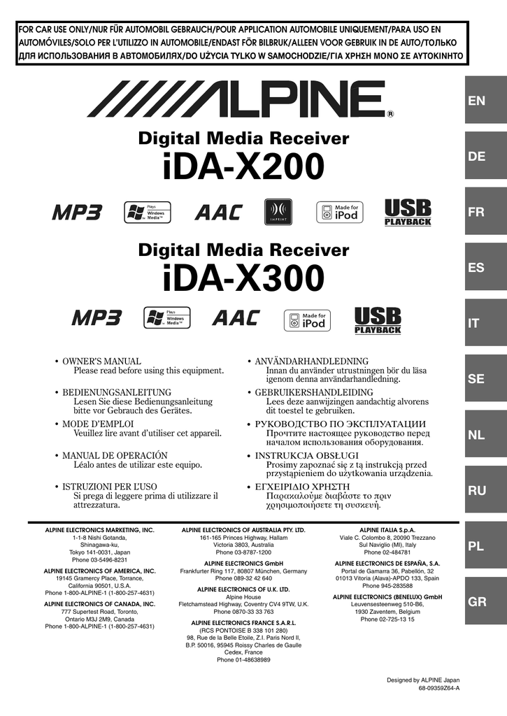 FOR CAR USE ONLY/NUR FÜR AUTOMOBIL GEBRAUCH/POUR APPLICATION AUTOMOBILE UNIQUEMENT/PARA USO EN AUTOMÓVILES/SOLO PER L’UTILIZZO IN AUTOMOBILE/ENDAST FÖR BILBRUK/ALLEEN VOOR GEBRUIK IN DE AUTO/ТОЛЬКО ДЛЯ ИСПОЛЬЗОВАНИЯ В АВТОМОБИЛЯХ/DO UŻYCIA TYLKO W SAMOCHODZIE/ΓΙΑ ΧΡΗΣΗ ΜΟΝΟ ΣΕ ΑΥΤΟΚΙΝΗΤΟ EN R Digital Media Receiver EN iDA-X200 DE FR Digital Media Receiver ES iDA-X300 IT • OWNER’S MANUAL Please read before using this equipment. • ANVÄNDARHANDLEDNING Innan du använder utrustningen bör du läsa igenom denna användarhandledning. • BEDIENUNGSANLEITUNG Lesen Sie diese Bedienungsanleitung bitte vor Gebrauch des Gerätes. • GEBRUIKERSHANDLEIDING Lees deze aanwijzingen aandachtig alvorens dit toestel te gebruiken. • MODE D’EMPLOI Veuillez lire avant d’utiliser cet appareil. • РУКОВОДСТВО ПО ЭКСПЛУАТАЦИИ • MANUAL DE OPERACIÓN Léalo antes de utilizar este equipo. • INSTRUKCJA OBSŁUGI • ISTRUZIONI PER L’USO Si prega di leggere prima di utilizzare il attrezzatura. • ΕΓΧΕΙΡΙ∆ΙΟ ΧΡΗΣΤΗ ALPINE ELECTRONICS MARKETING, INC. 1-1-8 Nishi Gotanda, Shinagawa-ku, Tokyo 141-0031, Japan Phone 03-5496-8231 ALPINE ELECTRONICS OF AMERICA, INC. 19145 Gramercy Place, Torrance, California 90501, U.S.A. Phone 1-800-ALPINE-1 (1-800-257-4631) ALPINE ELECTRONICS OF CANADA, INC. 777 Supertest Road, Toronto, Ontario M3J 2M9, Canada Phone 1-800-ALPINE-1 (1-800-257-4631) Прочтите настоящее руководство перед началом использования оборудования. SE NL Prosimy zapoznać się z tą instrukcją przed przystąpieniem do użytkowania urządzenia. Παρακαλούµε διαβάστε το πριν χρησιµοποιήσετε τη συσκευή. ALPINE ELECTRONICS OF AUSTRALIA PTY. LTD. 161-165 Princes Highway, Hallam Victoria 3803, Australia Phone 03-8787-1200 ALPINE ITALIA S.p.A. Viale C. Colombo 8, 20090 Trezzano Sul Naviglio (MI), Italy Phone 02-484781 ALPINE ELECTRONICS GmbH Frankfurter Ring 117, 80807 München, Germany Phone 089-32 42 640 ALPINE ELECTRONICS DE ESPAÑA, S.A. Portal de Gamarra 36, Pabellón, 32 01013 Vitoria (Alava)-APDO 133, Spain Phone 945-283588 ALPINE ELECTRONICS OF U.K. LTD. Alpine House Fletchamstead Highway, Coventry CV4 9TW, U.K. Phone 0870-33 33 763 ALPINE ELECTRONICS FRANCE S.A.R.L. (RCS PONTOISE B 338 101 280) 98, Rue de la Belle Etoile, Z.I. Paris Nord Il, B.P. 50016, 95945 Roissy Charles de Gaulle Cedex, France Phone 01-48638989 ALPINE ELECTRONICS (BENELUX) GmbH Leuvensesteenweg 510-B6, 1930 Zaventem, Belgium Phone 02-725-13 15 Designed by ALPINE Japan 68-09359Z64-A RU PL GR WYŁĄCZNY DYSTRYBUTOR HORN DISTRIBUTION S.A. UL. KURANTÓW 34 02-873 WARSZAWA TEL.: 0800 88 88 90 FAX.: 0-22 331-55-00 WWW.ALPINE.COM.PL Centralny serwis: ul. Kurantów 34, 02-873 Warszawa, tel. 22/331 55 33, [email protected] POLSKI Spis treści Instrukcja obsługi OSTRZEŻENIE OSTRZEŻENIE ......................................... 3 PRZESTROGA ......................................... 3 ŚRODKI OSTROŻNOŚCI ......................... 3 Działanie pokrętło dwufunkcyjne (tylko iDA-X200) Czynności wstępne Lista akcesoriów ............................................. 6 Włączanie i wyłączenie zasilania .................. 6 Zdejmowanie i mocowanie panelu przedniego ................................................... 6 Pierwsze włączenie systemu .......................... 6 Regulacja głośności ........................................ 6 Radio Słuchanie radia ............................................... 7 Ręczne programowanie stacji radiowych .... 7 Automatyczne programowanie stacji ........... 7 Wybór zaprogramowanych stacji ................. 7 Funkcja wyszukiwania częstotliwości .......... 7 RDS Ustawienie trybu odbioru RDS i odbieranie stacji RDS .................................................... 8 Odbieranie regionalnych (lokalnych) stacji RDS .............................................................. 8 Ustawianie trybu PI SEEK ........................... 8 Ustawianie odbioru PTY31 (audycje alarmowe) .................................... 9 Odbieranie informacji o ruchu drogowym .................................................... 9 Strojenie PTY (rodzaju programu) .............. 9 Odbieranie informacji o ruchu drogowym podczas odtwarzania danych z iPoda lub słuchania radia ............................................ 9 Pierwszeństwo dla informacji ..................... 10 Wyświetlanie tekstu nadawanego przez stację radiową ....................................................... 10 iPod® (opcjonalnie) Odtwarzanie .................................................. 11 Wyszukiwanie określonego utworu/ tytułu ........................................................... 11 Funkcja pomijania procentowego .............. 11 Funkcja pomijania alfabetycznego (tylko po podłączeniu urządzenia iDA-X200 przez przewód USB) ........................................... 12 Przyciski strzałek dalej/wstecz .................... 12 Pamięć miejsca wyszukiwania ..................... 12 Odtwarzanie losowe ..................................... 12 Odtwarzanie losowe wszystkich utworów ...................................................... 13 Odtwarzanie z powtarzaniem ..................... 13 Zmiana wskazania ........................................ 13 Pamięć USB/przenośny odtwarzacz audio (tylko iDA-X200)/zmieniarka (opcjonalnie) Funkcja BANK (pamięć USB) ................... 13 Odtwarzanie .................................................. 14 Wybieranie płyty (zmieniarka) (opcja) ...... 14 Wybór jednej z kilku zmieniarek (opcja) ... 14 Odtwarzanie z powtarzaniem ..................... 14 M.I.X. (Odtwarzanie losowe) ...................... 15 Wyszukiwanie z użyciem numeru ścieżki CD (Tylko w przypadku zmieniarki CD) ...... 15 Wyszukiwanie określonego utworu (pamięć USB/przenośny odtwarzacz audio (tyl