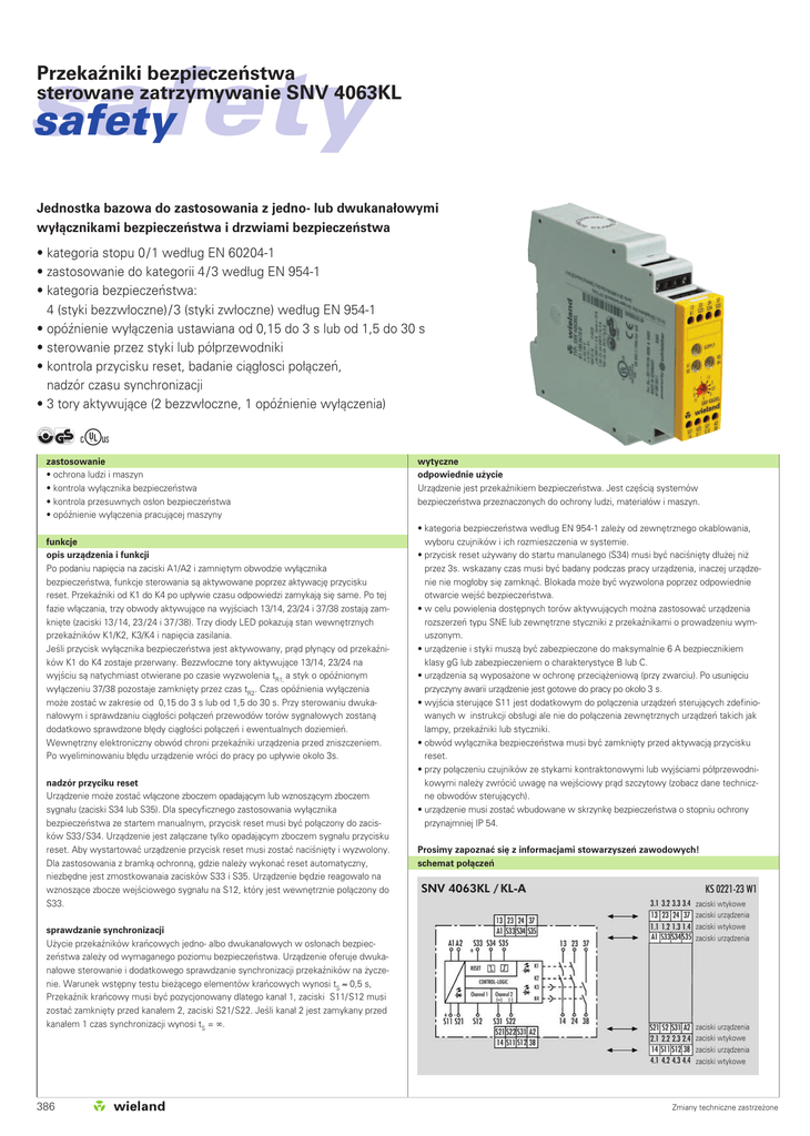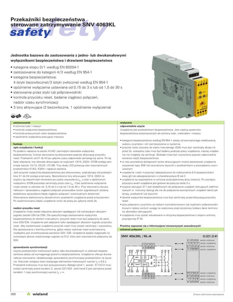 Przekaźniki bezpieczeństwa sterowane zatrzymywanie SNV 4063KL safety safety Jednostka bazowa do zastosowania z jedno- lub dwukanałowymi wyłącznikami bezpieczeństwa i drzwiami bezpieczeństwa • kategoria stopu 0 / 1 według EN 60204-1 • zastosowanie do kategorii 4 / 3 według EN 954-1 • kategoria bezpieczeństwa: 4 (styki bezzwłoczne) / 3 (styki zwłoczne) według EN 954-1 • opóźnienie wyłączenia ustawiana od 0,15 do 3 s lub od 1,5 do 30 s • sterowanie przez styki lub półprzewodniki • kontrola przycisku reset, badanie ciągłosci połączeń, nadzór czasu synchronizacji • 3 tory aktywujące (2 bezzwłoczne, 1 opóźnienie wyłączenia) bE zastosowanie • ochrona ludzi i maszyn • kontrola wyłącznika bezpieczeństwa • kontrola przesuwnych osłon bezpieczeństwa • opóźnienie wyłączenia pracującej maszyny funkcje opis urządzenia i funkcji Po podaniu napięcia na zaciski A1/A2 i zamniętym obwodzie wyłącznika bezpieczeństwa, funkcje sterowania są aktywowane poprzez aktywację przycisku reset. Przekaźniki od K1 do K4 po upływie czasu odpowiedzi zamykają się same. Po tej fazie włączania, trzy obwody aktywujące na wyjściach 13/14, 23/24 i 37/38 zostają zamknięte (zaciski 13 / 14, 23 / 24 i 37 / 38). Trzy diody LED pokazują stan wewnętrznych przekaźników K1/K2, K3/K4 i napięcia zasilania. Jeśli przycisk wyłącznika bezpieczeństwa jest aktywowany, prąd płynący od przekaźników K1 do K4 zostaje przerwany. Bezzwłoczne tory aktywujące 13/14, 23/24 na wyjściu są natychmiast otwierane po czasie wyzwolenia tR1, a styk o opóźnionym wyłączeniu 37/38 pozostaje zamknięty przez czas tR2. Czas opóźnienia wyłączenia może zostać w zakresie od 0,15 do 3 s lub od 1,5 do 30 s. Przy sterowaniu dwukanałowym i sprawdzaniu ciągłości połączeń przewodów torów sygnałowych zostaną dodatkowo sprawdzone błędy ciągłości połączeń i ewentualnych doziemień. Wewnętrzny elektroniczny obwód chroni przekaźniki urządzenia przed zniszczeniem. Po wyeliminowaniu błędu urządzenie wróci do pracy po upływie około 3s. nadzór przyciku reset Urządzenie może zostać włączone zboczem opadającym lub wznoszącym zboczem sygnału (zaciski S34 lub S35). Dla specyficznego zastosowania wyłącznika bezpieczeństwa ze startem manualnym, przycisk reset musi być połączony do zacisków S33 / S34. Urządzenie jest załączane tylko opadającym zboczem sygnału przycisku reset. Aby wystartować urządzenie przycisk reset musi zostać naciśnięty i wyzwolony. Dla zastosowania z bramką ochronną, gdzie należy wykonać reset automatyczny, niezbędne jest zmostkowanaia zacisków S33 i S35. Urządzenie będzie reagowało na wznoszące zbocze wejściowego sygnału na S12, który jest wewnętrznie połączony do S33. sprawdzanie synchronizacji Użycie przekaźników krańcowych jedno- albo dwukanałowych w osłonach bezpieczeństwa zależy od wymaganego poziomu bezpieczeństwa. Urządzenie oferuje dwukanałowe sterowanie i dodatkowego sprawdzanie synchronizacji przekaźników na życzenie. Warunek wstępny testu bieżącego elementów krańcowych wynosi tS ≈ 0,5 s, Przekaźnik krańcowy musi być pozycjonowany dlatego kanał 1, zaciski S11/ S12 musi zostać zamknięty przed kanałem 2, zaciski S21/ S22. Jeśli kanał 2 jest zamykany przed kanałem 1 czas synchronizacji wynosi tS = ∞. 386 wytyczne odpowiednie użycie Urządzenie jest przekaźnikiem bezpieczeństwa. Jest częścią systemów bezpieczeństwa przeznaczonych do ochrony ludzi, materiałów i maszyn. • kategoria bezpieczeństwa według EN 954-1 zależy od zewnętrznego okablowania, wyboru czujników i ich rozmieszczenia w systemie. • przycisk reset używany do startu manulanego (S34) musi być naciśnięty dłużej niż przez 3s. wskazany czas musi być badany podczas pracy urządzenia, inaczej urządzenie nie mogłoby się zamknąć. Blokada może być wyzwolona poprzez odpowiednie otwarcie wejść bezpieczeństwa. • w celu powielenia dostępnych torów aktywujących można zastosować urządzenia rozszerzeń typu SNE lub zewnętrzne styczniki z przekaźnikami o prowadzeniu wymuszonym. • urządzenie i styki muszą być zabezpieczone do maksymalnie 6 A bezpiecznikiem klasy gG lub zabezpieczeniem o charakterystyce B lub C. • urządzenia są wyposażone w ochronę przeciążeniową (przy zwarciu). Po usunięciu przyczyny awarii urządzenie jest gotowe do pracy po około 3 s. • wyjścia sterujące S11 jest dodatkowym do połączenia urządzeń sterujących zdefiniowanych w instrukcji obsługi ale nie do połączenia zewnętrznych urządzeń takich jak lampy, przekaźniki lub styczniki. • obwód wyłącznika bezpieczeństwa musi być zamknięty przed aktywacją przycisku reset. • przy połączeniu czujników ze stykami kontraktonowymi lub wyjściami półprzewodnikowymi należy zwrócić uwagę na wejściowy prąd szczytowy (zobacz dane techniczne obwodów sterujących). • urządzenie musi zostać wbudowane w skrzynkę bezpieczeństwa o stopniu ochrony przynajmniej IP 54. Prosimy zapoznać się z informacjami stowarzyszeń zawodowych! schemat połączeń zaciski wtykowe zaciski urządzenia zaciski wtykowe zaciski urządzenia zaciski urządzenia zaciski wtykowe zaciski urządzenia zaciski wtykowe Zmiany techniczne zastrzeżone Przekaźniki bezpieczeństwa sterowane zatrzymywanie SNV 4063KL safety wykres funkcji SNV 4063KL wyłącznik bezpieczeństwa (instalacja 1 i 2) rysunek SNV 4063KL A1/A2, napięcie zasilające, LED S12 wyłącznik bezpieczeństwa (kanał 1) S31/S22 wyłącznik bezpieczeństwa (kanał 2) S34 reset opadające zbocze 13/14, 23/24, LED K1/K2 37/38, LED K3/K4 tM tA tR1 tR2 tW = minimalny czas załączania = czas odpowiedzi = czas wyzwolenia = ustawiany czas opóźnienia wyłączenia = czas powrotu drzwi bezpieczeństwa (instalacja 3) A1/A2, napięcie zasilające, LED S12 wyłącznik bezpieczeństwa (kanał 1) S31/S22 wyłącznik bezpieczeństwa (