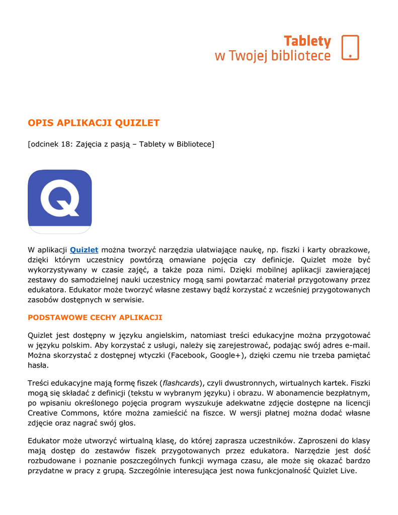 OPIS APLIKACJI QUIZLET [odcinek 18: Zajęcia z pasją – Tablety w Bibliotece] W aplikacji Quizlet można tworzyć narzędzia ułatwiające naukę, np. fiszki i karty obrazkowe, dzięki którym uczestnicy powtórzą omawiane pojęcia czy definicje. Quizlet może być wykorzystywany w czasie zajęć, a także poza nimi. Dzięki mobilnej aplikacji zawierającej zestawy do samodzielnej nauki uczestnicy mogą sami powtarzać materiał przygotowany przez edukatora. Edukator może tworzyć własne zestawy bądź korzystać z wcześniej przygotowanych zasobów dostępnych w serwisie. PODSTAWOWE CECHY APLIKACJI Quizlet jest dostępny w języku angielskim, natomiast treści edukacyjne można przygotować w języku polskim. Aby korzystać z usługi, należy się zarejestrować, podając swój adres e-mail. Można skorzystać z dostępnej wtyczki (Facebook, Google+), dzięki czemu nie trzeba pamiętać hasła. Treści edukacyjne mają formę fiszek (flashcards), czyli dwustronnych, wirtualnych kartek. Fiszki mogą się składać z definicji (tekstu w wybranym języku) i obrazu. W abonamencie bezpłatnym, po wpisaniu określonego pojęcia program wyszukuje adekwatne zdjęcie dostępne na licencji Creative Commons, które można zamieścić na fiszce. W wersji płatnej można dodać własne zdjęcie oraz nagrać swój głos. Edukator może utworzyć wirtualną klasę, do której zaprasza uczestników. Zaproszeni do klasy mają dostęp do zestawów fiszek przygotowanych przez edukatora. Narzędzie jest dość rozbudowane i poznanie poszczególnych funkcji wymaga czasu, ale może się okazać bardzo przydatne w pracy z grupą. Szczególnie interesująca jest nowa funkcjonalność Quizlet Live. Quizlet zawiera siedem narzędzi wspierających naukę i nauczanie: ● ● ● ● ● ● ● tworzenie fiszek, odpowiedzi pisemne, pisanie ze słuchu, przeprowadzanie testów, gra na czas (przeciągnij i upuść), gra, w której uczestnicy wpisują odpowiedzi, Quizlet Live (zawody między drużynami). JAK MOŻNA WYKORZYSTAĆ APLIKACJĘ? rozpoznawanie gatunków ptaków - edukator wspólnie z uczestnikami zajęć tworzy fiszki zawierające nazwę ptaka i jego zdjęcie, ćwiczenie wymowy różnych słów (tworząc fiszki, można wybrać język, w którym to słowo będzie następnie głośno czytanie przez automatycznego lektora), jak rozpocząc pracę z Quizlet? https://quizlet.com/help/2444083/what-is-quizlet (przewodnik w języku angielskim), jak wykorzystać Quizlet do nauki słówek? http://www.meetenglish.pl/blog/tworzenieflashcards-quizlet-com/. INSPIRACJE: Film pokazujący, jak można wykorzystać funkcję Quizlet Live: https://vimeo.com/161809345 Kurs „Tablety w Bibliotece" powstał w ramach Programu Rozwoju Bibliotek. Program wspiera tysiące bibliotek publicznych w całej Polsce w pełnieniu roli lokalnych centrów aktywności społecznej. W takich placówkach ludzie spędzają czas, rozwijają swoje zainteresowania, zdobywają nowe umiejętności i wspólnie działają. Program Rozwoju Bibliotek to przedsięwzięcie Polsko-Amerykańskiej Fundacji Wolności prowadzone przez Fundację Rozwoju Społeczeństwa Informacyjnego. W latach 2009-2015 było realizowane w ramach partnerstwa z Fundacją Billa i Melindy Gatesów. Ten materiał edukacyjny dostępny jest na licencji Creative Commons CC BY-SA 3.0 Polska. Pełna treść licencji znajduje się na stronie: http://creativecommons.org/licenses/by-sa/3.0/pl/