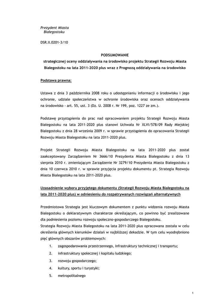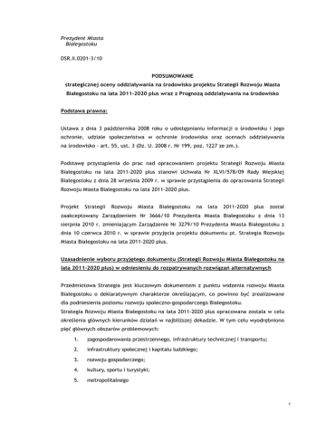Prezydent Miasta Białegostoku DSR.II.0201-3/10 PODSUMOWANIE strategicznej oceny oddziaływania na środowisko projektu Strategii Rozwoju Miasta Białegostoku na lata 2011-2020 plus wraz z Prognozą oddziaływania na środowisko Podstawa prawna: Ustawa z dnia 3 października 2008 roku o udostępnianiu informacji o środowisku i jego ochronie, udziale społeczeństwa w ochronie środowiska oraz ocenach oddziaływania na środowisko - art. 55, ust. 3 (Dz. U. 2008 r. Nr 199, poz. 1227 ze zm.). Podstawę przystąpienia do prac nad opracowaniem projektu Strategii Rozwoju Miasta Białegostoku na lata 2011-2020 plus stanowi Uchwała Nr XLVI/578/09 Rady Miejskiej Białegostoku z dnia 28 września 2009 r. w sprawie przystąpienia do opracowania Strategii Rozwoju Miasta Białegostoku na lata 2011-2020 plus. Projekt Strategii Rozwoju Miasta Białegostoku na lata 2011-2020 plus został zaakceptowany Zarządzeniem Nr 3666/10 Prezydenta Miasta Białegostoku z dnia 13 sierpnia 2010 r. zmieniającym Zarządzenie Nr 3279/10 Prezydenta Miasta Białegostoku z dnia 10 czerwca 2010 r. w sprawie przyjęcia projektu dokumentu pt. Strategia Rozwoju Miasta Białegostoku na lata 2011-2020 plus. Uzasadnienie wyboru przyjętego dokumentu (Strategii Rozwoju Miasta Białegostoku na lata 2011-2020 plus) w odniesieniu do rozpatrywanych rozwiązań alternatywnych Przedmiotowa Strategia jest kluczowym dokumentem z punktu widzenia rozwoju Miasta Białegostoku o deklaratywnym charakterze określającym, co powinno być zrealizowane dla podniesienia poziomu rozwoju społeczno-gospodarczego Białegostoku. Strategia Rozwoju Miasta Białegostoku na lata 2011-2020 plus opracowana została w celu określenia głównych kierunków działań w najbliższej dekadzie. W tym celu wyodrębniono pięć głównych obszarów problemowych: 1. zagospodarowania przestrzennego, infrastruktury technicznej i transportu; 2. infrastruktury społecznej i kapitału ludzkiego; 3. rozwoju gospodarczego; 4. kultury, sportu i turystyki; 5. metropolitalnego 1 w obrębie których określone zostały cele strategiczne, priorytety oraz kierunki działań. W dokumencie przeanalizowane zostały warianty strategiczne: • strategii zachowawczej i pasywnej, która będzie dążyła do przeciwdziałania zagrożeniom i eliminacji słabości, • strategii aktywnej opierającej się na wykorzystywaniu nowych szans i mocnych stron w dążeniu do istotnej poprawy sytuacji społeczno-gospodarczej. W analizowanym dokumencie założono, iż przyjęta zostanie aktywna strategia rozwoju oparta na mocnych stronach i szansach. Zgodnie z zapisami prognozy oddziaływania na środowisko sporządzonej na potrzeby Strategii Rozwoju Miasta Białegostoku na lata 20112020 plus wybrany do realizacji wariant przyczyni się do poprawy środowiska przyrodniczego. Oprócz powyższego w Prognozie oddziaływania na środowisko dla Strategii przeanalizowano wariant odnoszący się do braku realizacji założeń Strategii. Zgodnie z analizą wariant ten uznano za negatywny dla środowiska. W jaki sposób zostały wzięte pod uwagę i w jakim zakresie zostały uwzględnione ustalenia zawarte w prognozie oddziaływania na środowisko Do opracowanej Strategii Rozwoju Miasta Białegostoku na lata 2011-2020 plus przeprowadzona została strategiczna ocena oddziaływania na środowisko, zgodnie z ustawą z dnia 3 października 2008 r. o udostępnieniu informacji o środowisku i jego ochronie, udziale społeczeństwa w ochronie środowiska oraz o ocenach oddziaływania na środowisko (Dz. U. 2008 r. Nr 199 poz. 1227, ze zm.), w ramach której sporządzona została Prognoza oddziaływania na środowisko dla Strategii Rozwoju Miasta Białegostoku na lata 2011-2020 plus. Zgodnie z zapisami Prognozy wpływ na środowisko będzie miała jedynie realizacja przedsięwzięć inwestycyjnych, które opierać się będą w większości na prowadzeniu prac budowlanych. Zakłada się, iż okres prowadzenia prac budowlanych będzie oddziaływać na rośliny, ludzi, zwierzęta, wodę, powietrze, powierzchnię ziemi, krajobraz, klimat akustyczny, zabytki, dobra materialne. Zaobserwować będzie można wówczas następujące zależności: • emisja zanieczyszczeń, zapylenie, hałas, wibracje wpływają bezpośrednio na powietrze i klimat, pośrednio czynniki te zanieczyszczają powierzchnię ziemi, gleby i wody powierzchniowe, hałas i wibracje wpływa na człowieka i świat zwierzęcy, 2 • wykopy, zajęcie gleb i gruntów oraz zmiany struktury i składu gruntu oddziaływują na powierzchnię ziemi i glebę, a co za tym idzie wpływają na zmianę pokrycia powierzchni ziemi, na florę i faunę oraz krajobraz, • zanieczyszczenie i zmiany poziomu wód bezpośrednio oddziaływują na wody powierzchniowe i podziemne, a pośrednio mają tez wpływ na wilgotność i właściwości filtracyjne gleby, plonowanie roślin, zdrowie ludzi, • jakość powietrza atmosferycznego, wód powierzchniowych i podziemnych, hałas i wibracje oraz zmiany krajobrazu poprzez wpływ na florę i faunę wpływa również na zdrowie człowieka. Oddziaływania przewidywane są przede wszystkim na etapie prowadzenia prac budowlanych, co będzie miało charakter przejściowy. W konsekwencji realizacja założonych celów w analizowanym dokumencie przyczyni się do poprawy warunków środowiskowych w Białymstoku. W jaki sposób zostały wzięte pod uwagę i w jakim zakresie zostały uwzględnione opinie właściwych organów, o których mowa w art. 57 i 58 ustawy z dnia 3 października 2008 r. o udostępnieniu informacji o środowisku i jego ochronie, udziale społeczeństwa w ochronie środowiska oraz o ocenach oddziaływania na środowisko (Dz. U. 2008 r. Nr 199 poz. 1227, ze zm.) Zgodnie z art. 57 i 58 ustawy z dnia 3 października 2008 r. o udostępnieniu informacji o środowisku i jego ochronie, udziale społeczeństwa w ochronie środowiska oraz o ocenach oddziaływania na środowisko (Dz. U. 2008 r. Nr 199 poz. 1227, ze zm.) wła