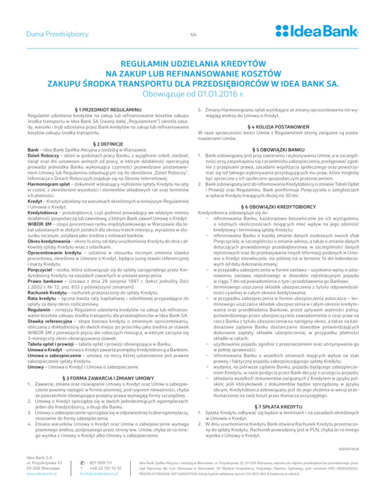 Duma Przedsiębiorcy 1/4 REGULAMIN UDZIELANIA KREDYTÓW NA ZAKUP LUB REFINANSOWANIE KOSZTÓW ZAKUPU ŚRODKA TRANSPORTU DLA PRZEDSIĘBIORCÓW W IDEA BANK SA. Obowiązuje od 01.01.2016 r. § 1 PRZEDMIOT REGULAMINU Regulamin udzielania kredytów na zakup lub refinansowanie kosztów zakupu środka transportu w Idea Bank SA (zwany dalej „Regulaminem”) określa zasady, warunki i tryb udzielania przez Bank kredytów na zakup lub refinansowanie kosztów zakupu środka transportu. § 2 DEFINICJE Bank – Idea Bank Spółka Akcyjna z siedzibą w Warszawie. Dzień Roboczy – dzień w godzinach pracy Banku, z wyjątkiem sobót, niedziel, świąt oraz dni ustawowo wolnych od pracy, w którym działalność operacyjną prowadzi jednostka Banku wykonująca czynności przewidziane postanowieniem Umowy lub Regulaminu odwołującym się do określenia „Dzień Roboczy”. Informacja o Dniach Roboczych znajduje się na Stronie Internetowej; Harmonogram spłat – dokument wskazujący rozłożenie spłaty Kredytu na raty w czasie, z określeniem wysokości i elementów składowych rat oraz terminów ich płatności. Kredyt – Kredyt udzielany na warunkach określonych w niniejszym Regulaminie i Umowie o Kredyt. Kredytobiorca – przedsiębiorca, czyli podmiot prowadzący we własnym imieniu działalność gospodarczą lub zawodową, z którym Bank zawarł Umowę o Kredyt. WIBOR 3M – stopa procentowa rynku międzybankowego w Warszawie dla lokat udzielanych w złotych polskich dla okresu trzech miesięcy, wyrażona w stosunku rocznym, ustalana jako średnia z notowań banków. Okres kredytowania – okres liczony od daty uruchomienia Kredytu do dnia całkowitej spłaty Kredytu wraz z odsetkami. Oprocentowanie kredytu – ustalona w stosunku rocznym zmienna stawka procentowa, określona w Umowie o Kredyt, będąca sumą stawki referencyjnej i marży Kredytu. Poręczyciel – osoba, która zobowiązuje się do spłaty zaciągniętego przez Kredytobiorcę Kredytu na zasadach zawartych w umowie poręczenia. Prawo bankowe – Ustawa z dnia 29 sierpnia 1997 r. (tekst jednolity DzU z 2002 r. Nr 72, poz. 655 z późniejszymi zmianami). Rachunek Kredytu – rachunek przeznaczony do spłaty Kredytu. Rata kredytu – łączna kwota raty kapitałowej i odsetkowej przypadająca do spłaty za dany okres rozliczeniowy. Regulamin – niniejszy Regulamin udzielania kredytów na zakup lub refinansowanie kosztów zakupu środka transportu dla przedsiębiorców w Idea Bank SA. Stawka referencyjna – stopa bazowa kredytu o zmiennym oprocentowaniu, obliczana z dokładnością do dwóch miejsc po przecinku jako średnia ze stawek WIBOR 3M z pierwszych pięciu dni roboczych miesiąca, w którym zaczyna się 3-miesięczny okres obowiązywania stawek. Tabela opłat i prowizji – tabela opłat i prowizji obowiązująca w Banku. Umowa o Kredyt – umowa o Kredyt zawarta pomiędzy Kredytobiorcą a Bankiem. Umowa o zabezpieczenie – umowa, na mocy której ustanowione jest prawne zabezpieczenie spłaty Kredytu. Umowy – Umowa o Kredyt i Umowa o zabezpieczenie. § 3 FORMA ZAWARCIA I ZMIANY UMOWY 1. Zawarcie, zmiana oraz rozwiązanie Umowy o Kredyt oraz Umów o zabezpieczenie powinny nastąpić w formie pisemnej, pod rygorem nieważności, chyba że powszechnie obowiązujące przepisy prawa wymagają formy szczególnej. 2. Umowę o Kredyt sporządza się w dwóch jednobrzmiących egzemplarzach: jeden dla Kredytobiorcy, a drugi dla Banku. 3. Umowy o zabezpieczenie sporządza się w odpowiedniej liczbie egzemplarzy, stosownie do formy zabezpieczenia. 4. Zmiana warunków Umowy o Kredyt oraz Umów o zabezpieczenie wymaga pisemnego aneksu, podpisanego przez strony ww. Umów, chyba że co innego wynika z Umowy o Kredyt albo Umowy o zabezpieczenie. 5. Zmiany Harmonogramu spłat wynikające ze zmiany oprocentowania nie wymagają aneksu do Umowy o Kredyt. § 4 KOLIZJA POSTANOWIEŃ W razie sprzeczności treści Umów z Regulaminem strony związane są postanowieniami Umów. § 5 OBOWIĄZKI BANKU 1. Bank zobowiązany jest przy zawieraniu i wykonywaniu Umów, a w szczególności przy zaspokajaniu się z przedmiotu zabezpieczenia, postępować zgodnie z przepisami prawa, zasadami współżycia społecznego oraz powstrzymać się od takiego wykonywania przysługujących mu praw, które mogłoby być sprzeczne z ich społeczno-gospodarczym przeznaczeniem. 2. Bank zobowiązany jest do informowania Kredytobiorcy o zmianie Tabeli Opłat i Prowizji oraz Regulaminu. Bank poinformuje Poręczyciela o zaległościach w spłacie Kredytu trwających dłużej niż 30 dni. § 6 OBOWIĄZKI KREDYTOBIORCY Kredytobiorca zobowiązuje się do: − informowania Banku, każdorazowo bezzwłocznie po ich wystąpieniu, o istotnych okolicznościach mogących mieć wpływ na jego zdolność kredytową i terminową spłatę Kredytu; − informowania Banku o każdej zmianie danych osobowych swoich i/lub Poręczyciela, w szczególności o zmianie adresu, a także o zmianie danych dotyczących prowadzonego przedsiębiorstwa, w szczególności danych rejestrowych oraz do przekazywania innych informacji podanych w Umowie o Kredyt niezwłocznie, nie później niż w terminie 14 dni kalendarzowych od daty dokonania zmiany; − w przypadku zabezpieczenia w formie zastawu – uzyskania wpisu o ustanowieniu zastawu rejestrowego w dowodzie rejestracyjnym pojazdu w ciągu 7 dni od powiadomienia o tym i przedstawienia go Bankowi; − terminowego uiszczania składek ubezpieczenia z tytułu odpowiedzialności cywilnej w całym okresie kredytowania; − w przypadku zabezpieczenia w formie ubezpieczenia autocasco – terminowego uiszczania składek ubezpieczenia w całym okresie kredytowania oraz przedkładania Bankowi, przed upływem ważności polisy, potwierdzonego przez ubezpieczyciela zawiadomienia o cesji praw na rzecz Banku z tytułu ubezpieczenia na następny okres, a także na każdorazowe żądanie Banku dostarczanie dowodów potwierdzających dokonanie zapłaty składek ubez