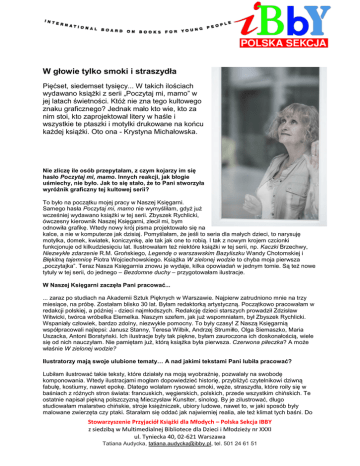 W głowie tylko smoki i straszydła Pięćset, siedemset tysięcy... W takich ilościach wydawano książki z serii „Poczytaj mi, mamo” w jej latach świetności. Któż nie zna tego kultowego znaku graficznego? Jednak mało kto wie, kto za nim stoi, kto zaprojektował litery w haśle i wszystkie te ptaszki i motylki drukowane na końcu każdej książki. Oto ona - Krystyna Michałowska. Nie zliczę ile osób przepytałam, z czym kojarzy im się hasło Poczytaj mi, mamo. Innych reakcji, jak błogie uśmiechy, nie było. Jak to się stało, że to Pani stworzyła wyróżnik graficzny tej kultowej serii? To było na początku mojej pracy w Naszej Księgarni. Samego hasła Poczytaj mi, mamo nie wymyśliłam, gdyż już wcześniej wydawano książki w tej serii. Zbyszek Rychlicki, ówczesny kierownik Naszej Księgarni, zlecił mi, bym odnowiła grafikę. Wtedy nowy krój pisma projektowało się na kalce, a nie w komputerze jak dzisiaj. Pomyślałam, że jeśli to seria dla małych dzieci, to narysuję motylka, domek, kwiatek, koniczynkę, ale tak jak one to robią. I tak z nowym krojem czcionki funkcjonuje od kilkudziesięciu lat. Ilustrowałam też niektóre książki w tej serii, np. Kaczki Brzechwy, Niezwykłe zdarzenie R.M. Grońskiego, Legendę o warszawskim Bazyliszku Wandy Chotomskiej i Błękitną tajemnicę Piotra Wojciechowskiego. Książka W zielonej wodzie to chyba moja pierwsza „poczytajka”. Teraz Nasza Księgarnia znowu je wydaje, kilka opowiadań w jednym tomie. Są też nowe tytuły w tej serii, do jednego – Bezdomne duchy – przygotowałam ilustracje. W Naszej Księgarni zaczęła Pani pracować... ... zaraz po studiach na Akademii Sztuk Pięknych w Warszawie. Najpierw zatrudniono mnie na trzy miesiące, na próbę. Zostałam blisko 30 lat. Byłam redaktorką artystyczną. Początkowo pracowałam w redakcji polskiej, a później - dzieci najmłodszych. Redakcję dzieci starszych prowadził Zdzisław Witwicki, twórca wróbelka Elemelka. Naszym szefem, jak już wspomniałam, był Zbyszek Rychlicki. Wspaniały człowiek, bardzo zdolny, niezwykle pomocny. To były czasy! Z Naszą Księgarnią współpracowali najlepsi: Janusz Stanny, Teresa Wilbik, Andrzej Strumiłło, Olga Siemaszko, Maria Uszacka, Antoni Boratyński. Ich ilustracje były tak piękne, byłam zauroczona ich doskonałością, wiele się od nich nauczyłam. Nie pamiętam już, którą książka była pierwsza. Czerwona piłeczka? A może właśnie W zielonej wodzie? Ilustratorzy mają swoje ulubione tematy… A nad jakimi tekstami Pani lubiła pracować? Lubiłam ilustrować takie teksty, które działały na moją wyobraźnię, pozwalały na swobodę komponowania. Wtedy ilustracjami mogłam dopowiedzieć historię, przybliżyć czytelnikowi dziwną fabułę, kostiumy, nawet epokę. Dlatego wolałam rysować smoki, węże, straszydła, które roiły się w baśniach z różnych stron świata: francuskich, węgierskich, polskich, przede wszystkim chińskich. Te ostatnie napisał piękną polszczyzną Mieczysław Kunslter, sinolog. By je zilustrować, długo studiowałam malarstwo chińskie, stroje księżniczek, ubiory ludowe, nawet to, w jaki sposób były malowane zwierzęta czy ptaki. Starałam się oddać jak najwierniej realia, ale też klimat tych baśni. Do Stowarzyszenie Przyjaciół Książki dla Młodych – Polska Sekcja IBBY z siedzibą w Multimedialnej Bibliotece dla Dzieci i Młodzieży nr XXXI ul. Tyniecka 40, 02-621 Warszawa Tatiana Audycka, [email protected], tel. 501 24 61 51 Księżniczki smoków zaprojektowałam nawet liternictwo na stronę tytułową, by czcionki kojarzyły się z chińskim alfabetem. Niestety, jednej tajemnicy nie odkryłam, tej dotyczącej chińskich smoków. Kto nie lubi tajemnic, proszę ją zdradzić! Wydało się to na jakichś targach książek. Podszedł do naszego stoiska pewien pan... Nie wiem, jak się nazywał, ale to był Chińczyk. Pochwaliłam się Księżniczką smoków, bo byłam dumna z tej książki. Jemu też się spodobała, jednak zwrócił mi uwagę, że chińskie smoki mają wąsy, a moje ich nie miały. Przejęłam się bardzo i jeszcze tego samego dnia, już w domu, domalowałam wszystkim smokom wąsy na oryginałach ilustracji. Teraz marzę o tym, by ktoś ponownie wydał Księżniczkę smoków, ale już z prawidłowymi smokami. Ilustrowała Pani też Baśnie Andersena. Ta okładka z niebieska różą, którą Pani namalowała, zapadła w pamięci wielu czytelnikom. Baśnie H. Ch Andersena wydała Nasza Księgarnia. Było to dla mnie ogromne wyzwanie, bo któż nie znał wersji z ilustracjami Jana Marcina Szancera? Byłam na nich wychowana, a do tego byłam jego studentką! Dlatego postanowiłam, że moje ilustracje - w odróżnieniu od Szancera - będą malarskie, że pomaluję je na płótnie, wtedy w druku będzie widoczna jego faktura. To nie było łatwe zadanie – próbowałam różnych zabiegów, by farba trzymała się podłoża (z olejną nie byłoby problemu, bo jest tłusta, a ja malowałam temperą). Praca nad książką zajęła mi pół roku, a może dłużej – w tamtych czasach dostawało się dłuższe terminy niż dzisiaj. Dlatego mogłam jednej ilustracji poświęcić sporo czasu, poprawiać ją, zmieniać, dopieszczać szczegóły. W moich Baśniach zilustrowałam też inne fragmenty niż Szancer i inaczej je zinterpretowałam. Na przykład w baśni Świniopas w moim wykonaniu to księżniczka jest poszkodowana, a tytułowy bohater jest podstępny i nieuczciwy To niezwykłe oglądać oryginały prac, które zna się z książek. A wiadomo w tamtych czasach nie był takich możliwości technicznych jak dzisiaj. Nie lubię rozstawać się ze swoimi ilustracjami, tak na zawsze... Może dlatego, że w każdą wkładam dużo serca, w każdej zostawiam trochę siebie. Dlatego, jak kiedyś ktoś wypożyczył komplet ilustracji, ale nie oddał wszystkich, to musiałam domalować tę brakującą . To było trudne, bo robiłam