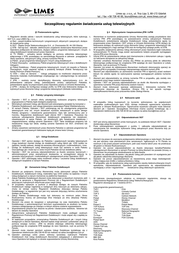 Limes sp. z o.o., ul. Trzy Lipy 3, 80-172 Gdańsk tel. / fax +58 728 40 00, [email protected], www.limes.com.pl Szczegółowy regulamin świadczenia usług telewizyjnych §1 Postanowienie ogólne. 1. Regulamin określa zakres i warunki świadczenia usług telewizyjnych, które wykonują SGT S.A. oraz LIMES Sp. z o.o. a) Sieć - zespół środków technicznych i programowych, aktywnych i pasywnych, służąca do świadczenia usług. b) SGT - Śląska Grupa Telekomunikacyjna S.A., ul. Chorzowska 50, 44-100 Gliwice. c) STB - Set-top box - dekoder, elektroniczne urządzenie dostarczane Abonentowi przez Operatora podłączane do telewizora, służące odbioru programów telewizyjnych i innych usług dodatkowych świadczonych przez Operatora. d) TV PANEL - wirtualny serwis dostępny za pomocą odbiornika telewizyjnego połączonego z STB, pozwalający na samoobsługę Abonenta w zakresie przeglądania oferty operatora, zakupionych usług, zmianę numerów PIN itp. e) Pakiet - grupa programów telewizyjnych i innych usług dodatkowych f) Pakiet Oszczędny - podstawowy Pakiet programów telewizyjnych wraz z dodatkowymi Usługami. g) Pakiet Dodatkowy - Pakiet programów telewizyjnych, innych niż zawarte w Pakiecie Oszczędnym, może zawierać kanały o podobnej tematyce (Pakiet Tematyczny) lub kanały Premium (Pakiet Premium). h) VOD – video on demand - Usługa polegająca na możliwości obejrzenia przez Abonenta materiału multimedialnego znajdującego się i udostępnionego na serwerach Operatora. i) jPIN – osobisty numer identyfikacyjny Abonenta, wykorzystywany m.in. do potwierdzania zakupów Usług, poświadczania zmiany zakupionych Pakietów, potwierdzanie zgody na proponowane przez Operatora zmiany w Umowie Abonenckiej. j) tvPIN – służący do konfiguracji swojego profilu na STB oraz blokowania dostępu do wybranych przez Abonenta Usług i programów telewizyjnych (blokada rodzicielska). §2 1. 2. 3. 4. 2. 3. 4. 1. 2. 3. 4. 5. 6. 7. 8. 9. Operator i SGT w ramach oferty udostępniają kodowane programy telewizyjne pogrupowane w Pakiety bądź dostępne pojedynczo. 1. Minimalnym zakresem Usług, jaki Abonent jest zobowiązany posiadać by korzystać z Pakietów Dodatkowych, jest usługa telewizyjna zawierająca Pakiet Wielotematyczny. W ramach Pakietu, Operator i SGT zobowiązują się do udostępniania programów telewizyjnych oraz ew. innych świadczeń wyraźnie wskazanych w opisie takiego Pakietu (programy i świadczenia gwarantowane). Opis taki zamieszczony jest w Cenniku, Regulaminie dodatkowym bądź ofercie SGT i Operatora. Powyższe nie wyklucza udostępnienia Abonentowi dodatkowych programów lub świadczeń, niewskazanych w opisie Pakietu, lub określonych jako świadczenia dodatkowe i niegwarantowane, według uznania Operatora i SGT. Takie dodatkowe programy lub 1. świadczenia mogą być także, według uznania Operatora lub SGT, zmieniane lub wyłączane. 2. Zmiany zawartości zamówionych przez Abonenta Pakietów w zakresie programów lub świadczeń gwarantowanych traktowane będą jak zmiana treści Umowy. Abonentowi w momencie podpisywania Umowy Abonenckiej zostają przydzielone dwa numery PIN: jPIN pozwalający na poświadczanie zmiany zakupionych Pakietów Dodatkowych, potwierdzanie zakupów Dodatkowych Usług, potwierdzanie zgody na proponowane przez Operatora i SGT zmiany w Umowie Abonenckiej; tvPIN służący do blokowania dostępu do wybranych przez Abonenta Usług i programów telewizyjnych dla osób korzystających z tego samego STB oraz do konfiguracji swojego profilu na STB. W przypadku zwiększenia zakresu Usług oferowanych przez Operatora bądź rozbudowy funkcjonalności TV Panelu mogą zostać wprowadzone kolejne przypadki wymagające użycia jPIN przez Abonenta. Użycie jPIN do potwierdzenia zakupu jest równoznaczne z dokonaniem zakupu i zgodą na naliczenie obciążenia za zakupioną Usługę. Operator umożliwia Abonentowi zmianę obu PINów za pomocą pilota do odbiornika telewizyjnego podłączonego do urządzenia STB wpiętego do sieci Operatora w Lokalu Abonenta, czyli za pomocą TV Panelu. Operator ma prawo do zablokowania Abonentowi możliwość dokonywania operacji za pomocą jPIN w przypadku 5-krotnego niepoprawnego wpisania numeru jPIN. Abonent jest odpowiedzialny za zachowanie numerów PIN w tajemnicy przed osobami którym nie udziela zgody na wykonywanie operacji wymagających podania numerów PIN. Abonent jest odpowiedzialny za zmianę numerów PIN w przypadku, gdy zostały one wyjawione przez niego osobom niepowołanym. Operator i SGT nie ponoszą odpowiedzialności za skutki dla Abonenta wynikające z ujawnienia numerów PIN przez Abonenta osobom trzecim. Abonent może dokonywać operacje odblokowania i blokowania numerów PIN telefonicznie dzwoniąc do Operatora. Zmiana PIN w ten sposób wymaga zidentyfikowania klienta przez pracownika działu Obsługi Klienta. §5 1. 2. 3. 4. 5. Zamawianie Usług i Pakietów Dodatkowych Abonent po podpisaniu Umowy Abonenckiej może dokonywać zakupu Pakietów Dodatkowych, dodatkowych Usług, materiałów typu VOD (wideo na żądanie) i innych Usług dostępnych w danym momencie na platformie Operatora. 2. Zakup Pakietów Dodatkowych Abonent może dokonywać w dowolnym momencie, jeśli 1. nie jest to sprzeczne z Regulaminami Promocji lub z Regulaminami Dodatkowymi dotyczącymi wykupionych dotychczas przez niego Usług. 2. 3. W przypadku opisanym w punkcie 2 aktywacja dostępu do nowych Pakietów Dodatkowych nastąpi najpóźniej w następnym dniu roboczym po dokonaniu zakupu, chyba że istnieje osobny Regulamin Dodatkowy dotyczący danego Pakietu Dodatkowego i w regulaminie tym jest inny warunek dotyczący terminu uruchomienia dostępu do Pakietu. 4. Zakup Pakietu Dodatkowego może być dokonany na minimum jeden Okres Rozliczeniowy liczony od pierwszego dnia miesiąca po dniu aktywacji Pakietu Dodatkowego. 5. Abonent ma prawo do rezygnacji z wykupionego na czas nieokreślony Pakietu Dodatkowego z je