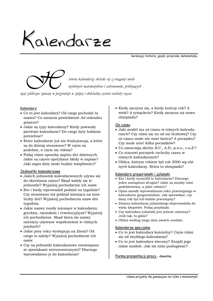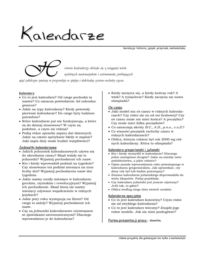 Kalendarze H korelacja: historia, języki, przyroda, matematyka, istoria kalendarzy składa się z osiągnięć wielu wybitnych matematyków i astronomów, próbujących ująć cykliczne zmiany w przyrodzie w spójny i dokładny system rachuby czasu. Kalendarz • Co to jest kalendarz? Od czego pochodzi ta nazwa? Co oznacza powiedzenie Ad calendas graecos? • Jakie są typy kalendarzy? Kiedy powstały pierwsze kalendarze? Do czego byty ludziom potrzebne? • Które kalendarze już nie funkcjonują, a które są do dzisiaj stosowane? W czym są podobne, a czym się różnią? • Podaj różne sposoby zapisu dat dziennych. Jakie są często spotykane błędy w zapisie? Jaki zapis daty może budzić wątpliwości? Jednostki kalendarzowe • Jakich jednostek kalendarzowych używa się do określania czasu? Skąd wzięły się te jednostki? Wyjaśnij pochodzenie ich nazw. • Kto i kiedy wprowadził podział na tygodnie? Czy stosowano też podział miesiąca na inne liczby dni? Wyjaśnij pochodzenia nazw dni tygodnia. • Jakie nazwy nosiły miesiące w kalendarzu greckim, rzymskim i rewolucyjnym? Wyjaśnij ich pochodzenie. Skąd biorą się nazwy miesięcy używane współcześnie w różnych językach? • Jakie pory roku występują na Ziemi? Od czego to zależy? Wyjaśnij pochodzenie ich nazw. • Czy są jednostki kalendarzowe niezwiązane ze zjawiskami astronomicznymi? Dlaczego wprowadzono je do kalendarza? • Kiedy zaczyna się, a kiedy kończy rok? A wiek? A tysiąclecie? Kiedy zaczyna się nowa olimpiada? Os czasu • Jaki model ma oś czasu w różnych kalendarzach? Czy różni się on od osi liczbowej? Czy oś czasu może nie mieć końca? A początku? Czy może mieć kilka początków? • Co oznaczają skróty B.C., A.D., p.n.e., v.u.Z.? • Co stanowi początek rachuby czasu w różnych kalendarzach? • Oblicz, którym rokiem był rok 2000 wg różnych kalendarzy. Która to olimpiada? Kalendarz gregorianski i julianski • Kto i kiedy wymyślił te kalendarze? Dlaczego jeden zastąpiono drugim? Jakie są między nimi podobieństwa, a jakie różnice? • Opisz zasadę wprowadzania roku przestępnego w kalendarzu gregoriańskim. Jak sprawdzać, czy dany rok był lub będzie przestępny? • Zmiana kalendarza juliańskiego doprowadziła do wielu kłopotów. Podaj przykłady. • Czy kalendarz juliański jest jeszcze używany? Jeśli tak, to gdzie? • Oblicz według niego datę swoich urodzin. Kalendarze specjalne • Co to jest kalendarz kościelny? Czym różni się od zwykłego kalendarza? • Co to jest kalendarz wieczny? Znajdź jego różne modele. Jak się nimi posługiwać? Forma prezentacji pracy - dowolna. Udane projekty dla gimnazjum nie tylko z matematyki