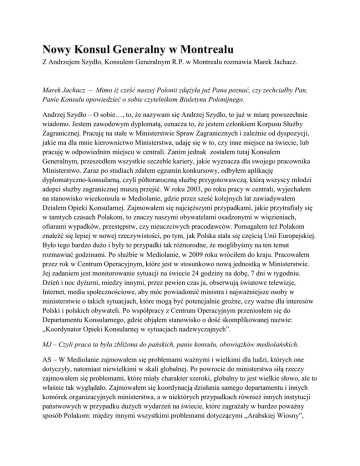 Nowy Konsul Generalny w Montrealu Z Andrzejem Szydło, Konsulem Generalnym R.P. w Montrealu rozmawia Marek Jachacz. Marek Jachacz – Mimo iż cześć naszej Polonii zdążyła już Pana poznać, czy zechciałby Pan, Panie Konsulu opowiedzieć o sobie czytelnikom Biuletynu Polonijnego. Andrzej Szydło – O sobie…, to, że nazywam się Andrzej Szydło, to już w miarę powszechnie wiadomo. Jestem zawodowym dyplomatą, oznacza to, że jestem członkiem Korpusu Służby Zagranicznej. Pracuję na stałe w Ministerstwie Spraw Zagranicznych i zależnie od dyspozycji, jakie ma dla mnie kierownictwo Ministerstwa, udaję się w to, czy inne miejsce na świecie, lub pracuję w odpowiednim miejscu w centrali. Zanim jednak zostałem tutaj Konsulem Generalnym, przeszedłem wszystkie szczeble kariery, jakie wyznacza dla swojego pracownika Ministerstwo. Zaraz po studiach zdałem egzamin konkursowy, odbyłem aplikację dyplomatyczno-konsularną, czyli półtoraroczną służbę przygotowawczą, którą wszyscy młodzi adepci służby zagranicznej muszą przejść. W roku 2003, po roku pracy w centrali, wyjechałem na stanowisko wicekonsula w Mediolanie, gdzie przez sześć kolejnych lat zawiadywałem Działem Opieki Konsularnej. Zajmowałem się najcięższymi przypadkami, jakie przytrafiały się w tamtych czasach Polakom, to znaczy naszymi obywatelami osadzonymi w więzieniach, ofiarami wypadków, przestępstw, czy nieuczciwych pracodawców. Pomagałem też Polakom znaleźć się lepiej w nowej rzeczywistości, po tym, jak Polska stała się częścią Unii Europejskiej. Było tego bardzo dużo i były to przypadki tak różnorodne, że moglibyśmy na ten temat rozmawiać godzinami. Po służbie w Mediolanie, w 2009 roku wróciłem do kraju. Pracowałem przez rok w Centrum Operacyjnym, które jest w stosunkowo nową jednostką w Ministerstwie. Jej zadaniem jest monitorowanie sytuacji na świecie 24 godziny na dobę, 7 dni w tygodniu. Dzień i noc dyżurni, miedzy innymi, przez pewien czas ja, obserwują światowe telewizje, Internet, media społecznościowe, aby móc powiadomić ministra i najważniejsze osoby w ministerstwie o takich sytuacjach, które mogą być potencjalnie groźne, czy ważne dla interesów Polski i polskich obywateli. Po współpracy z Centrum Operacyjnym przeniosłem się do Departamentu Konsularnego, gdzie objąłem stanowisko o dość skomplikowanej nazwie: „Koordynator Opieki Konsularnej w sytuacjach nadzwyczajnych”. MJ – Czyli praca ta była zbliżona do pańskich, panie konsulu, obowiązków mediolańskich. AS – W Mediolanie zajmowałem się problemami ważnymi i wielkimi dla ludzi, których one dotyczyły, natomiast niewielkimi w skali globalnej. Po powrocie do ministerstwa siłą rzeczy zajmowałem się problemami, które miały charakter szeroki, globalny to jest wielkie słowo, ale to właśnie tak wyglądało. Zajmowałem się koordynacją działania samego departamentu i innych komórek organizacyjnych ministerstwa, a w niektórych przypadkach również innych instytucji państwowych w przypadku dużych wydarzeń na świecie, które zagrażały w bardzo poważny sposób Polakom: między innymi wszystkimi problemami dotyczącymi „Arabskiej Wiosny”, począwszy od Tunezji, gdzie mieliśmy, jeśli dobrze pamiętam, trzystu kilkudziesięciu turystów, którym trzeba było zapewnić szybki powrót do kraju. Później Egipt, gdzie tych turystów mieliśmy już sześć i pół tysiąca. Współpracowaliśmy z rożnymi biurami podroży. Byłem tam zresztą na miejscu. Czuwaliśmy nad tym, by wszystkim turystom zapewnić bezpieczny i szybki powrót do kraju. Następnie nadeszła Libia, czyli jeszcze większa eskalacja przemocy i zagrożenia dla naszych obywateli. Stamtąd ewakuowaliśmy ponad dwustu Polaków. Andrzej Szydło, Konsul Generalny R.P. w Montrealu MJ – Podejrzewam, że to było trudniejsze zadanie. AS – To było trudniejsze zadanie z jednej strony, dlatego że nie wszystkich ewakuowaliśmy własnymi środkami transportu. Polskim samolotem, który polski rząd wysłał do Trypolisu odleciało, około 10% wszystkich ewakuowanych Polaków. Najpoważniejszym zadaniem była koordynacja powrotów polskich obywateli środkami przygotowanymi przez inne kraje. Generalnie była to akcja, która objęła calą Europę. Polacy wracali nie tylko samolotami, niektórzy korzystali ze statków brytyjskich, czy amerykańskich. Następnie do tych miejsc, do których Polacy przybywali, czyli lotnisk i portów europejskich, należało wysłać konsula, by ich odebrał, zajął się ich opieką, a następnie pomógł wrócić do kraju. Szczęśliwie nikomu nic się nie stało. Żaden z Polaków nie został poszkodowany. Wręcz przeciwnie, wszyscy w dobrej formie dotarli do kraju. Cała akcja zakończyła się powodzeniem. Pamiętam, że pracowaliśmy wówczas z największym zaangażowaniem dzień i noc przez wiele dni. MJ – W tym czasie Polska również udostępniała swych środków transportu obcokrajowcom, prawda? AS – To jest jakby osobna historia, bo współpraca międzynarodowa była też częścią mojego działania. W okresie mojej pracy w Ministerstwie, byłem również przedstawicielem Polski do tak zwanej grupy roboczej do spraw współpracy konsularnej „COCON”, do której należą eksperci konsularni ze wszystkich krajów Unii Europejskiej. Ta grupa, jest odpowiedzialna między innymi za koordynację współpracy. Traktaty Unii Europejskiej mówią, że obywatel Unii Europejskiej, który znajduje się w kraju, w którym nie ma jego przedstawicielstwa dyplomatycznego, może skorzystać w każdej sytuacji z pomocy konsulatu innego państwa Unii Europejskiej, czego naturalną konsekwencją jest bliska współpraca służb konsularnych wszystkich krajów UE. W okresie „Arabskiej Wiosny” grupa ta organizowała dość często konferencje, ma ona również swoje forum internetowe, na którym po prostu informowaliśmy się nawzajem. Dlatego naszymi sam