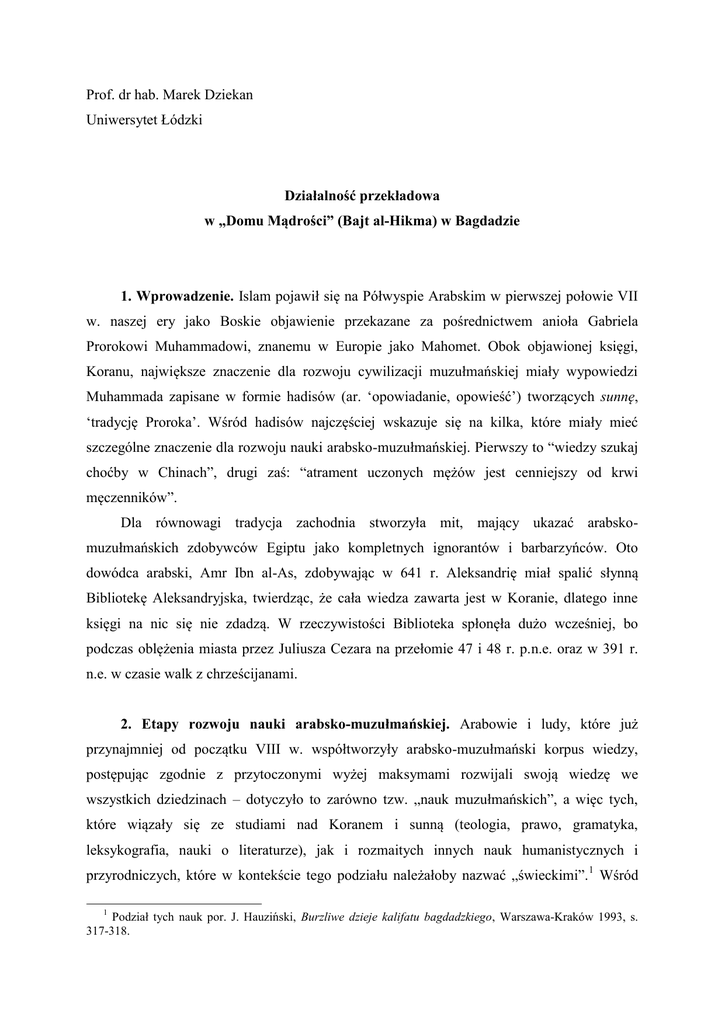 Prof. dr hab. Marek Dziekan Uniwersytet Łódzki Działalność przekładowa w „Domu Mądrości” (Bajt al-Hikma) w Bagdadzie 1. Wprowadzenie. Islam pojawił się na Półwyspie Arabskim w pierwszej połowie VII w. naszej ery jako Boskie objawienie przekazane za pośrednictwem anioła Gabriela Prorokowi Muhammadowi, znanemu w Europie jako Mahomet. Obok objawionej księgi, Koranu, największe znaczenie dla rozwoju cywilizacji muzułmańskiej miały wypowiedzi Muhammada zapisane w formie hadisów (ar. „opowiadanie, opowieść‟) tworzących sunnę, „tradycję Proroka‟. Wśród hadisów najczęściej wskazuje się na kilka, które miały mieć szczególne znaczenie dla rozwoju nauki arabsko-muzułmańskiej. Pierwszy to “wiedzy szukaj choćby w Chinach”, drugi zaś: “atrament uczonych mężów jest cenniejszy od krwi męczenników”. Dla równowagi tradycja zachodnia stworzyła mit, mający ukazać arabskomuzułmańskich zdobywców Egiptu jako kompletnych ignorantów i barbarzyńców. Oto dowódca arabski, Amr Ibn al-As, zdobywając w 641 r. Aleksandrię miał spalić słynną Bibliotekę Aleksandryjska, twierdząc, że cała wiedza zawarta jest w Koranie, dlatego inne księgi na nic się nie zdadzą. W rzeczywistości Biblioteka spłonęła dużo wcześniej, bo podczas oblężenia miasta przez Juliusza Cezara na przełomie 47 i 48 r. p.n.e. oraz w 391 r. n.e. w czasie walk z chrześcijanami. 2. Etapy rozwoju nauki arabsko-muzułmańskiej. Arabowie i ludy, które już przynajmniej od początku VIII w. współtworzyły arabsko-muzułmański korpus wiedzy, postępując zgodnie z przytoczonymi wyżej maksymami rozwijali swoją wiedzę we wszystkich dziedzinach – dotyczyło to zarówno tzw. „nauk muzułmańskich”, a więc tych, które wiązały się ze studiami nad Koranem i sunną (teologia, prawo, gramatyka, leksykografia, nauki o literaturze), jak i rozmaitych innych nauk humanistycznych i przyrodniczych, które w kontekście tego podziału należałoby nazwać „świeckimi”. 1 Wśród 1 Podział tych nauk por. J. Hauziński, Burzliwe dzieje kalifatu bagdadzkiego, Warszawa-Kraków 1993, s. 317-318. 2 tych ostatnich ważne miejsce zajmowała filozofia, a właściwie jeden z jej nurtów, zwany „falsafa”. Podkreślam tu stwierdzenie, że jest to jeden z nurtów filozofii muzułmańskiej. Często bowiem w zachodnich rozważaniach o filozofii arabsko-muzułmańskiej pomija się ogromny dorobek drugiego nurtu, związanego z kalamem czyli teologią spekulatywną. Pierwszy etap rozwoju nauki arabsko-muzułmańskiej, sięgający roku 750 n.e. to czas zapoznawania się z dorobkiem wcześniejszych cywilizacji, których tereny w wyniku podbojów zajęli muzułmanie. Okres ten obejmuje panowanie tzw. kalifów sprawiedliwych (632-661) i Umajjadów (661-750, tzw. „kalifat damasceński”). Arabowie, prości beduini z pustyń Półwyspu Arabskiego z pomocą zdecydowanie lepiej wtedy wykształconych Persów i Syryjczyków zapoznawali się z dorobkiem naukowym Bizancjum i starożytnej Persji, a za jej pośrednictwem także nauki indyjskiej. Arabowie przejęli istniejące na Bliskim Wschodzie tradycje i instytucje naukowe. „To przez Bizancjum zapoznawali się muzułmanie z Platonem i Arystotelesem, tłumacząc ich i z kolei przekazując umysłowości zachodniej. [...] Ostatni wielcy myśliciele starożytni byli zarazem inicjatorami żywiołowego rozwoju myśli spekulatywnej w społeczeństwie arabsko-muzułmańskim”.2 Janusz Danecki dodaje: „Całe bogactwo hellenizmu przechodzi w ręce Arabów, by jeszcze w tym samym wieku stać się podstawą rozwoju ich rodzimej nauki, która pełną garścią czerpała z osiągnięć poprzedników”.3 Wśród najważniejszych instytucji naukowych, które w znacznym stopniu stały się wzorem dla nauki arabskiej była perska akademia w Dżundiszapurze4, która powstała jeszcze przed najazdem arabskim, słynna przede wszystkim ze swego dorobku w dziedzinie medycyny. Ważnym centrum naukowym tamtych czasów było także północnomezopotamskie miasto Harran. Ośrodek w Harranie związany był z pogańskim pseudo-sabeizmem5 i pielęgnował tam tradycje nauki greckiej. Drugi etap rozwoju nauki arabskiej, obejmujący pierwszy okres panowania Abbasydów (750-900) charakteryzował się niezwykle intensywną działalnością tłumaczeniową głównie z języków syryjskiego, greckiego i średnioperskiego (pahlawi). Działalność ta prowadzona była przede wszystkim w instytucjach nazywanych akademiami muzułmańskimi. To w tym 2 A. Bieniek, Starożytność w myśli arabskiej, Kraków 2003, s. 16-17; por. także J. Legowicz, Historia filozofii średniowiecznej, Warszawa 1986, s. 18; Z. Kuksewicz, Zarys filozofii średniowiecznej, Warszawa 1982, s. 427 i nast. 3 J. Danecki, Literatura i kultura w imperium kalifów. Studium twórczości adabowej Al-Mubarrada, Warszawa 1982, s. 33. 4 Por. hasło Gondēshãpūr, w: The Encyclopedia of Islam, CD-ROM Edition v.1.1 /dalej: EI/, t. II, s. 1119b. “Tłumaczono tam dzieła greckie Hipokratesa i Galena. Akademia przetrzymała burze wojenne i nie tylko nie upadła po inwazji arabskiej, ale jej znaczenie wzrosło w drugiej połowie VIII w.” (J. Bielawski, Książka w świecie islamu, Wrocław 1961, s. 315). 3 właśnie czasie teoretycy i historycy nauki wprowadzili wspomniany wyżej podział nauk na muzułmańskie i świeckie. Kolejne etapy rozwojowe to czasy oryginalnej twórczości naukowej (od 900 do ok. 1100) i wreszcie okres dekadencji nauki arabsko-muzułmańskiej – od ok. 1100 do ok. 1258, czyli do upadku Bagdadu. W niniejszej prezentacji chciałbym skupić się na okresie drugim, nazywanym w historii cywilizacji arabsko-muzułmańskiej „epoką tłumaczeń” – dosłownie zaś „ruchem tłumaczeniowym” – arab. harakat at-tardżama.6 3. Przekład w kulturze islamu. Zaskakiwać może Europejczyka fakt, że już w IX w. pojawiły się w piśmiennictwie arabskim pierwsze rozważania na tema