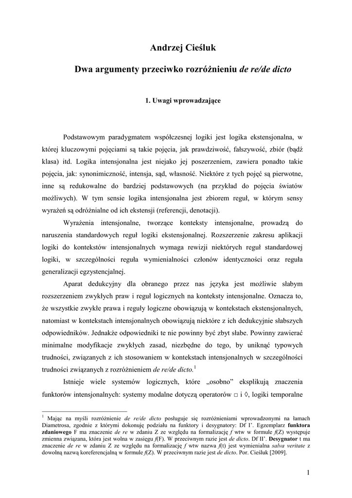 Andrzej Cieśluk Dwa argumenty przeciwko rozróżnieniu de re/de dicto 1. Uwagi wprowadzające Podstawowym paradygmatem współczesnej logiki jest logika ekstensjonalna, w której kluczowymi pojęciami są takie pojęcia, jak prawdziwość, fałszywość, zbiór (bądź klasa) itd. Logika intensjonalna jest niejako jej poszerzeniem, zawiera ponadto takie pojęcia, jak: synonimiczność, intensja, sąd, własność. Niektóre z tych pojęć są pierwotne, inne są redukowalne do bardziej podstawowych (na przykład do pojęcia światów możliwych). W tym sensie logika intensjonalna jest zbiorem reguł, w którym sensy wyrażeń są odróżnialne od ich ekstensji (referencji, denotacji). Wyrażenia intensjonalne, tworzące konteksty intensjonalne, prowadzą do naruszenia standardowych reguł logiki ekstensjonalnej. Rozszerzenie zakresu aplikacji logiki do kontekstów intensjonalnych wymaga rewizji niektórych reguł standardowej logiki, w szczególności reguła wymienialności członów identyczności oraz reguła generalizacji egzystencjalnej. Aparat dedukcyjny dla obranego przez nas języka jest możliwie słabym rozszerzeniem zwykłych praw i reguł logicznych na konteksty intensjonalne. Oznacza to, że wszystkie zwykłe prawa i reguły logiczne obowiązują w kontekstach ekstensjonalnych, natomiast w kontekstach intensjonalnych obowiązują niektóre z ich dedukcyjnie słabszych odpowiedników. Jednakże odpowiedniki te nie powinny być zbyt słabe. Powinny zawierać minimalne modyfikacje zwykłych zasad, niezbędne do tego, by uniknąć typowych trudności, związanych z ich stosowaniem w kontekstach intensjonalnych w szczególności trudności związanych z rozróżnieniem de re/de dicto.1 Istnieje wiele systemów logicznych, które „osobno” eksplikują znaczenia funktorów intensjonalnych: systemy modalne dotyczą operatorów □ i ◊, logiki temporalne 1 Mając na myśli rozróżnienie de re/de dicto posługuje się rozróżnieniami wprowadzonymi na łamach Diametrosa, zgodnie z którymi dokonuję podziału na funktory i desygnatory: Df I’. Egzemplarz funktora zdaniowego F ma znaczenie de re w zdaniu Z ze względu na formalizację f wtw w formule f(Z) występuje zmienna związana, która jest wolna w zasięgu f(F). W przeciwnym razie jest de dicto. Df II’. Desygnator t ma znaczenie de re w zdaniu Z ze względu na formalizację f wtw nazwa f(t) jest wymienialna salva veritate z dowolną nazwą koreferencjalną w formule f(Z). W przeciwnym razie jest de dicto. Por. Cieśluk [2009]. 1 – funktorów P i F, przekonaniowe – funktora Bel itd. Jednakże z punktu widzenia teorii mającej za zadanie reprezentować logiczną strukturę języka naturalnego, najkorzystniej jest traktować logikę intensjonalną jako ogólną logikę intensjonalną (general intensional logic).2 Jej zadaniem jest odzwierciedlenie fragmentu języka naturalnego, nie zaś analizy poszczególnych operatorów intensjonalnych w rachunkach nieekstensjonalnych. Jest to logika, w której występują kombinacje funktorów intensjonalnych, takich jak „z konieczności jest tak, że”, „wierzy, że” itd.3 Dalej interesować nas będzie jednolity system, zwierający operatory modalne, przekonaniowe, operator deskryptywny oraz kwantyfikatory pierwszego rzędu. Jest to możliwie najsłabszy system, dzięki któremu jesteśmy w stanie uchwycić liczne konteksty rozróżnienia de re/de dicto, nie wychodząc jednocześnie poza język pieszego rzędu. Przykładem modyfikacji w logice modalnej jest następujące osłabienie (PS): (PS/mod) α (a) ∧ a=b → α (a/b). Warto zauważyć, że jeśli a, b są sztywnymi desygnatorami i a=b jest prawdziwe, to a=b jest prawdziwe. Zatem z (PS/mod) wynika: α (a) ∧ a=b → α (a/b), gdy a i b są sztywnymi desygnatorami. Jest to konsekwencja zgodna z tezą Kripkego, że sformułowana przez Leibniza zasada nieodróżnialności identycznego (PS), określa pewną relację „wewnętrzną”.4 W logice modalnej zwykła zasada wymienialności członów identyczności (PS) musi być wówczas ograniczona do kontekstów ekstensjonalnych: (PS/eks) α (a) → α (a/b), 2 Andereson [1984], s. 355-358. Konstrukcja takiego systemu ogólnej logiki intensjonalnej umożliwia obronę przed argumentem „partykularyzmu” poszczególnych systemów logiki filozoficznej. 4 Pisze on: „Jeśli a i b są desygnatorami sztywnymi, wynika stąd, że zdanie a=b, jeśli jest prawdziwe, jest prawda konieczną. Jeśli a i b nie są sztywnymi desygnatorami, żaden taki wniosek co do zdania a=b nie wynika (choć przedmioty oznaczone przez a i b będą koniecznie identyczne).” Por. Kripke [2001], s. 8-9. 3 2 nie występuje w α w zasięgu funktora intensjonalnego. Przyjmujemy, że o ile a analogicznie rozwiązania są możliwe dla zasad dotyczących funktorów przekonaniowych. Innego typu rozwiązanie polega na zachowaniu (PS) w logice intensjonalnej, przy jednoczesnej modyfikacji teorii deskrypcji (w stylu teorii Russella). Pokażemy wkrótce, że takie rozwiązanie prowadzi do trywializacji sensu spójników modalnych. Odpowiedniemu ograniczeniu poddajemy również regułę generalizacji egzystencjalnej: α (a) → ∃ x α (x), (EG/eks) o ile a nie występuje w zasięgu funktora intensjonalnego. Jej użycie w kontekstach modalnych implikuje bowiem kłopotliwe założenie o bytowaniu przedmiotów nieistniejących (jeżeli a jest przedmiotem możliwym, to a istnieje). Ponadto (EG) jest związana z syntaktycznym rozróżnieniem de re/de dicto w następujący sposób: jeśli nazwa a występuje w jej poprzedniku ( α (a)) w zasięgu jakiegoś intensjonalnego funktora zdaniowego, który jest w pozycji de dicto, to ten funktor jest w następniku ( ∃ x α (x)) w pozycji de re. Na przykład w formule ◊P(a) → ∃ x◊P(x) funktor możliwości „◊” jest w poprzedniku w pozycji de dicto, a w następniku - w pozycji de re. W konsekwencji każde takie wystąpienie funktora de dicto jest redukowalne w 