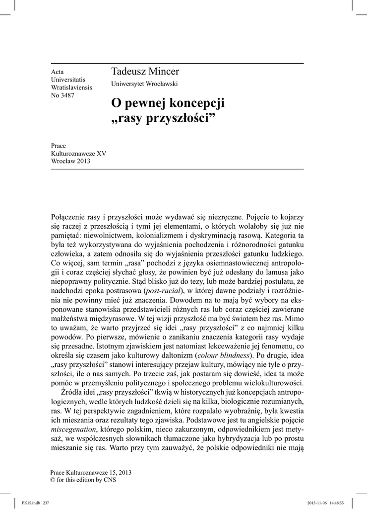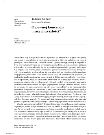 Acta Universitatis Wratislaviensis No 3487 Tadeusz Mincer Uniwersytet Wrocławski O pewnej koncepcji „rasy przyszłości” Prace Kulturoznawcze XV Wrocław 2013 Połączenie rasy i przyszłości może wydawać się niezręczne. Pojęcie to kojarzy się raczej z przeszłością i tymi jej elementami, o których wolałoby się już nie pamiętać: niewolnictwem, kolonializmem i dyskryminacją rasową. Kategoria ta była też wykorzystywana do wyjaśnienia pochodzenia i różnorodności gatunku człowieka, a zatem odnosiła się do wyjaśnienia przeszłości gatunku ludzkiego. Co więcej, sam termin „rasa” pochodzi z języka osiemnastowiecznej antropologii i coraz częściej słychać głosy, że powinien być już odesłany do lamusa jako niepoprawny politycznie. Stąd blisko już do tezy, lub może bardziej postulatu, że nadchodzi epoka postrasowa (post-racial), w której dawne podziały i rozróżnienia nie powinny mieć już znaczenia. Dowodem na to mają być wybory na eksponowane stanowiska przedstawicieli różnych ras lub coraz częściej zawierane małżeństwa międzyrasowe. W tej wizji przyszłość ma być światem bez ras. Mimo to uważam, że warto przyjrzeć się idei „rasy przyszłości” z co najmniej kilku powodów. Po pierwsze, mówienie o zanikaniu znaczenia kategorii rasy wydaje się przesadne. Istotnym zjawiskiem jest natomiast lekceważenie jej fenomenu, co określa się czasem jako kulturowy daltonizm (colour blindness). Po drugie, idea „rasy przyszłości” stanowi interesujący przejaw kultury, mówiący nie tyle o przyszłości, ile o nas samych. Po trzecie zaś, jak postaram się dowieść, idea ta może pomóc w przemyśleniu politycznego i społecznego problemu wielokulturowości. Źródła idei „rasy przyszłości” tkwią w historycznych już koncepcjach antropologicznych, wedle których ludzkość dzieli się na kilka, biologicznie rozumianych, ras. W tej perspektywie zagadnieniem, które rozpalało wyobraźnię, była kwestia ich mieszania oraz rezultaty tego zjawiska. Podstawowe jest tu angielskie pojęcie miscegenation, którego polskim, nieco zakurzonym, odpowiednikiem jest metysaż, we współczesnych słownikach tłumaczone jako hybrydyzacja lub po prostu mieszanie się ras. Warto przy tym zauważyć, że polskie odpowiedniki nie mają Prace Kulturoznawcze 15, 2013 © for this edition by CNS PK15.indb 237 2013-11-06 14:48:55 238 Tadeusz Mincer takiego zabarwienia, jakie w świecie anglosaskim cechuje właśnie kategorię miscegenation, mającą przede wszystkim znaczenie polityczne. Termin ten po raz pierwszy użyty został w 1863 roku w anonimowym, quasi-naukowym pamflecie wydanym w Nowym Jorku. Nosił on tytuł Metysaż: Teoria mieszania się ras dotycząca amerykańskiego białego człowieka i Murzyna1. Autor tekstu chciał terminem tym zastąpić niewystarczająco naukowe, jego zdaniem, pojęcia amalgamacji. Przewodnia myśl tego tekstu, stylizowanego na rozprawę naukową, jest taka: Wszelka siła i żywotność, która tkwi w rasie amerykańskiej, pochodzi nie z jego przodków anglosaskich, ale z wszystkich różnych narodowości. [...] Wszystko, co jest potrzebne, aby uczynić z nas najwspanialszą rasę na świecie, to zaszczepić do naszych zasobów elementy murzyńskie, które opatrzność umieściła obok nas na tym kontynencie2. Interesujące jest motto, które rozpoczyna tę książkę. Jest to fragment z dramatu Juliusz Cezar Williama Shakespeare’a: a była w nim samym taka harmonia, że Natura może powstać i głosić światu „To był człowiek!”3. Wywód rozpoczyna się od rozważań nad równością ras białych i kolorowych, a także nad wyższością wobec nich ras mieszanych. Następnie autor udowadnia, że mieszanie się różnej krwi jest niezbędne dla postępu w Ameryce. Szczególnie zaś istotne jest włączenie „elementu murzyńskiego”, który — wbrew obiegowym wówczas opiniom — ma być szczególnie wartościowy. Przykładowo autor wskazuje, że rozwój duchowy ludzkości, a także stworzenie wszystkich głównych światowych religii, jest przede wszystkim wkładem człowieka czarnego4. Wspomniany pamflet ukazał się tuż przed świętami Bożego Narodzenia 1863 roku. Dość długo uważano, że jest to tekst prawdziwy. W lutym 1864 do zakupu tej książki namawiały reklamy, które ukazywały się w prasie abolicjonistów. Czołowi przedstawiciele tego ruchu, mimo pewnych zastrzeżeń, rekomendowali tę publikację5. W czerwcu tegoż roku zaś została ona wydana w Londynie. Dopiero na początku listopada na łamach brytyjskiej prasy mistyfikacja została ujawniona, a trzy tygodnie później informacja ta trafiła do Nowego Jorku. Autorami publikacji, jak ustalono kilka lat później, okazali się David Goodman Croly oraz George Wakeman, dziennikarze związani z „New York World”, gazetą wspierającą politykę demokratów. W połowie XIX wieku to nie republikanie, ale demokraci byli bowiem zwolennikami status quo, jeśli chodzi o relacje rasowe. Warto 1 Zob. D.G. Croly, Miscegenation: The Theory of the Blending of the White and Negro Race, New York 1864, http://archive.org/details/miscegenationthe00crol (dostęp: 30 grudnia 2012). 2 Ibidem, s. 11. 3 W. Shakespeare, Juliusz Cezar, przeł. S. Barańczak, Kraków 2000, s. 161–162. Fragment ten dotyczy tytułowego bohatera, a harmonia odnosić się miała do idealnego połączeniu różnych żywiołów. 4 D.G. Croly, op. cit., s. 23–24. 5 Zob. The Miscegenation Hoax 1863, http://www.museumofhoaxes.com/hoax/archive/permalink/the_miscegenation_hoax (dostęp: 30 grudnia 2012). Prace Kulturoznawcze 15, 2013 © for this edition by CNS PK15.indb 238 2013-10-30 11:16:36 O pewnej koncepcji „rasy przyszłości” 239 tutaj pamiętać o kontekście politycznym. Jeden z ostatnich rozdziałów omawianej książki nosi tytuł Metysaż w kontekście prezydenckich wyborów. W rozdziale tym autorzy sugerowali, że kwestia mieszania się ras jest klucz