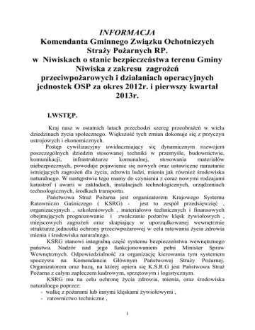 INFORMACJA Komendanta Gminnego Związku Ochotniczych Straży Pożarnych RP. w Niwiskach o stanie bezpieczeństwa terenu Gminy Niwiska z zakresu zagrożeń przeciwpożarowych i działaniach operacyjnych jednostek OSP za okres 2012r. i pierwszy kwartał 2013r. I.WSTĘP. Kraj nasz w ostatnich latach przechodzi szereg przeobrażeń w wielu dziedzinach życia społecznego. Większość tych zmian dokonuje się z przyczyn ustrojowych i ekonomicznych. Postęp cywilizacyjny uwidaczniający się dynamicznym rozwojem poszczególnych dziedzin stosowanej techniki w przemyśle, budownictwie, komunikacji, infrastrukturze komunalnej, stosowania materiałów niebezpiecznych, powoduje pojawienie się nowych oraz ustawiczne narastanie istniejących zagrożeń dla życia, zdrowia ludzi, mienia jak również środowiska naturalnego. W następstwie tego mamy do czynienia z coraz nowymi rodzajami katastrof i awarii w zakładach, instalacjach technologicznych, urządzeniach technologicznych, środkach transportu. Państwowa Straż Pożarna jest organizatorem Krajowego Systemu Ratowniczo Gaśniczego ( KSRG) jest to zespół przedsięwzięć , organizacyjnych , szkoleniowych , materiałowo technicznych i finansowych obejmujących prognozowanie i zwalczanie pożarów klęsk żywiołowych , miejscowych zagrożeń oraz skupiający w uporządkowanej wewnętrznie strukturze jednostki ochrony przeciwpożarowej w celu ratowania życia zdrowia mienia i środowiska naturalnego. KSRG stanowi integralną część systemu bezpieczeństwa wewnętrznego państwa. Nadzór nad jego funkcjonowaniem pełni Minister Spraw Wewnętrznych. Odpowiedzialność za organizację kierowania tym systemem spoczywa na Komendancie Głównym Państwowej Straży Pożarnej. Organizatorem oraz bazą, na której opiera się K.S.R.G jest Państwowa Straż Pożarna z całym zapleczem kadrowym, sprzętowym i logistycznym. KSRG ma na celu ochronę życia zdrowia, mienia, oraz środowiska naturalnego poprzez: - walkę z pożarami lub innymi klęskami żywiołowymi , - ratownictwo techniczne , 1 - ratownictwo chemiczne , - ratownictwo ekologiczne , - ratownictwo medyczne , Zapewnienie bezpieczeństwa obywateli to zadanie państwa jak również samorządów lokalnych. II. OGÓLNA CHARAKTERYSTYKA GMINY NIWISKA. Na terenie naszej gminy znajduje się: 9 sołectw zajmując łącznie 96 km2 jest to obszar 9505 ha. 4361 ha lasów jest to 45.5% powierzchni ogólnej zaliczane są do drugiej i trzeciej kategorii niebezpieczeństwa pożarowego. 2514 gospodarstw rolnych w tym działki rekreacyjne. 157 podmiotów gospodarki narodowej – przedsiębiorcy. 9 jednostek OSP zrzeszonych w Związku Ochotniczych Straży Pożarnych Rzeczpospolitej Polskiej. Gminę zamieszkuje 6045 mieszkańców. Analiza pożarów wskazuje, że obszarami na których powstaje ich najwięcej są gospodarstwa rolne i lasy. Największe zagrożenie pożarowe obszarów leśnych występuje szczególnie w okresie wczesnej wiosny, kiedy to mają miejsce nagminne wypalania traw i pozostałości roślinnych na łąkach i nieużytkowych powierzchniach rolniczych, położonych nierzadko w pobliżu lasów i zabudowań gospodarczych. Drogi leśne posiadają nawierzchnię gruntową, utwardzoną a także asfaltową. Utrudniony dojazd do pożarów w lasach jest drogami gruntowymi zwłaszcza w okresie dużego zagrożenia pożarowego. Przeciwpożarowe zaopatrzenie wodne dla celów gaśniczych lasów na terenie naszej gminy jest wystarczające. Przez teren gminy przebiega jedna droga wojewódzka Nr 875 relacji Mielec – Leżajsk, pozostałe drogi to powiatowe i gminne. Gmina Niwiska jest zgazyfikowana w 100% miejscowości za wyjątkiem dwóch przysiółków wsi Kosowy tj. : Ługnica i Góra Kosowska. Poszczególne miejscowości zgazyfikowane są technika średniego ciśnienia z zastosowaniem indywidualnych reduktorów domowych. Gaz ziemny używany jest do celów konsumpcyjnych i grzewczych. Około 10% gospodarstw korzysta z gazu płynnego z 11 kilogramowych butli, które nie zawsze są we właściwy sposób przechowywane i wymieniane . Również zagrożenie pożarowe i wybuchowe stwarza stacja paliw płynnych i L.P.G w Niwiskach, oraz stacja LPG w Kosowach. Zaopatrzenie wodne gminy dla celów gaśniczych i konsumpcyjnych jest dobre, wszystkie miejscowości gminy wyposażone są w sieć hydrantową z dwóch ujęć wody w Niwiskach o wydajności 86 m3 /h i w Przyłęku o 2 wydajności 54m3 /h. Ponadto w kilku miejscowościach znajdują się naturalne zbiorniki wodne prywatne i jeden stanowiący własność gminy. Do celów gaśniczych może być również wykorzystywana woda z cieków wodnych i z rzeki Trześniówka. Spadek ciśnienia w sieci hydrantowej podczas poboru wody do celów gaśniczych występuje w miejscowościach najdalej oddalonych od ujęc wody tj: Leszcze, Kosowy, Hucisko. Gmina zasilana jest napięciem średnim o wartości 15kV (kilowoltów) z linii napowietrznych, magistralnych wyprowadzonych ze stacji redukcyjnych w Kolbuszowej i Mielcu. Magistrale rozgałęziają się na terenie gminy. Stacje transformatorowe średniego i niskiego napięcia są źródłem zasilania wiejskiej sieci konsumpcyjnej i oświetleniowej, bezpośrednio zasilającej odbiorców. W miejscowości Przyłęk znajduje się zakład POLDIM Mielec Sp.z.o.o „Wytwórnia Mas Bitumicznych”, która stwarza zagrożenie pożarowe i wybuchowe ze względu na wykorzystywanie w procesie technologicznym i magazynowanie gazu propan – butan 10 – zbiorników po 6.400 l każdy i 1x 4000 l, dwa zbiorniki podziemne z olejem opałowym 2 x 100 000 l, zbiorniki technologiczne 2 x 2000 l , 1 x 1000 l ,zbiornik nadziemny O.N.-5000 l , zbiorniki asfaltu 3 x 50t. III . OTWP. W okresie sprawozdawczym w 2012r i 2013r. w miesiącu marcu zorganizowany był Ogólnopolski Turniej Wiedzy Pożarniczej pod hasłem „Młodzież zapobiega pożarom”, na szczeblu eliminacji gminnych w kategorii szkół podstawowych i gimnazjum. Celem turnieju jest popularyz