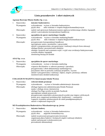 Załącznik nr 1 do Regulaminu 1. Edycji Konkursu „Czas na Staż” Lista pracodawców i ofert stażowych Agencja Rozwoju Miasta Siedlce Sp. z o.o. 1. Stanowisko: Wymagania: Obowiązki: 2. Stanowisko: Wymagania: Obowiązki: inżynier budownictwa wykształcenie wyższe w kierunku budownictwo języki obce mile widziane w stopniu biegłym/komunikatywnym nadzór nad sprawnym funkcjonowaniem zaplecza technicznego obiektu Aquapark udział w prowadzeniu korespondencji handlowej specjalista do spraw marketingu i handlu wykształcenie wyższe w kierunku marketing/handel języki obce mile widziane w stopniu biegłym/komunikatywnym przygotowanie korespondencji handlowej sporządzanie umów, protokołów i sprawozdań udział w programowaniu, przygotowaniu i realizacji różnych form rekreacji obsługa klienta i prezentowanie obiektów obsługa i kontrola nad systemem wejść i wyjść oraz ewidencja funkcjonowania systemu obiektu Aquapark monitoring bieżących działań ASAJ Sp. z o.o. 1. Stanowisko: Wymagania: Obowiązki: specjalista do spraw marketingu wykształcenie wyższe w kierunku marketing wsparcie dla klientów w zakresie promocji i sprzedaży przygotowanie i obrót dokumentacji marketingowej pozyskanie ofert na potrzeby realizacji projektów, wycena udział w przygotowaniu i realizacji: imprez, targów; promocja, reklama monitorowanie działań konkurencji COLLEGIUM MAZOVIA Innowacyjna Szkoła Wyższa 1. Stanowisko: Wymagania: Obowiązki: referent działu promocji wykształcenie wyższe w kierunku administracja/ ekonomia obsługa logistyczno-administracyjna Działu Promocji nauka i obsługa strony internetowej obsługa Fun Page uczelni na portalu Facebook sporządzanie notatek prasowych przygotowanie materiałów promocyjnych uczelni oraz imprez cyklicznych pomoc przy organizacji przedsięwzięć, konferencji i seminariów wsparcie wyjazdów promocyjnych do szkół ponadgimnazjalnych udział w imprezach targowych M3 Przedsiębiorstwo Budownictwa Mieszkaniowego sp. jawna 1. Stanowisko: inżynier budowy Wymagania: wykształcenie wyższe w kierunku budownictwo języki obce angielski komunikatywny nadzór na procesem przygotowania inwestycji organizacja placu budowy i kolejnych etapów realizacji obiektów nadzór nad pracami wykończeniowymi prowadzenie dokumentacji Obowiązki: 1 M3 Zarządzanie nieruchomościami 1. Stanowisko: referent administracyjny do spraw nieruchomości Wymagania: wykształcenie wyższe w kierunku rachunkowość umiejętności obsługa komputera - pakiet MS Office wprowadzanie danych o lokalach do programu obsługi nieruchomości tworzenie rozliczeń kosztów oraz dokonywanie zestawień Obowiązki: Stadler Polska sp. z o.o. 1. Stanowisko: inżynier do spraw jakości Wymagania: wykształcenie wyższe techniczne w kierunku inżynieria produkcji/ jakości języki obce mile widziany angielski/niemiecki umiejętności: czytanie rysunku technicznego wiedza z zakresu budowy, działania urządzeń i komponentów elektrycznych i mechanicznych, obsługa podstawowych urządzeń pomiarowych bardzo dobra obsługa komputera - pakiet MS Office ustalanie wskaźników jakościowych w procesie produkcji pojazdu szynowego opracowanie standardu przedstawiania wskaźników w poszczególnych działach produkcji, rejestracja wskaźników jakościowych analiza przebiegu wskaźników i produkcja działań korygujących Obowiązki: 2. Stanowisko: Wymagania: Obowiązki: 3. Stanowisko: Wymagania: Obowiązki: pracownik biurowy do zespołu dystrybucji materiałowej wykształcenie wyższe w kierunku logistyka języki obce wskazany jeden z angielski/ niemiecki/rosyjski umiejętności obsługa komputera - pakiet MS Office przyjmowanie do awizacji dostaw wystawianie dokumentów wysyłkowych kontakt z dostawcami kontrola dokumentów wchodzących administracyjne wsparcie magazynu pracownik biurowy do zespołów transportu i logistyki wykształcenie wyższe w kierunku logistyka języki obce wskazany jeden z angielski/ niemiecki/rosyjski umiejętności obsługa komputera - pakiet MS Office przyjmowanie do awizacji dostaw wystawianie dokumentów wysyłkowych kontakt z dostawcami kontrola dokumentów wchodzących administracyjne wsparcie magazynu Stowarzyszenie SOS Wioski Dziecięce w Polsce Placówka Wsparcia Dziennego w Trzcińcu z filią w Grali 1. Stanowisko: pedagog Wymagania: wykształcenie wyższe w kierunku pedagogika opiekuńczo-wychowawcza/ psychologia/ resocjalizacja/ socjoterapia prawo jazdy kategoria B umiejętności komunikacji interpersonalnej, organizacyjne, pracy w grupie planowanie, organizacja i prowadzenie zajęć pedagogiczne/psychologiczne sprawowanie opieki wychowawczej nad grupą dzieci lub młodzieży w Placówce Wsparcia Dziennego, przestrzegając praw określonych w konwencji o prawach dziecka współpraca z rodzicami, opiekunami, instytucjami i organizacjami w celu zapewnienia wychowankom warunków prawidłowego rozwoju a także pomocy w trudnych sytuacjach Obowiązki: 2 Szkoła Języków Obcych EUROSCHOOL Grupa 1. Stanowisko: specjalista do spraw marketingu i handlu Wymagania: wykształcenie wyższe w kierunku zarządzanie i marketing umiejętności kreatywność, komunikatywność, organizacyjne kreowanie wizerunku firmy poprzez poznanie i analizę oferty firmy pomoc przy badaniu i analizie rynku tworzenie i realizacja kampanii reklamowych tworzenie strategii marketingowych, nowych ścieżek rozwoju formy utrzymanie pozytywnych relacji z aktualnymi klientami, kontrahentami i efektywne pozyskiwanie nowych tworzenie, realizacja projektów Obowiązki: Urząd Gminy w Suchożebrach 1. Stanowisko: młodszy referent do spraw księgowości Wymagania: wykształcenie wyższe umiejętności obsługa komputera, korzystanie z Internetu zapoznanie się z pracą działu księgowości urzędu gminy współpraca podczas opracowywania projektu budżetu udział w opracowywaniu uchwał w sprawach podatków i opłat lokalnych oraz w sprawach majątkowych dotyczących dochodów i zobowiązań fina