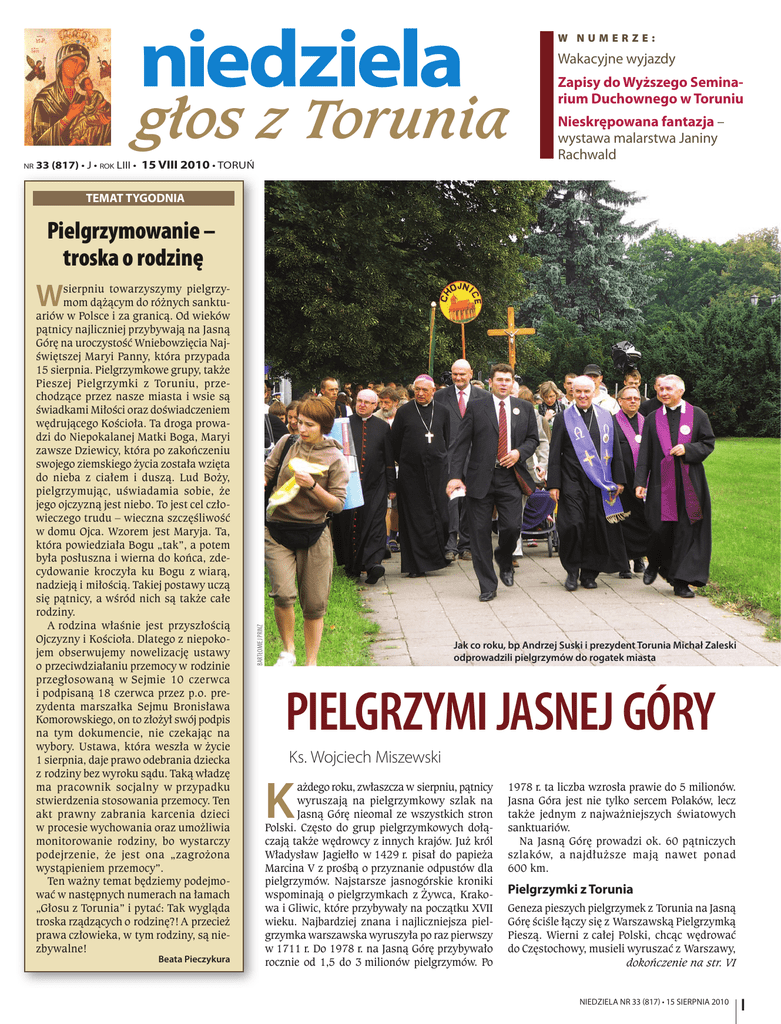 niedziela w numerze: Wakacyjne wyjazdy głos z Torunia 33 (817) • J • rok LIII • 15 VIII 2010 • toruń Nieskrępowana fantazja – wystawa malarstwa Janiny Rachwald temat tygodnia Pielgrzymowanie – troska o rodzinę W sierpniu towarzyszymy pielgrzymom dążącym do różnych sanktuariów w Polsce i za granicą. Od wieków pątnicy najliczniej przybywają na Jasną Górę na uroczystość Wniebowzięcia Najświętszej Maryi Panny, która przypada 15 sierpnia. Pielgrzymkowe grupy, także Pieszej Pielgrzymki z Toruniu, przechodzące przez nasze miasta i wsie są świadkami Miłości oraz doświadczeniem wędrującego Kościoła. Ta droga prowadzi do Niepokalanej Matki Boga, Maryi zawsze Dziewicy, która po zakończeniu swojego ziemskiego życia została wzięta do nieba z ciałem i duszą. Lud Boży, pielgrzymując, uświadamia sobie, że jego ojczyzną jest niebo. To jest cel człowieczego trudu – wieczna szczęśliwość w domu Ojca. Wzorem jest Maryja. Ta, która powiedziała Bogu „tak”, a potem była posłuszna i wierna do końca, zdecydowanie kroczyła ku Bogu z wiarą, nadzieją i miłością. Takiej postawy uczą się pątnicy, a wśród nich są także całe rodziny. A rodzina właśnie jest przyszłością Ojczyzny i Kościoła. Dlatego z niepokojem obserwujemy nowelizację ustawy o przeciwdziałaniu przemocy w rodzinie przegłosowaną w Sejmie 10 czerwca i podpisaną 18 czerwca przez p.o. prezydenta marszałka Sejmu Bronisława Komorowskiego, on to złożył swój podpis na tym dokumencie, nie czekając na wybory. Ustawa, która weszła w życie 1 sierpnia, daje prawo odebrania dziecka z rodziny bez wyroku sądu. Taką władzę ma pracownik socjalny w przypadku stwierdzenia stosowania przemocy. Ten akt prawny zabrania karcenia dzieci w procesie wychowania oraz umożliwia monitorowanie rodziny, bo wystarczy podejrzenie, że jest ona „zagrożona wystąpieniem przemocy”. Ten ważny temat będziemy podejmować w następnych numerach na łamach „Głosu z Torunia” i pytać: Tak wygląda troska rządzących o rodzinę?! A przecież prawa człowieka, w tym rodziny, są niezbywalne! Beata Pieczykura Bartłomiej Prinz nr Zapisy do Wyższego Seminarium Duchownego w Toruniu Jak co roku, bp Andrzej Suski i prezydent Torunia Michał Zaleski odprowadzili pielgrzymów do rogatek miasta Pielgrzymi Jasnej Góry Ks. Wojciech Miszewski K ażdego roku, zwłaszcza w sierpniu, pątnicy wyruszają na pielgrzymkowy szlak na Jasną Górę nieomal ze wszystkich stron Polski. Często do grup pielgrzymkowych dołączają także wędrowcy z innych krajów. Już król Władysław Jagiełło w 1429 r. pisał do papieża Marcina V z prośbą o przyznanie odpustów dla pielgrzymów. Najstarsze jasnogórskie kroniki wspominają o pielgrzymkach z Żywca, Krakowa i Gliwic, które przybywały na początku XVII wieku. Najbardziej znana i najliczniejsza pielgrzymka warszawska wyruszyła po raz pierwszy w 1711 r. Do 1978 r. na Jasną Górę przybywało rocznie od 1,5 do 3 milionów pielgrzymów. Po 1978 r. ta liczba wzrosła prawie do 5 milionów. Jasna Góra jest nie tylko sercem Polaków, lecz także jednym z najważniejszych światowych sanktuariów. Na Jasną Górę prowadzi ok. 60 pątniczych szlaków, a najdłuższe mają nawet ponad 600 km. Pielgrzymki z Torunia Geneza pieszych pielgrzymek z Torunia na Jasną Górę ściśle łączy się z Warszawską Pielgrzymką Pieszą. Wierni z całej Polski, chcąc wędrować do Częstochowy, musieli wyruszać z Warszawy, dokończenie na str. VI NIEDZIELA NR 33 (817) • 15 sierpnia 2010 I głos z Torunia Festyn parafialny Zdaniem Brodnica Już po raz ósmy w 17-letniej historii parafii pw. Jezusa Miłosiernego w Brodnicy 18 lipca z inicjatywy proboszcza ks. Wiesława Pacaka odbył się festyn parafialny. Tradycyjnie głównym celem tego wydarzenia, obok integracji parafian, była zbiórka pieniężna na budowaną świątynię. Kościół – wznoszony tylko dzięki ofiarności wiernych – jest w stanie surowym, oddano już do użytku część prezbiterialną wraz z transeptem, przyozdobioną techniką sgraffito. Do wykonania pozostały jeszcze zdobienia sgraffito w głównej nawie. Prace te są bardzo kosztowne. Ks. Pacak rozpoczął również budowę plebanii. Dochód z festynu miał więc pomóc w realizacji parafialnych inwestycji. Pogoda w tym roku była łaskawa. Parafialny sztab organizacyjny na czele z Księdzem Proboszczem oraz przyjacielem parafii Ryszardem Rynkowskim zadbał, aby każdy czuł się dobrze, bezpiecznie i był zadowolony. W organizację włączył się burmistrz Brodnicy, który zorganizował scenę, a lokalna telewizja kablowa „Eltronik” objęła patronat medialny, stając się głównym sponsorem imprezy. Dla dzieci przygotowano miasteczko zabaw, malowanie twarzy, przejażdżkę kucykiem. Zainteresowaniem cieszyły się loteria fantowa, w której każdy los wygrywał, i licytacja wielu atrakcyjnych przedmiotów ufundowanych przez firmy oraz parafian. Na festyn zebrano ponad 4 tys. fantów. Największym powodzeniem cie- Modlitwa różańcowa nas jednoczy Na scenie wystąpili Ryszard Rynkowski i „Skaldowie”, a nad przebiegiem festynu czuwał ks. Wiesław Pacak szył się koncert „Skaldów”, którzy zaśpiewali swoje najbardziej popularne piosenki. Przed ich występem można było posłuchać zespołów „Miando” z Wrock oraz „Ostatnia Deska Ratunku”, grającego szanty. Jak co roku, nie mogło zabraknąć na scenie Ryszarda Rynkowskiego, współorganizatora festynu, który wykonał swoje stare przeboje i te najnowsze z ostatniej płyty. Po koncercie pan Ryszard wraz z ks. Wiesławem poprowadzili losowanie nagród, w tym pielgrzymki do Wiednia i Budapesztu, nawigacji satelitarnej, sprzętu RTV i AGD. Ostatnią wśród losowanych nagród była nagroda 100 tys. zł, ufundowana przez anonimowego parafianina. Jak się później okazało, owe 100 tys. było kupką zmielonych banknotów, wydanych przez wytwórnię p