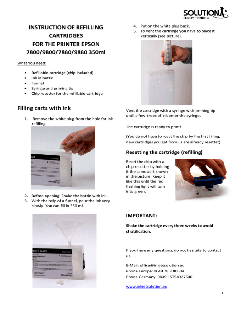 INSTRUCTION OF REFILLING CARTRIDGES FOR THE PRINTER EPSON 7800/9800/7880/9880 350ml 4. Put on the white plug back. 5. To vent the cartridge you have to place it vertically (see picture). What you need: • • • • • Refillable cartridge (chip included) Ink in bottle Funnel Syringe and priming tip Chip resetter for the refillable cartridge Filling carts with ink 1. Remove the white plug from the hole for ink refilling. Vent the cartridge with a syringe with priming tip until a few drops of ink enter the syringe. The cartridge is ready to print! (You do not have to reset the chip by the first filling, new cartridges you get from us are already resettet) Resetting the cartridge (refilling) 2. Before opening. Shake the bottle with ink. 3. With the help of a funnel, pour the ink very slowly. You can fill in 350 ml. Reset the chip with a chip resetter by holding it the same as it shown in the picture. Keep it like this until the red flashing light will turn into green. IMPORTANT: Shake the cartridge every three weeks to avoid stratification. If you have any questions, do not hesitate to contact us. E-Mail: [email protected] Phone Europe: 0048 786180004 Phone Germany: 0049 15754927540 www.inkjetsolution.eu 1 INSTRUKCJA NAPEŁNIANIA KARTRIDŻY WIELOKROTNEGO UŻYTKU DO DRUKAREK EPSON 7800/9800/7880/9880 350ml 4. Zamknij otwór białym korkiem. 5. Aby odpowietrzyć kartridż trzeba go ustawić pionowo. (patrz obrazek poniżej). Proszę przygotować: • • • • • Kartridż wiielokrotnego uzytku Tusze Lejek Strzykawka + nakładka Resetter do kartridży wielokrotnego uzytku Napełnianie 1. Wyciągnij biały korek do nalewania tuszy. Odpowietrznij kartridż za pomocą strzykawki z nakładką, odsysając powietrze tak długo aż tusz zacznie wpływać do strzykawki. Kartridż jest gotowy aby umieścić go w drukarce! (Przy pierwsym napełnianiu kartridża, chip nie wymaga resetowania) Resetowanie chipa 2. Zanim otworzysz butelkę z tuszem, wstrząśnij ją. 3. Za pomocą lejka wlej pomału tusz. Kartridż ma pojemność 350 ml. Zresetuj chip za pomocą resetera przytrzymując go w sposób widoczny na zdjęciu do czasu aż mrugające czerwone światełko zrobi się zielone. Ważne: Należy wstrząsnąć kartridżem co trzy tygodnie aby uniknąć rozwarstwienia tuszu. Niezależnie od ilości napełnień, kartridż powinien być wymieniony po roku użytkowania. W razie jakichkolwiek pytań, jesteśmy do dyspozycji: E-mail: [email protected] Telefon Polska: 0048 61 2938 300 Telefon Europa: 0048 786180004 Telefon Niemcy: 0049 15754927540 www.inkjetsolution.pl 2
