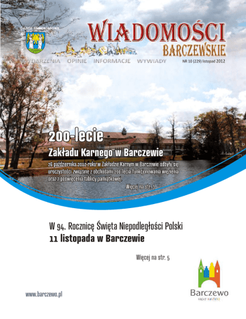 NR 10 (229) listopad 2012 W 94. Rocznicę Święta Niepodległości Polski 11 listopada w Barczewie www.barczewo.pl Humor w obiektywie OGŁOSZENIE Dnia 15 października 2012 roku w siedzibie Mazurskiego Banku Spółdzielczego przy ul. Mickiewicza 40 w Barczewie (II piętro, naprzeciwko Urzędu Miasta) uruchomiony został Punkt Konsultacyjny. Przyjmowane są w nim osoby zainteresowane aktem notarialnym dotyczącym: kupna, darowizny, sporządzenia testamentu, pełnomocnictwa, poświadczenia własnoręczności podpisu, przeprowadzenia postępowania spadkowego po zmarłej osobie. Po przygotowaniu niezbędnych dokumentów projekt aktu notarialnego zostaje sporządzony i odczytany. Porady dotyczące aktu notarialnego są bezpłatne. Dodatkowo w punkcie świadczone są usługi, w szczególności dotyczące spraw z zakresu prawa cywilnego, gospodarczego i handlowego. Dla ustalenia terminów spotkań podaję numery telefonów: 881628210, 536307671 Halina Milewska “Nie taki grzyb straszny” fot. Barbara Kosowska Stowarzyszenie Inicjatyw Obywatelskich w Barczewie pilnie poszukuje wolontariusza do prowadzenia prac biurowych w siedzibie stowarzyszenia. Obsługa komputerów, prowadzenie innych prac biurowych codziennie w godzinach 10 – 13. Kontakt telefoniczny – 605 431 837 : 515 501 369 lub w siedzibie SIO w Barczewie, ul. Mickiewicza 40. Prezes Zarządu SIO Danuta Zielonka - 5 października na Osiedlu Słonecznym w Barczewie dokonano kradzieży samochodu Volkswagen Sharan o wartości szacunkowej 25 tyś. złotych. Kradzieży dokonał nieznany sprawca w nocy z 4 na 5 października. - 6 października znany już policji sprawca, członek rodziny pokrzywdzonego właściciela, dokonał kradzieży jego samochodu Volkswagen Golf. Sprawca, młody chłopak najpierw ukradł swemu wujowi portfel z kluczykami, a następnie uruchomił pojazd i udał się na przejażdżkę po ulicach Barczewa. Policja odzyskała samochód i przekazała właścicielowi. - 7 października, policja podczas rutynowej kontroli zatrzymała pijanego kierowcę, właściciela Fiata Punto. - 9 października w Wipsowie doszło do spalenia dachu na budynki mieszkalnym. Przyczyną WIADOMOSCI BARCZEWSKIE Komunikat Barczewskiej Policji. Policja ostrzega, że na terenie naszego województwa pojawili się oszuści, którzy znaną metodą „na wnuczka” wyłudzają pieniądze od starszych osób. Dotychczas w Olsztynie odnotowano trzy przypadki oszustwa, w tym jeden na znaczną sumę. Metoda oszustwa jest następująca. Najczęściej szajka oszustów najpierw informuje przez telefon wytypowane osoby, o tym, że ich wnuczek miał wypadek samochodowy i potrzebuje w związku z tym pieniędzy. Telefonujący oszust ma łatwość nawiązywania rozmowy, jest przekonujący i potrafi od swego rozmówcy wyciągnąć dane osobowe wnuczka. Często osoby wyłudzające podszywają się pod policjantów działających po cywilnemu, pragnących pomóc ofierze wypadku. Dziadkowie o tym, że zostali oszukani dowiadują się po kilku dniach. W kontaktach tego typu najlepiej kierować się ograniczonym zaufaniem do składanej propozycji. Policja ostrzega, że pod żadnym pozorem nie można przekazywać pieniędzy. Najlepiej o fakcie nawiązania kontaktu w sprawie „pomocy dla wnuczka” powiadomić miejscową policję. Wydanie bieżące i numery archiwalne dostępne są w Biurze Informacji, w Barczewie przy ul. Mickiewicza 12 Redaktor naczelny: Mariola Łukowska-Juckiewicz e-mail: [email protected] Redaktor Anna Rok pożaru była nieszczelność przewodu kominowego. - 11 października policja otrzymała informację o tym, że na targowisku przy Ratuszu dokonano kradzieży przewodów elektrycznych instalacji oświetleniowej. Stoiska stanowiły obiekty zrewitalizowanej starówki miasta. - 20 października w Barczewie kierowca Opla Vektry został złapany na jeździe po pijanemu. - 26 października w Barczewie w domu przy ulicy Mickiewicza miał miejsce wybuch butli gazowej. Nikomu z domowników nic się nie stało. - W październiku zatrzymano 7 dowodów rejestracyjnych pojazdów, 2 prawa jazdy oraz 5 osób poszukiwanych listem gończym. Zebrał Jan Krakowiak Redaktor Wojciech Zenderowski e-mail: [email protected] Współpraca: E. Kaczyńska, J. Pastuszenko, L. Zelman, B. Caruk, J. Krasowska-Szwarc, B. Silska, J. Baran-Niska Wydawca: Centrum Kultury i Promocji Gminy Adres: Barczewo, ul. Słowackiego 5 Tel. / fax. 89 514 82 81 Redaktor, korekta Grzegorz Gawrylczyk Druk: Zakład Poligraficzny J. Skrajnowski, 11-300 Biskupiec, ul. Krótka 1 Redaktor Jan Krakowiak 2 Skład DTP: Zbigniew Kozłowski e-mail: [email protected] Redakcja nie ponosi odpowiedzialności za treść ogłoszeń i reklam, nie zwraca tekstów nie zamówionych oraz zastrzega sobie prawo skracania i opracowywania tekstów. Redakcja informuje o możliwości zamieszczenia reklam. GAZETA SAMORZĄDOWA 10 (229) listopad 2012 www.gazeta.barczewo.pl zdj. okładka - Zbigniew Kozłowski Wydarzenia 200- lecie Zakładu Karnego w Barczewie „Pamięci więźniów politycznych walczących o wolną i demokratyczną Polskę” „…Na wyznaczonym miejscu zbudowano klasztor i osadzono w nim braci mniejszych tzw. franciszkanów. Biskupi oddali im jeszcze areał na ogród i łąki oraz prawo do łowienia ryb w pobliskich akwenach. Za datę przeznaczenia budynków na więzienie wielu historyków przyjmuje rok 1812, kiedy to władze pruskie wbrew propozycji Biskupa Warmińskiego Józefa von Hohenzollerna „umieściły tam więzienie”….” 26 października 2012 roku w Zakładzie kulturalnych, służby zdrowia z terenu BarKarnym w Barczewie odbyły się uroczystości czewa, Lecha Jana Nitkowskiego burmistrza związane z obchodami 200-lecia funkcjono- oraz Macieja Leszczyńskiego burmistrza wania więzienia oraz z poświęcenia tablicy Jezioran, przedstawicieli sądownictwa, pamiątkowej. Początek uroczystości miał prokuratur, przedstawicieli służb mundumiejsce w kościele Św. Anny w Barczewie, rowych: wojs