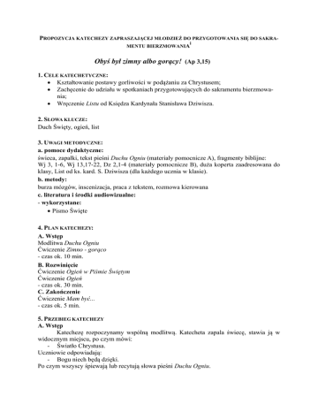 PROPOZYCJA KATECHEZY ZAPRASZAJĄCEJ MŁODZIEŻ DO PRZYGOTOWANIA SIĘ DO SAKRAMENTU BIERZMOWANIA i Obyś był zimny albo gorący! (Ap 3,15) 1. CELE KATECHETYCZNE: Kształtowanie postawy gorliwości w podążaniu za Chrystusem; Zachęcenie do udziału w spotkaniach przygotowujących do sakramentu bierzmowania; Wręczenie Listu od Księdza Kardynała Stanisława Dziwisza. 2. SŁOWA KLUCZE: Duch Święty, ogień, list 3. UWAGI METODYCZNE: a. pomoce dydaktyczne: świeca, zapałki, tekst pieśni Duchu Ogniu (materiały pomocnicze A), fragmenty biblijne: Wj 3, 1-6, Wj 13,17-22, Dz 2,1-4 (materiały pomocnicze B), duża koperta zaadresowana do klasy, List od ks. kard. S. Dziwisza (dla każdego ucznia w klasie). b. metody: burza mózgów, inscenizacja, praca z tekstem, rozmowa kierowana c. literatura i środki audiowizualne: - wykorzystane: Pismo Święte 4. PLAN KATECHEZY: A. Wstęp Modlitwa Duchu Ogniu Ćwiczenie Zimno - gorąco - czas ok. 10 min. B. Rozwinięcie Ćwiczenie Ogień w Piśmie Świętym Ćwiczenie Ogień - czas ok. 30 min. C. Zakończenie Ćwiczenie Mam być... - czas ok. 5 min. 5. PRZEBIEG KATECHEZY A. Wstęp Katechezę rozpoczynamy wspólną modlitwą. Katecheta zapala świecę, stawia ją w widocznym miejscu, po czym mówi: - Światło Chrystusa. Uczniowie odpowiadają: - Bogu niech będą dzięki. Po czym wszyscy śpiewają lub recytują słowa pieśni Duchu Ogniu. Następnie przechodzimy do ćwiczenia Zimno – gorąco. Katecheta wybiera jednego ucznia, który ma za zadanie odnalezienie w sali, ukrytej w czasie przerwy koperty (zaadresowanej do konkretnej klasy, zawierającej listy ks. kard. S. Dziwisza). W czasie gdy uczeń chodzi po klasie i próbuje odnaleźć przedmiot, katecheta udziela mu wskazówek: - zimno (gdy jest daleko od ukrytej koperty) - ciepło (gdy jest w jej pobliżu) - gorąco (gdy jest obok niej). Po wykonaniu zadania kopertę kładziemy obok zapalonej świecy, mówiąc uczniom, że mamy dla nich niespodziankę, ale żeby mogli ją otrzymać muszą wykonać parę zadań. B. Rozwinięcie Ćwiczenie Ogień w Piśmie Świętym, to pierwsze zadanie do wykonania. Składa się ono z dwóch części. W pierwszej części, katecheta dzieli klasę na trzy grupy, każdej wręcza tekst z Pisma Świętego (materiały pomocnicze B). Zadaniem uczniów jest: wymyślenie tytułu do otrzymanego fragmentu, podkreślającego rolę ognia (składającego się maks. z trzech słów); przygotowanie pantomimy ukazującej tekst biblijny. Czas na pracę ok. 5min. Następnie grupy po kolei prezentują scenki. Pozostali uczniowie odgadują o jakie wydarzenia biblijne chodzi. W drugiej części, po zaprezentowaniu scenek przedstawiciele grup, na tablicy zapisują zaproponowane tytuły np.: W słupie ognia Płonący krzew Języki ognia Katecheta zadaje uczniom pytanie: Jakie wspólne słowo łączy wszystkie, trzy scenki? Po zebraniu odpowiedzi, wybieramy tę, w której padnie słowo: ogień. Po czym przechodzimy do drugiego ćwiczenia Ogień. Katecheta obok tytułów zaproponowanych przez uczniów pisze hasło: ogień np. według poniższego przykładu: W słupie ognia Płonący krzew OGIEŃ Języki ognia Po czym prosi, by uczniowie odpowiedzieli na pytanie: Co dobrego daje nam ogień? Odpowiedzi zapisujemy pod hasłem na tablicy np. OGIEŃ: - ciepło (gorąco) - życie - światło Następnie katecheta zadaje kolejne pytanie: W jaki sposób Bóg ukazywał się we fragmentach, które dziś przedstawialiście? Z wypowiedzi uczniów, wybieramy tę, która ukaże Boga, który przychodzi w ogniu. Teraz warto zamienić na tablicy słowa. Zatrzeć hasło ogień i w jego miejsce wpisać hasło: BÓG. Po czym prosimy, by uczniowie odczytali z tablicy odpowiedź na nasze pytanie: Co nam daje Bóg? Np.: BÓG: - ciepło (gorąco) - życie - światło Warto podsumować to ćwiczenie zwracając uwagę, na to, że Bóg, który przychodzi w słupie ognia, pod postacią ognistych języków, ma dla nas konkretne zadanie. Podobnie jak dla Mojżesza, ludu wybranego czy Apostołów. To zadanie ukryte jest w kopercie, którą odnaleźliśmy na początku katechezy. Prowadzący prosi, by uczeń, który brał udział w ćwiczeniu Zimno - gorąco wyszedł na środek, stanął obok świecy. Pozostali uczniowie ustawiają się w kręgu. Katecheta prosi, by uczeń otworzył kopertę a następnie jej zawartość wręczył każdej osobie z klasy, mówiąc jej na ucho słowa „Obyś był zimny albo gorący.” W tym czasie uczniowie nadal stojąc w kręgu śpiewają pieśń Duchu Ogniu. Gdy wszyscy w klasie otrzymają list od ks. kard. S. Dziwisza. Na głos, wszyscy razem, wypowiadają słowa, które kolega przekazał im na ucho. Po czym wszyscy zajmują miejsca w ławkach. C. Zakończenie Ćwiczenie Mam być... stanowi podsumowanie katechezy. Katecheta zapisuje na tablicy temat: „Obyś był zimny albo gorący.” Prosi, by uczniowie dokończyli w zeszytach zdanie: Mam być gorący w drodze do Chrystusa, to znaczy, że............................................... Wybrani uczniowie odczytują swoje prace. Po czym katecheta krótko informuje o spotkaniach do bierzmowania w parafii. Zadanie domowe: Proszę przeczytać uważnie List od ks. kard. S. Dziwisza i napisać na niego odpowiedź. Katechezę kończymy zgaszeniem świecy. Katecheta mówi: - Światło Chrystusa niech pozostanie wśród nas. Uczniowie odpowiadają: - Amen. 6. MATERIAŁY POMOCNICZE: - wykorzystane: A. Pieśń Duchu Ogniu „Duchu Ogniu, Duchu Żarze, Duchu Światło, Duchu Blasku, Duchu Wichrze i Pożarze, ześlij płomień Twojej łaski. Chcesz, rozpalisz i rozognisz, serca wzniesiesz na wysokość: w ciemność rzucisz blask pochodni i rozproszysz grzechu mroki.” B. Fragmenty biblijne: Grupa I „Gdy Mojżesz pasał owce swego teścia, Jetry, kapłana Madianitów, zaprowadził pewnego razu owce w głąb pustyni i przyszedł do góry Bożej Horeb. Wtedy ukazał mu się Anioł Pański w płomieniu ognia, ze środka krzewu. Mojżesz widział, 