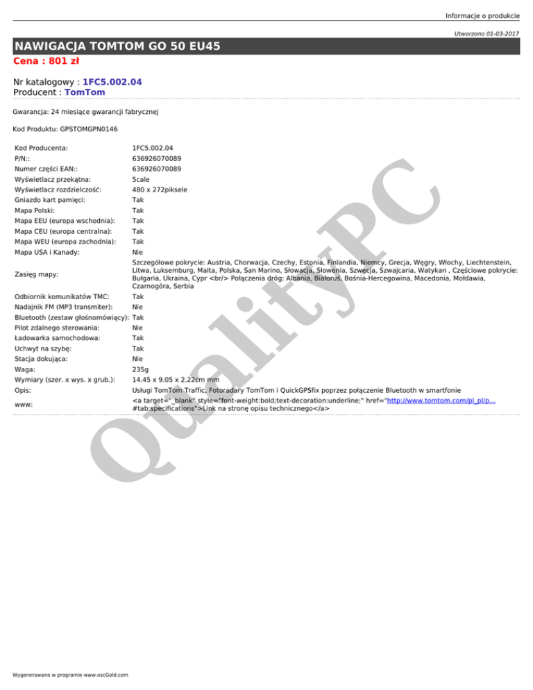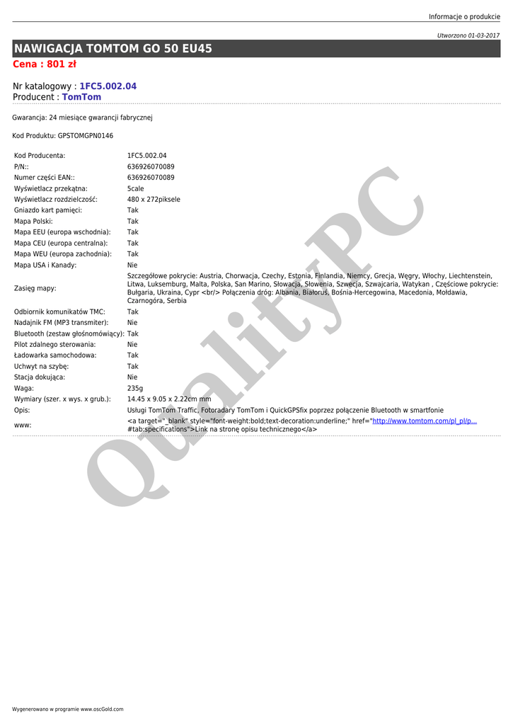 Informacje o produkcie Utworzono 01-03-2017 NAWIGACJA TOMTOM GO 50 EU45 Cena : 801 zł Nr katalogowy : 1FC5.002.04 Producent : TomTom Gwarancja: 24 miesiące gwarancji fabrycznej Kod Produktu: GPSTOMGPN0146 1FC5.002.04 P/N:: 636926070089 Numer części EAN:: 636926070089 Wyświetlacz przekątna: 5cale Wyświetlacz rozdzielczość: 480 x 272piksele Gniazdo kart pamięci: Tak Mapa Polski: Tak Mapa EEU (europa wschodnia): Tak Mapa CEU (europa centralna): Tak Mapa WEU (europa zachodnia): Tak Mapa USA i Kanady: Nie Zasięg mapy: Szczegółowe pokrycie: Austria, Chorwacja, Czechy, Estonia, Finlandia, Niemcy, Grecja, Węgry, Włochy, Liechtenstein, Litwa, Luksemburg, Malta, Polska, San Marino, Słowacja, Słowenia, Szwecja, Szwajcaria, Watykan , Częściowe pokrycie: Bułgaria, Ukraina, Cypr <br/> Połączenia dróg: Albania, Białoruś, Bośnia-Hercegowina, Macedonia, Mołdawia, Czarnogóra, Serbia Odbiornik komunikatów TMC: Tak Nadajnik FM (MP3 transmiter): Nie ua lit yP C Kod Producenta: Bluetooth (zestaw głośnomówiący): Tak Pilot zdalnego sterowania: Nie Ładowarka samochodowa: Tak Uchwyt na szybę: Tak Stacja dokująca: Waga: Nie 235g Wymiary (szer. x wys. x grub.): 14.45 x 9.05 x 2.22cm mm Opis: Usługi TomTom Traffic, Fotoradary TomTom i QuickGPSfix poprzez połączenie Bluetooth w smartfonie <a target="_blank" style="font-weight:bold;text-decoration:underline;" href="http://www.tomtom.com/pl_pl/p... #tab:specifications">Link na stronę opisu technicznego</a> Q www: Wygenerowano w programie www.oscGold.com