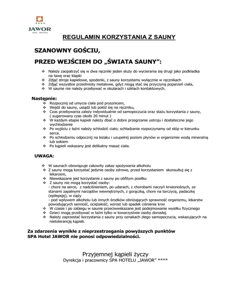 REGULAMIN KORZYSTANIA Z SAUNY SZANOWNY GOŚCIU, PRZED WEJŚCIEM DO „ŚWIATA SAUNY”: Należy zaopatrzyć się w dwa ręczniki jeden służy do wycierania się drugi jako podkładka na ławę oraz klapki Zdjąć stroje kapielowe, spodenki, z sauny korzystamy wyłącznie w ręcznikach Zdjąć wszystkie przedmioty metalowe, gdyż mogą stać się przyczyną poparzeń ciała, W saunie nie należy przebywać w okularach i szkłach kontaktowych. Następnie: Rozpocznij od umycia ciała pod prysznicem, Wejdź do sauny, usiądź lub połóż się na ręczniku, Czas przebywania zależy indywidualnie od samopoczucia oraz stażu korzystania z sauny, ( sugerowany czas około 20 minut ) W każdym etapie kapieli należy dbać o dobre przegrzanie ustroju i dostateczne jego wychłodzenie Po wyjściu z łaźni należy schłodzić ciało; schładzanie rozpoczynamy od stóp w kierunku serca. Po schłodzeniu odpocznij na leżaku i uzupełnij poziom płynów w organizmie wodą mineralną lub sokiem Po kąpieli wskazany jest delikatny masaż ciała. UWAGA: W saunach obowiązuje cakowity zakaz spożywania alkoholu Z sauny mogą korzystać jedynie osoby zdrowe, przed korzystaniem skonsultuj się z lekarzem, Niewskazane jest korzystanie z sauny po obfitym posiłku Z sauny nie mogą korzystać osoby: - chore na serce, z nadciśnieniem, po udarach, z chorobami naczyń krwionośnych, ze stanami zapalnymi narządów wewnętrznych, z gorączką, chore na tarczycę, padaczkę (epilepsję), w ciąży - pod wpływem alkoholu lub innych środków obniżających sprawność organizmu, lekarstw powodujących senność, ociężałość, wzrost lub spadek ciśnienia krwi W czasie i po zabiegu w saunie przeciwwskazane jest podejmowanie wysiłku fizycznego, Dzieci mogą przebywać w łaźni tylko w towarzystwie osoby dorosłej. Należy zaprzestać korzystania z sauny przy oznakach złego samopoczucia, wskazujących na nietolerancję kąpieli. Za zdarzenia wynikłe z nieprzestrzegania powyższych punktów SPA Hotel JAWOR nie ponosi odpowiedzialności. Przyjemnej kąpieli życzy Dyrekcja i pracownicy SPA HOTELU „JAWOR” ****