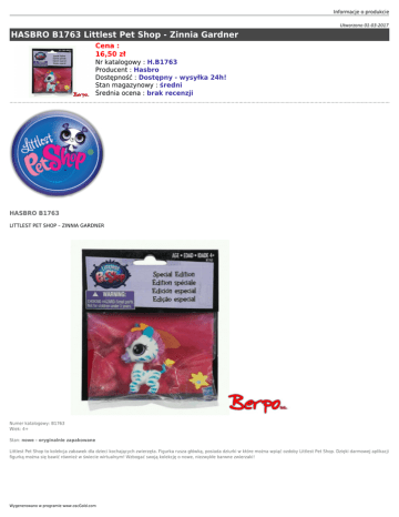 Informacje o produkcie Utworzono 01-03-2017 HASBRO B1763 Littlest Pet Shop - Zinnia Gardner Cena : 16,50 zł Nr katalogowy : H.B1763 Producent : Hasbro Dostępność : Dostępny - wysyłka 24h! Stan magazynowy : średni Średnia ocena : brak recenzji HASBRO B1763 LITTLEST PET SHOP – ZINNIA GARDNER Numer katalogowy: B1763 Wiek: 4+ Stan: nowe - oryginalnie zapakowane Littlest Pet Shop to kolekcja zabawek dla dzieci kochających zwierzęta. Figurka rusza główką, posiada dziurki w które można wpiąć ozdoby Littlest Pet Shop. Dzięki darmowej aplikacji figurką można się bawić również w świecie wirtualnym! Wzbogać swoją kolekcję o nowe, niezwykłe barwne zwierzaki! Wygenerowano w programie www.oscGold.com Dostępność w salonach: Ilość: Sklep - Złotniki: 6 Sklep - zlikwidowany: 0 Sklep - Szczepankowo: 1 Dostępne opcje HASBRO B1763 Littlest Pet Shop - Zinnia Gardner » Wiek: 3 - 4 lat, 5 - 7 lat.