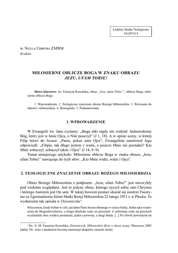Łódzkie Studia Teologiczne 24 (2015) 4 m. Nulla Chmura ZMBM Kraków MIŁOSIERNE OBLICZE BOGA W ZNAKU OBRAZU JEZU, UFAM TOBIE! Słowa kluczowe: św. Faustyna Kowalska, obraz „Jezu, ufam Tobie!”, oblicze Boga, miłosierne oblicze Boga 1. Wprowadzenie. 2. Teologiczne znaczenie obrazu Bożego Miłosierdzia. 3. Wezwanie do ufności i miłosierdzia. 4. Ikonografia. 5. Podsumowanie 1. WPROWADZENIE W Ewangelii św. Jana czytamy: „Boga nikt nigdy nie widział. Jednorodzony Bóg, który jest w łonie Ojca, o Nim pouczył” (J 1, 18). A w opisie sceny, w której Filip mówi do Jezusa: „Panie, pokaż nam Ojca”, Ewangelista zanotował Jego odpowiedź: „Filipie, tak długo jestem z wami, a jeszcze Mnie nie poznałeś? Kto Mnie zobaczył, zobaczył także i Ojca” (J 14, 8–9). Temat niniejszego artykułu: Miłosierne oblicze Boga w znaku obrazu „Jezu, ufam Tobie!” nawiązuje do tych słów: „Kto Mnie widzi, widzi i Ojca”. 2. TEOLOGICZNE ZNACZENIE OBRAZU BOŻEGO MIŁOSIERDZIA Obraz Bożego Miłosierdzia z podpisem: „Jezu, ufam Tobie!” jest niezwykły pod wieloma względami. Jest to jedyny obraz, którego życzył sobie sam Chrystus i którego Autorem jest On sam. W takiej bowiem postaci ukazał się siostrze Faustynie ze Zgromadzenia Sióstr Matki Bożej Miłosierdzia 22 lutego 1931 r. w Płocku. To wydarzenie tak opisała w Dzienniczku1: Wieczorem, kiedy byłam w celi, ujrzałam Pana Jezusa ubranego w szacie białej. Jedna ręka wzniesiona do błogosławieństwa, a druga dotykała szaty na piersiach. Z uchylenia szaty na piersiach wychodziły dwa wielkie promienie, jeden czerwony, a drugi blady. [...] Po chwili powiedział mi 1 Św. S. M. Faustyna Kowalska, Dzienniczek. Miłosierdzie Boże w duszy mojej, Warszawa 2005 [dalej: Dz. wraz z podaniem bocznej numeracji akapitów zamiast stron]. NULLA CHMURA 28 [2] Jezus: Wymaluj obraz według rysunku, który widzisz, z podpisem: Jezu, ufam Tobie. Pragnę, aby ten obraz czczono najpierw w kaplicy waszej i na całym świecie (Dz. 47). W Katechizmie Kościoła Katolickiego znajdujemy uzasadnienie malowania wizerunków Syna Bożego. Pod numerem 476 i 1159 czytamy: Ponieważ Słowo stało się ciałem, przyjmując prawdziwe człowieczeństwo, przyjęło także jego ograniczenia. Na tej podstawie ludzkie oblicze Jezusa może być przedstawiane (KKK 476). [...] Wcielenie Syna Bożego zapoczątkowało ową „ekonomię” obrazów: [...] mogę przedstawić na obrazie to, co zobaczyłem z Boga. Z odsłoniętym obliczem kontemplujemy chwałę Pana (KKK 1159). Dalej Katechizm uczy: Ikonografia chrześcijańska za pośrednictwem obrazu wyraża orędzie ewangeliczne, które Pismo Święte opisuje za pośrednictwem słów. Obraz i słowo wyjaśniają się wzajemnie (KKK 1160). [...] „Piękno i kolor obrazów pobudzają modlitwę. Jest to święto dla [...] oczu, podobnie jak widok natury pobudza [...] serce do oddawania chwały Bogu” (KKK 1162). Patrząc na wizerunek Chrystusa Miłosiernego, można dostrzec całą ekonomię zbawienia, opisaną w „Piśmie Świętym za pośrednictwem słów”, dlatego bywa nazywany obrazem Bożego miłosierdzia, czyli obrazem, który ukazuje miłosierne oblicze Boga bogatego w miłosierdzie (por. Ef 2, 4). Piękno i kolor obrazu pobudzają do modlitwy. Jest to święto dla oczu człowieka modlącego się przed tym wizerunkiem, podobnie jak widok natury pobudza serce do oddawania chwały Bogu (por. KKK nr 1162). Obraz Bożego miłosierdzia jest syntezą, a zarazem symbolem całego orędzia o Bożym miłosierdziu, które Bóg przekazał przez siostrę Faustynę2. Wyraża ewangeliczne orędzie o miłosiernej miłości Boga do człowieka, opisane w Piśmie Świętym za pośrednictwem słów. Patrząc na wizerunek Chrystusa miłosiernego, można zauważyć, że przedstawia on Wcielone Słowo Boga, które przyjęło ludzkie ciało wraz z jego „ograniczeniami”. Jezus jest w białej szacie, po zmartwychwstaniu, uwielbiony, tryumfujący nad grzechem i śmiercią, wychodzący naprzeciw człowiekowi, któremu błogosławi i którego obdarza pokojem i rozgrzesza za cenę męki i śmierci krzyżowej, o czym mówią zaznaczone na rękach i stopach ślady męki oraz tryskające z przebitego włócznią Serca strumienie krwi i wody. Lewą ręką Jezus dotyka szaty na piersiach, wskazując na promienie, których znaczenie tak wyjaśnił św. siostrze Faustynie: „Te dwa promienie oznaczają krew i wodę. Blady promień oznacza wodę, która usprawiedliwia dusze; czerwony promień oznacza krew, która jest życiem dusz”. Zatem promienie te symbolizują sakramenty święte, Kościół święty zrodzony z przebitego boku Chrystusa i dary Ducha Świętego, którego biblijnym symbolem jest woda, który „został nam dany na skutek Chrystusowej śmierci”3. Jezus dodał następujące słowa: „Szczęśliwy, kto w ich cieniu żyć będzie, bo nie dosięgnie go sprawiedliwa ręka Boga” (Dz. 299). Por. I. Różycki, Nabożeństwo do Miłosierdzia Bożego, Kraków 2010, 103nn. Por. tamże, 24nn. Por. I. Różycki, Miłosierdzie Boże. Zasadnicze rysy nabożeństwa do Miłosierdzia Bożego, Kraków 1982, 20. 2 3 [3] MIŁOSIERNE OBLICZE BOGA W ZNAKU OBRAZU JEZU, UFAM TOBIE! 29 Kontemplując wizerunek miłosiernego Chrystusa, nietrudno dostrzec miłosierne oblicze Boga Ojca, który posyła na świat Jednorodzonego Syna i wydaje go za nas, abyśmy życie mieli i mieli je w obfitości (por. J 4, 9; 10, 10)4. Miłość Boga do człowieka najpełniej została objawiona w Osobie Jezusa, w Jego życiu, czynach i nauczaniu, a szczególnie w Jego męce, śmierci i zmartwychwstaniu5. Ignacy Różycki zauważa, że obraz Chrystusa miłosiernego ukazuje miłosierdzie całej Trójcy Świętej, dlatego nazywany jest obrazem miłosierdzia Bożego lub obrazem Jezusa Miłosiernego, gdyż On najpełniej tę tajemnicę objawił człowiekowi. 3. WEZWANIE DO UFNOŚCI I MIŁOSIERDZIA Istotnym elementem obrazu jest podpis zawierający słowa: 