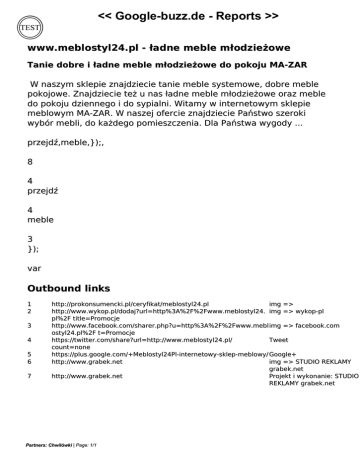 << Google-buzz.de - Reports >> www.meblostyl24.pl - ładne meble młodzieżowe Tanie dobre i ładne meble młodzieżowe do pokoju MA-ZAR W naszym sklepie znajdziecie tanie meble systemowe, dobre meble pokojowe. Znajdziecie też u nas ładne meble młodzieżowe oraz meble do pokoju dziennego i do sypialni. Witamy w internetowym sklepie meblowym MA-ZAR. W naszej ofercie znajdziecie Państwo szeroki wybór mebli, do każdego pomieszczenia. Dla Państwa wygody ... przejdź,meble,});, 8 4 przejdź 4 meble 3 }); var Outbound links 1 2 3 4 5 6 7 http://prokonsumencki.pl/ceryfikat/meblostyl24.pl img => http://www.wykop.pl/dodaj?url=http%3A%2F%2Fwww.meblostyl24. img => wykop-pl pl%2F title=Promocje http://www.facebook.com/sharer.php?u=http%3A%2F%2Fwww.mebl img => facebook.com ostyl24.pl%2F t=Promocje https://twitter.com/share?url=http://www.meblostyl24.pl/ Tweet count=none https://plus.google.com/+Meblostyl24Pl-internetowy-sklep-meblowy/ Google+ http://www.grabek.net img => STUDIO REKLAMY grabek.net http://www.grabek.net Projekt i wykonanie: STUDIO REKLAMY grabek.net Partners: Chwilówki | Page: 1/1 Powered by TCPDF (www.tcpdf.org) Powered by TCPDF (www.tcpdf.org)