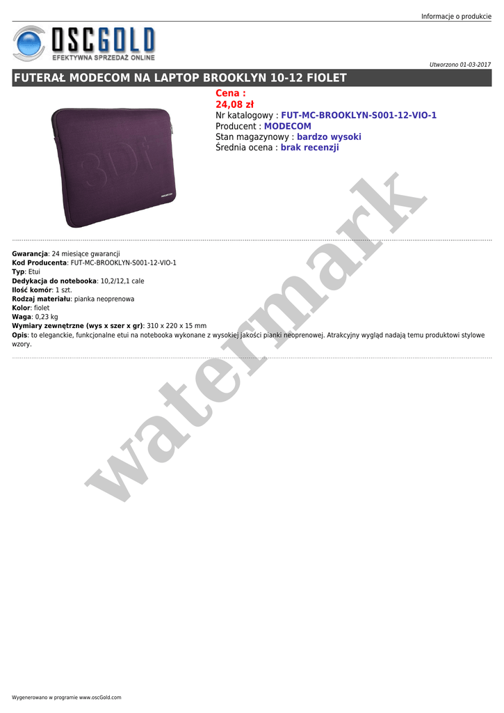 Informacje o produkcie Utworzono 01-03-2017 FUTERAŁ MODECOM NA LAPTOP BROOKLYN 10-12 FIOLET Cena : 24,08 zł er m ar k Nr katalogowy : FUT-MC-BROOKLYN-S001-12-VIO-1 Producent : MODECOM Stan magazynowy : bardzo wysoki Średnia ocena : brak recenzji w at Gwarancja: 24 miesiące gwarancji Kod Producenta: FUT-MC-BROOKLYN-S001-12-VIO-1 Typ: Etui Dedykacja do notebooka: 10,2/12,1 cale Ilość komór: 1 szt. Rodzaj materiału: pianka neoprenowa Kolor: fiolet Waga: 0,23 kg Wymiary zewnętrzne (wys x szer x gr): 310 x 220 x 15 mm Opis: to eleganckie, funkcjonalne etui na notebooka wykonane z wysokiej jakości pianki neoprenowej. Atrakcyjny wygląd nadają temu produktowi stylowe wzory. Wygenerowano w programie www.oscGold.com