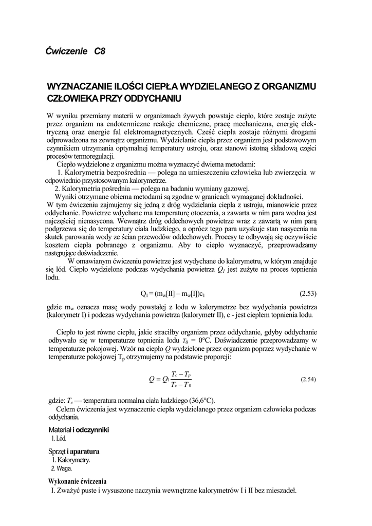 wiczenie C8 WYZNACZANIE ILO CI CIEP A WYDZIELANEGO Z ORGANIZMU CZ OWIEKA PRZY ODDYCHANIU W wyniku przemiany materii w organizmach ywych powstaje ciep o, które zostaje zu yte przez organizm na endotermiczne reakcje chemiczne, prac mechaniczna, energi elektryczn oraz energie fal elektromagnetycznych. Cze"# ciep a zostaje ró nymi drogami odprowadzona na zewn trz organizmu. Wydzielanie ciep a przez organizm jest podstawowym czynnikiem utrzymania optymalnej temperatury ustroju, oraz stanowi istotn sk adow cz "ci procesów termoregulacji. Ciep o wydzielone z organizmu mo na wyznaczy# dwiema metodami: 1. Kalorymetria bezpo"rednia — polega na umieszczeniu cz owieka lub zwierz cia w odpowiednio przystosowanym kalorymetrze. 2. Kalorymetria po"rednia — polega na badaniu wymiany gazowej. Wyniki otrzymane obiema metodami s zgodne w granicach wymaganej dok adno"ci. W tym #wiczeniu zajmujemy si jedn z dróg wydzielania ciep a z ustroju, mianowicie przez oddychanie. Powietrze wdychane ma temperatur otoczenia, a zawarta w nim para wodna jest najcz "ciej nienasycona. Wewn trz dróg oddechowych powietrze wraz z zawart w nim par podgrzewa si do temperatury cia a ludzkiego, a oprócz tego para uzyskuje stan nasycenia na skutek parowania wody ze "cian przewodów oddechowych. Procesy te odbywaj si oczywi"cie kosztem ciep a pobranego z organizmu. Aby to ciep o wyznaczy#, przeprowadzamy nast puj ce do"wiadczenie. W omawianym #wiczeniu powietrze jest wydychane do kalorymetru, w którym znajduje si lód. Ciep o wydzielone podczas wydychania powietrza Q1 jest zu yte na proces topnienia lodu. Q1 = (mw[II] – mw[I])c1 (2.53) gdzie mw oznacza mas wody powsta ej z lodu w kalorymetrze bez wydychania powietrza (kalorymetr I) i podczas wydychania powietrza (kalorymetr II), c - jest ciep em topnienia lodu. Ciep o to jest równe ciep u, jakie straci by organizm przez oddychanie, gdyby oddychanie odbywa o si w temperaturze topnienia lodu T0 = 0°C. Do"wiadczenie przeprowadzamy w temperaturze pokojowej. Wzór na ciep o Q wydzielone przez organizm poprzez wydychanie w temperaturze pokojowej Tp otrzymujemy na podstawie proporcji: Q = Q1 Tc Tp Tc T 0 (2.54) gdzie: Tc — temperatura normalna cia a ludzkiego (36,6°C). Celem #wiczenia jest wyznaczenie ciep a wydzielanego przez organizm cz owieka podczas oddychania. Materia i odczynniki 1. Lód. Sprz t i aparatura 1. Kalorymetry. 2. Waga. Wykonanie wiczenia I. Zwa y# puste i wysuszone naczynia wewn trzne kalorymetrów I i II bez mieszade . 2. Do uformowanego pojemnika z siatki metalowej w o y# dwa kawa ki lodu (o temp. 0oC) i umie"ci# go w naczyniu wewn trznym kalorymetru I. Ca o"# umie"ci# w os onie i szczelnie zamkn # pokryw . Kalorymetr pozostawi# na 20 minut. 3. Po up ywie 20 minut szybko wyj # wewn trzny pojemnik z siatki zawieraj cy lód, otrz sn # lód z nadmiaru wody do naczynia wewn trznego kalorymetru i umie"ci# pojemnik w wewn trznym naczyniu kalorymetru II. Przez 20 minut wydycha# powietrze do kalorymetru II przez ustnik. Nale y pami ta#, aby oddech by jak najbardziej zbli ony do normalnego, oraz aby ca e powietrze by o wt oczone do kalorymetru. Po sko@czeniu wydychania natychmiast otworzy# kalorymetr i wyj c z niego pojemnik wraz z pozosta o"ci lodu po uprzednim otrz "ni ciu z wody. 4. Zwa y# naczynie wewn trzne kalorymetru I z wod i odejmuj c mas pustego naczynia,. obliczy# mas wody powsta ej ze stopienia lodu pod wp ywem ciep a zawartego w kalorymetrze oraz dop ywaj cego z zewn trz. 5. Zwa y# naczynie wewn trzne kalorymetru II wraz z wod i odejmuj c mas pustego naczynia, obliczy# mas wody powsta ej podczas wydychania powietrza i skraplania si pary wodnej. Wyniki umie"ci# w tabeli: I mk I mkw I mw II mk II mkw II mw mwo T0 Tc 5g 0oC 36,6oC Tp ct Q1 335kJ kg-1 gdzie: mk[I] - masa pustego kalorymetru I, mkw[I] - masa kalorymetru I z wod , mw[I] - masa wody powsta ej w kalorymetrze I. mk[II] - masa pustego kalorymetru II, mkw[II] - masa kalorymetru II z wod , mw[II] - masa wody powsta ej w kalorymetrze II, mwp - masa wody powsta ej na skutek skroplenia si pary wodnej zawartej w wydychanym powietrzu. Ca kowite ciep o Q1 stracone przez wydychanie powietrza przy och odzeniu si do temperatury T = 0°C obliczy# ze wzoru: Q1 = (mw[II] - mw[I] – mwp)ct 6. Obliczy# ciep o wydychania Q, uwzgl dniaj c poprawk wed ug wzoru (2.54). 7. Przeprowadzi# rachunek b dów. (2.55). Wymagania - poj cie ciep a i temperatury z punktu widzenia kinetyczno-molekularnej teorii budowy substancji [2, 6 ] definicja ciep a w a"ciwego i ciep a topnienia oraz jednostki tych wielko"ci zale no"# temperatury topnienia od ci"nienia