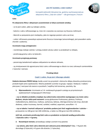 JAK ŻYĆ SŁODKO, A BEZ CUKRU? - konspekt jednostki lekcyjnej (np. godziny wychowawczej) po obejrzeniu filmu „Cały ten cukier” – dla gimnazjum / liceum Cele: Po obejrzeniu filmu i aktywnym uczestnictwie w lekcji uczniowie wiedzą: - co to jest cukier, jakie są rodzaje cukrów, - kalorie z cukru rafinowanego są inne niż z owoców czy warzyw czy tłuszczy roślinnych, - błonnik w pożywieniu jest niezbędny, jako że reguluje poziom cukru we krwi, - cukier rafinowany powoduje wytwarzanie tłuszczu trzewnego (wisceralnego), jest powodem wielu chorób i uzależnia; Uczniowie mają umiejętności: - rozróżniają rodzaje cukrów i umieją znaleźć ukryty cukier w produktach w sklepie, - przeliczają gramy cukru na łyżeczki ; Uczniowie przyjmują postawę: - poszerzają świadomość wpływu odżywiania na własne zdrowie, - są zmotywowani do ograniczana ilości cukru rafinowanego w diecie na rzecz zdrowych zamienników / owoców i warzyw. Przebieg lekcji: Część I: cukier, ile go jest i dlaczego szkodzi: Zadanie domowe PRZED lekcją: każdy uczeń ma przynieść z domu/ze sklepu dowolny przetworzony produkt bądź samo opakowanie. Można podzielić uczniów na grupy: napoje / słodycze / nabiał / pieczywo / warzywa lub owoce w puszkach / wędliny lub konserwy, pasztety, itp. 1. Wprowadzenie: Uczniowie w 2-4- osobowych grupach szukają na przyniesionych opakowaniach następujących informacji: - czy w składzie produktu znajduje się cukier/cukry naturalnie występujące czy może cukry dodane, ukryte także pod nazwami: syrop glukozowo-fruktozowy, glukoza, fruktoza, maltodekstryna, dekstroza, maltoza, sacharoza, laktoza, słód (jęczmienny lub inny), ekstrakt słodowy, cukier trzcinowy, karmel, sorbitol, maltitol, aspartam, acesulfam – K. - czy w tabelce ‘wartość odżywcza’ produktu podana jest ilość węglowodanów i cukrów – przeważnie na 100 gram lub 100 mililitrów, a także na 250 gram lub 250 mililitrów. Jeśli tak, uczniowie przeliczają ilość cukru w produkcie na łyżeczki według przelicznika: 1 łyżeczka cukru = 4 gramy. 2. Rozwinięcie tematu: prowadzący zadaje uczniom trzy pytania: - czy wiecie, jaka ilość cukru dziennie jest zalecana przez dietetyków? Odp.: 7-8 gram dla dorosłego (2 łyżeczki), 4-5 gram dla dziecka ( 1 łyżeczka); - czy wiecie, ile łyżeczek cukru Wy sami spożywacie codziennie? Spróbujcie policzyć na podstawie przyniesionych produktów: sok, jogurt, chleb, serek, wędlina, pomidor z puszki (lub keczup), itp… - czy wiecie, ile łyżeczek cukru codziennie spożywa przeciętny Polak? Odp. ok. 30 łyżeczek (czyli ok. 40-45 kg cukru rocznie) – czy to więcej czy mniej od przeciętnego Amerykanina i Australijczyka pokazanego w filmie? Odp. Mniej, ale niewiele mniej… 3. Rodzina cukrów – ćwiczenie. Prowadzący wyświetla uczniom poniższy tekst lub wypisuje na tablicy lub rozdaje kserokopie, wraz z poleceniem: Wstaw w odpowiednie miejsca odpowiednie rodzaje cukrów (jeśli trzeba, zmień ich formę gramatyczną): fruktoza x 2, laktoza, sacharoza x 3, glukoza x 3: „Kiedy coś zjemy, powtarza się pewien schemat. Organizm wyłapuje z pokarmów ……………., którą wykorzystuje jako paliwo. Pieczywo, makarony, warzywa i produkty zbożowe są źródłem energii dla naszego mózgu. Nie tylko dla mózgu - także dla komórek i narządów. Nie ma ………………, nie ma nas. Kolej na ………………………... Jest pierwszym cukrem, z którym mają styczność ssaki, ponieważ zawiera ją mleko. Tym samym występuje w nabiale: serach, mleku, jogurtach. Jeśli jej nie tolerujesz, lepiej nie oddalaj się od łazienki. A teraz ……………………………... To o nią tyle szumu. Jedni twierdzą, że na pewno jest szkodliwa, inni wciąż mają wątpliwości. ………………………… to cukier stołowy – ten, którym słodzimy kawę czy herbatę. To pupilka cukrowej familii. Albo i nie. Na …………………………. składają się dwa cukry proste. W 50% to …………………, głowa rodziny, a w 50% – …………………... Fruktoza to cukrowy odszczepieniec. W przeszłości była dla człowieka trudno dostępna. Mógł ją dostarczyć organizmowi tylko z owoców, warzyw oraz trudnego do zdobycia miodu. Za to dziś jest wszędzie, niemal w każdym pokarmie! I nie ma możliwości, żeby umknęła twojej uwadze, bo to właśnie ona nadaje jedzeniu słodki smak. Stan zdrowia ludzi na całym świecie pogarsza się z dnia na dzień. Wielu naukowców uważa, że …………………. ma w tym swój udział.” Tekst pochodzi z filmu „Cały ten cukier”. Oto prawidłowe odpowiedzi: „Kiedy coś zjemy, powtarza się pewien schemat. Organizm wyłapuje z pokarmów glukozę, którą wykorzystuje jako paliwo. Pieczywo, makarony, warzywa i produkty zbożowe są źródłem energii dla naszego mózgu. Nie tylko dla mózgu - także dla komórek i narządów. Nie ma glukozy, nie ma nas. Kolej na laktozę. Jest pierwszym cukrem, z którym mają styczność ssaki, ponieważ zawiera ją mleko. Tym samym występuje w nabiale: serach, mleku, jogurtach. Jeśli jej nie tolerujesz, lepiej nie oddalaj się od łazienki. A teraz sacharoza. To o nią tyle szumu. Jedni twierdzą, że na pewno jest szkodliwa, inni wciąż mają wątpliwości. Sacharoza to cukier stołowy – ten, którym słodzimy kawę czy herbatę. To pupilka cukrowej familii. Albo i nie. Na sacharozę składają się dwa cukry proste. W 50% to glukoza, głowa rodziny, a w 50% – fruktoza. Fruktoza to cukrowy odszczepieniec. W przeszłości była dla człowieka trudno dostępna. Mógł ją dostarczyć organizmowi tylko z owoców, warzyw oraz trudnego do zdobycia miodu. Za to dziś jest wszędzie, niemal w każdym pokarmie! I nie ma możliwości, żeby umknęła twojej uwadze, bo to właśnie ona nadaje jedzeniu słodki smak. Stan zdrowia ludzi na całym świecie pogarsza się z dnia na dzień. Wielu naukowców uważa, że fruktoza ma w 