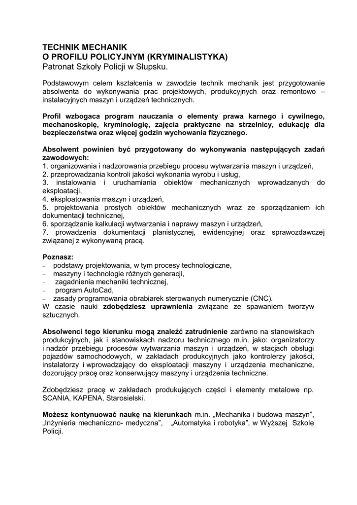 TECHNIK MECHANIK O PROFILU POLICYJNYM (KRYMINALISTYKA) Patronat Szkoły Policji w Słupsku. Podstawowym celem kształcenia w zawodzie technik mechanik jest przygotowanie absolwenta do wykonywania prac projektowych, produkcyjnych oraz remontowo – instalacyjnych maszyn i urządzeń technicznych. Profil wzbogaca program nauczania o elementy prawa karnego i cywilnego, mechanoskopię, kryminologię, zajęcia praktyczne na strzelnicy, edukację dla bezpieczeństwa oraz więcej godzin wychowania fizycznego. Absolwent powinien być przygotowany do wykonywania następujących zadań zawodowych: 1. organizowania i nadzorowania przebiegu procesu wytwarzania maszyn i urządzeń, 2. przeprowadzania kontroli jakości wykonania wyrobu i usług, 3. instalowania i uruchamiania obiektów mechanicznych wprowadzanych do eksploatacji, 4. eksploatowania maszyn i urządzeń, 5. projektowania prostych obiektów mechanicznych wraz ze sporządzaniem ich dokumentacji technicznej, 6. sporządzanie kalkulacji wytwarzania i naprawy maszyn i urządzeń, 7. prowadzenia dokumentacji planistycznej, ewidencyjnej oraz sprawozdawczej związanej z wykonywaną pracą. Poznasz: podstawy projektowania, w tym procesy technologiczne, maszyny i technologie różnych generacji, zagadnienia mechaniki technicznej, program AutoCad, zasady programowania obrabiarek sterowanych numerycznie (CNC). W czasie nauki zdobędziesz uprawnienia związane ze spawaniem tworzyw sztucznych. Absolwenci tego kierunku mogą znaleźć zatrudnienie zarówno na stanowiskach produkcyjnych, jak i stanowiskach nadzoru technicznego m.in. jako: organizatorzy i nadzór przebiegu procesów wytwarzania maszyn i urządzeń, w stacjach obsługi pojazdów samochodowych, w zakładach produkcyjnych jako kontrolerzy jakości, instalatorzy i wprowadzający do eksploatacji maszyny i urządzenia mechaniczne, dozorujący pracę oraz konserwujący maszyny i urządzenia techniczne. Zdobędziesz pracę w zakładach produkujących części i elementy metalowe np. SCANIA, KAPENA, Starosielski. Możesz kontynuować naukę na kierunkach m.in. „Mechanika i budowa maszyn”, „Inżynieria mechaniczno- medyczna”, „Automatyka i robotyka”, w Wyższej Szkole Policji.
