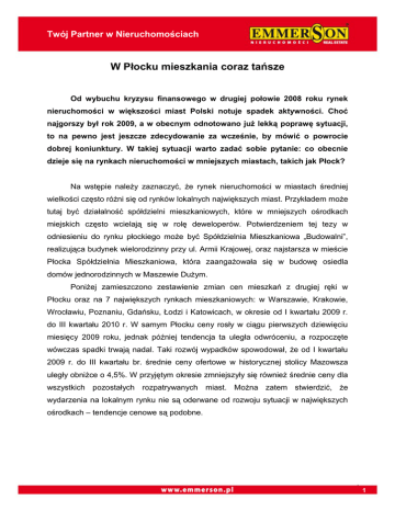 Twój Partner w Nieruchomościach W Płocku mieszkania coraz tańsze Od wybuchu kryzysu finansowego w drugiej połowie 2008 roku rynek nieruchomości w większości miast Polski notuje spadek aktywności. Choć najgorszy był rok 2009, a w obecnym odnotowano już lekką poprawę sytuacji, to na pewno jest jeszcze zdecydowanie za wcześnie, by mówić o powrocie dobrej koniunktury. W takiej sytuacji warto zadać sobie pytanie: co obecnie dzieje się na rynkach nieruchomości w mniejszych miastach, takich jak Płock? Na wstępie należy zaznaczyć, że rynek nieruchomości w miastach średniej wielkości często różni się od rynków lokalnych największych miast. Przykładem może tutaj być działalność spółdzielni mieszkaniowych, które w mniejszych ośrodkach miejskich często wcielają się w rolę deweloperów. Potwierdzeniem tej tezy w odniesieniu do rynku płockiego może być Spółdzielnia Mieszkaniowa „Budowalni”, realizująca budynek wielorodzinny przy ul. Armii Krajowej, oraz najstarsza w mieście Płocka Spółdzielnia Mieszkaniowa, która zaangażowała się w budowę osiedla domów jednorodzinnych w Maszewie Dużym. Poniżej zamieszczono zestawienie zmian cen mieszkań z drugiej ręki w Płocku oraz na 7 największych rynkach mieszkaniowych: w Warszawie, Krakowie, Wrocławiu, Poznaniu, Gdańsku, Łodzi i Katowicach, w okresie od I kwartału 2009 r. do III kwartału 2010 r. W samym Płocku ceny rosły w ciągu pierwszych dziewięciu miesięcy 2009 roku, jednak później tendencja ta uległa odwróceniu, a rozpoczęte wówczas spadki trwają nadal. Taki rozwój wypadków spowodował, że od I kwartału 2009 r. do III kwartału br. średnie ceny ofertowe w historycznej stolicy Mazowsza uległy obniżce o 4,5%. W przyjętym okresie zmniejszyły się również średnie ceny dla wszystkich pozostałych rozpatrywanych miast. Można zatem stwierdzić, że wydarzenia na lokalnym rynku nie są oderwane od rozwoju sytuacji w największych ośrodkach – tendencje cenowe są podobne. 1 Twój Partner w Nieruchomościach Porównanie cen ofertowych mieszkań w największych rynkach mieszkaniowych Polski i Płocku, III kwartał 2010r. I kw. 2009 Warszawa 9 249 Kraków 8 692 Wrocław 7 445 Poznań 7 429 Gdańsk 6 889 Łódź 5 851 Katowice 6 033 Płock 4 058 II kw. 2009 III kw. 2009 9 450 9 422 8 194 8 038 7 121 7 037 7 198 7 512 6 426 6 280 5 918 5 977 5 457 5 501 4 289 4 321 IV kw. 2009 9 473 7 870 7 507 7 472 6 434 5 926 5 228 4 229 I kw. 2010 9 147 7 803 7 328 7 201 6 678 5 635 5 277 4 040 II kw. 2010 III kw. 2010 9 002 9 056 7 672 7 598 7 248 7 222 6 978 6 886 6 653 6 649 5 597 5 495 5 373 5 217 3 895 3 875 Źródło: Dział Badań i Analiz Emmerson S.A. Na wykresie poniżej przedstawiono średnie ceny ofertowe mieszkań w Płocku na tle mniejszych miast wojewódzkich. Bezwzględna średnia cena dla wszystkich 10 miast w III kwartale obecnego roku znajdowała się na poziomie 4 607 zł/mkw., w tym samym czasie w Płocku było to 3 875 zł/mkw. W tym miejscu należy zaznaczyć, że poziom cen w Płocku, biorąc pod uwagę liczbę ludności miasta, nie jest wcale niski, niższe ceny zanotowano choćby w zbliżonej wielkością Zielonej Górze. Porównanie cen ofertowych mieszkań w Płocku oraz mniejszych miastach wojewódzkich, III kwartał 2010 r. (zł/mkw.) Źródło: Dział Badań i Analiz Emmerson S.A. 2 Twój Partner w Nieruchomościach W ostatnim kwartale średnia liczby pokoi w mieszkaniach oferowanych na rynku wtórnym w Płocku wyniosła 2,15; natomiast w okresie od stycznia do sierpnia wartość ta kształtowała się na poziomie 2,63. Obniżyła się również średnia powierzchnia dostępnych na rynku mieszkań, która od lipca do września wyniosła niecałe 51 mkw. Fakt ten można uzasadnić mniejszą skłonnością do zadłużania się. Wraz ze spowolnieniem gospodarczym, z którym mieliśmy ostatnio do czynienia, oraz wynikającą z niego niepewnością na rynku pracy, spadała przeciętna wartość mieszkań będących przedmiotem transakcji. Potencjalni kupujący biorą pod uwagę nie do końca pewną sytuację gospodarczą oraz uwzględniaja w procesie podejmowania decyzji o zakupie nieruchomości możliwość obniżenia swoich dochodów. Stąd właśnie najczęściej wybierają mieszkania mniejsze, o niższej cenie i takim też standardzie. Zgodnie z takim rozwojem wypadków obecnie na rynku nieruchomości mieszkaniowych w największych miastach można zauważyć wzrost zainteresowania lokalami 1-pokojowymi. Podobnie wygląda sytuacja w Płocku. W porównaniu do wcześniejszego kwartału podwojeniu uległ odsetek kawalerek w całości oferty. Należy jednak zaznaczyć, że – mimo wspomnianej tendencji – nadal zarówno na lokalnym rynku płockim, jak i w całym kraju, największą popularnością cieszą się niezmiennie lokale 2- oraz 3-pokojowe. Udział takich mieszkań w ostatnim okresie pozostał identyczny, jak trzy miesiące wcześniej: na koniec września stanowiły one więcej niż połowę mieszkań wystawionych na sprzedaż w Płocku. Średnie ceny i udział w całkowitej ofercie na wtórnym rynku mieszkaniowym w Płocku mieszkań 2- i 3-pokojowych I kw 2009 3 848 II kw 2009 4 383 2-pokojowe odsetek w ogólnej liczbie 33% 33% dostępnych na rynku 3-pokowe 4 529 4 242 odsetek w ogólnej liczbie 44% 67% dostępnych na rynku Źródło: Dział Badań i Analiz Emmerson S.A. III kw 2009 4 351 IV kw 2009 4 120 I kw 2010 4 646 II kw 2010 4 132 III kw 2010 3 966 25% 40% 13% 44% 39% 4 494 4 532 3 995 3 542 3 749 58% 33% 47% 11% 16% Podsumowując, należy stwierdzić, iż na sytuacji na rynku nieruchomości mieszkaniowych w Płocku wyraźnie odbijają się trendy ogólnopolskie, zarówno w zakresie spadku średniej ceny, jak i przeciętnej powierzchni oferowanych mieszkań. 3 Twój Partner w Nieruchomościach Mając to na uwadze, trzeba podkreślić, że nic nie wskazuje na to, aby panująca na lokalnym rynku nieruchomości tendencja miała ulec gwałtown