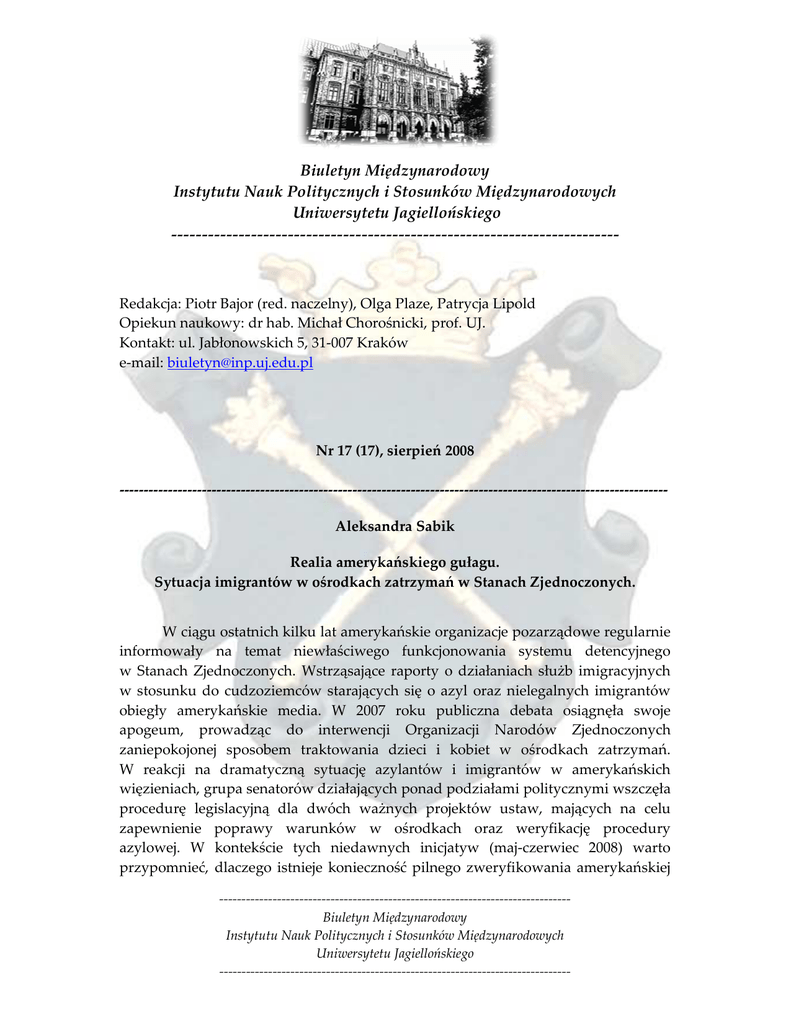 Biuletyn Międzynarodowy Instytutu Nauk Politycznych i Stosunków Międzynarodowych Uniwersytetu Jagiellońskiego ------------------------------------------------------------------------- Redakcja: Piotr Bajor (red. naczelny), Olga Plaze, Patrycja Lipold Opiekun naukowy: dr hab. Michał Chorośnicki, prof. UJ. Kontakt: ul. Jabłonowskich 5, 31-007 Kraków e-mail: [email protected] Nr 17 (17), sierpień 2008 ----------------------------------------------------------------------------------------------------------------Aleksandra Sabik Realia amerykańskiego gułagu. Sytuacja imigrantów w ośrodkach zatrzymań w Stanach Zjednoczonych. W ciągu ostatnich kilku lat amerykańskie organizacje pozarządowe regularnie informowały na temat niewłaściwego funkcjonowania systemu detencyjnego w Stanach Zjednoczonych. Wstrząsające raporty o działaniach służb imigracyjnych w stosunku do cudzoziemców starających się o azyl oraz nielegalnych imigrantów obiegły amerykańskie media. W 2007 roku publiczna debata osiągnęła swoje apogeum, prowadząc do interwencji Organizacji Narodów Zjednoczonych zaniepokojonej sposobem traktowania dzieci i kobiet w ośrodkach zatrzymań. W reakcji na dramatyczną sytuację azylantów i imigrantów w amerykańskich więzieniach, grupa senatorów działających ponad podziałami politycznymi wszczęła procedurę legislacyjną dla dwóch ważnych projektów ustaw, mających na celu zapewnienie poprawy warunków w ośrodkach oraz weryfikację procedury azylowej. W kontekście tych niedawnych inicjatyw (maj-czerwiec 2008) warto przypomnieć, dlaczego istnieje konieczność pilnego zweryfikowania amerykańskiej ------------------------------------------------------------------------------Biuletyn Międzynarodowy Instytutu Nauk Politycznych i Stosunków Międzynarodowych Uniwersytetu Jagiellońskiego ------------------------------------------------------------------------------- polityki imigracyjnej oraz przedstawić sytuację panującą w amerykańskich więzieniach, które przez jednego z amerykańskich komentatorów nazwane zostały „gułagiem”1. Obrońcy restrykcyjnej polityki imigracyjnej ignorują lub lekceważą doniesienia o łamaniu praw człowieka przez służby imigracyjne (U.S. Immigration and Customs Enforcement, ICE), mając na uwadze wyłącznie ochronę państwa przed ewentualnym atakiem terrorystycznym. Jednakże siedem lat po zamachu terrorystycznym na WTC działania policji imigracyjnej umykają standardom respektowania praw człowieka, konstytucyjnym wartościom i międzynarodowym zobowiązaniom Stanów Zjednoczonych. Rząd amerykański w ośrodkach zatrzymań przetrzymuje około 300 tysięcy osób rocznie, w tym całe rodziny, kobiety i dzieci. Należy zwrócić uwagę, że cudzoziemcy docierający do USA w poszukiwaniu azylu są w większości po traumatycznych przejściach, potrzebują nie tylko opieki socjalnej, ale też wsparcia psychologicznego. W tym kontekście zasada obowiązkowego zatrzymania nieudokumentowanych imigrantów – w tym osób uchodzących przed prześladowaniami – po przekroczeniu tzw. portów wejścia (przejście graniczne, port lotniczy, port morski) jest wysoce wątpliwa ze względu na możliwości starania się o azyl oraz przyszłą integrację. Warunki pobytu osób starających się o azyl w ośrodkach zatrzymań pozostają dalekie od oczekiwanych minimalnych standardów, w tym międzynarodowych zasad ochrony uchodźców. Najważniejsze zarzuty w funkcjonowaniu ośrodków zatrzymań można odnieść m. in. do warunków lokalowych, zachowania personelu ośrodków i więzień, opieki medycznej, kontaktów ze światem zewnętrznym – w tym dostępie do pomocy prawnej oraz tłumacza. Ponadto, trzeba szczególnie podkreślić pozycję kobiet i dzieci, którzy dotkliwie odczuwają surowe warunki pobytu w zamknięciu. Kobiety narażone są na różne nadużycia (natury psychologicznej i fizycznej), natomiast amerykański system detencyjny przez swoje niedociągnięcia, nie daje możliwości ich zapobiegania. Już w momencie przekraczania granicy zawodzą nie tylko standardy ustanowione przepisami prawa, ale też zdrowy rozsądek oraz humanitaryzm urzędników ICE. Obowiązkowe zatrzymanie osób starających się o azyl w momencie przekraczania granicy stało się regułą, choć ustawodawca sugerował podjęcie takich działań w wyjątkowych sytuacjach. Stanowi to wypaczenie racjonalnych działań na rzecz bezpieczeństwa państwa, gdyż pozbawiane wolności są osoby, które nie stanowią zagrożenia, wręcz przeciwnie – ubiegają się o ochronę przed prześladowaniami. Przesłuchanie, transport 1 Dow M., American Gulag. Inside U.S. immigration prisons, University of California Press 2005. ------------------------------------------------------------------------------Biuletyn Międzynarodowy Instytutu Nauk Politycznych i Stosunków Międzynarodowych Uniwersytetu Jagiellońskiego ------------------------------------------------------------------------------- w kajdankach, brak poszanowania różnic kulturowych mają wpływ na pogłębianie się traumy u cudzoziemców. Bolesne doświadczenia z przeszłości, w konfrontacji z zimnym i przedmiotowym traktowaniem, pogłębiają zespół stresu pourazowego wśród zatrzymanych. Obawa przed dalszym poniżaniem oraz niepewność, co do przyszłości, często powoduje zarzucenie starań o uzyskanie azylu i powrót do kraju pochodzenia, gdzie nadal występuje ryzyko prześladowań. Badania przeprowadzone przez organizacje pozarządowe wśród uchodźców potwierdzają instrumentalne traktowanie przez pracowników w większości analizowanych przypadków. Najczęstsze formy takich zachowań to brak poszanowania godności człowieka przez ubliżające (także rasistowskie) wypowiedzi i gesty, nieadekwatne stosowanie metod dyscyplinarnych, w wypadkach skrajnych (przypadek Krome Service Processing Center – ośrodka dla imigrantów w Miami) molestowanie seksualne lub prz